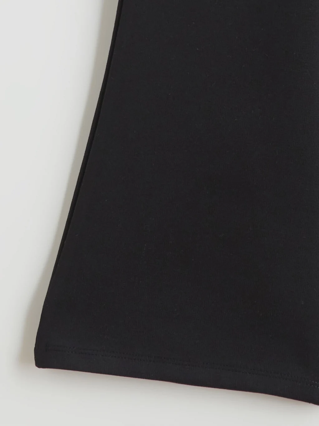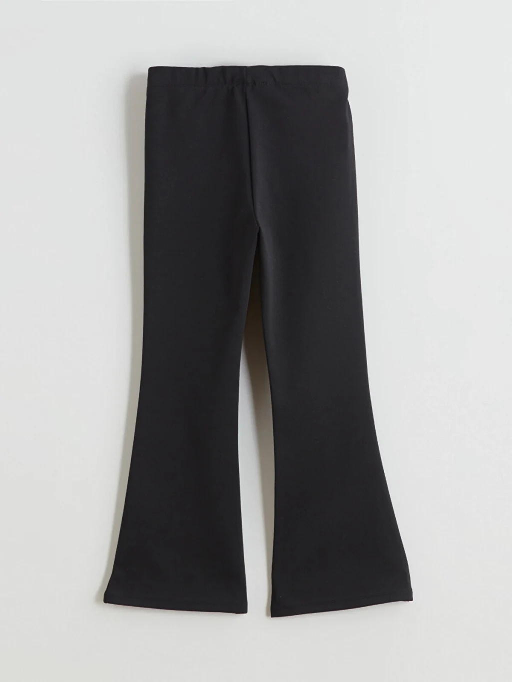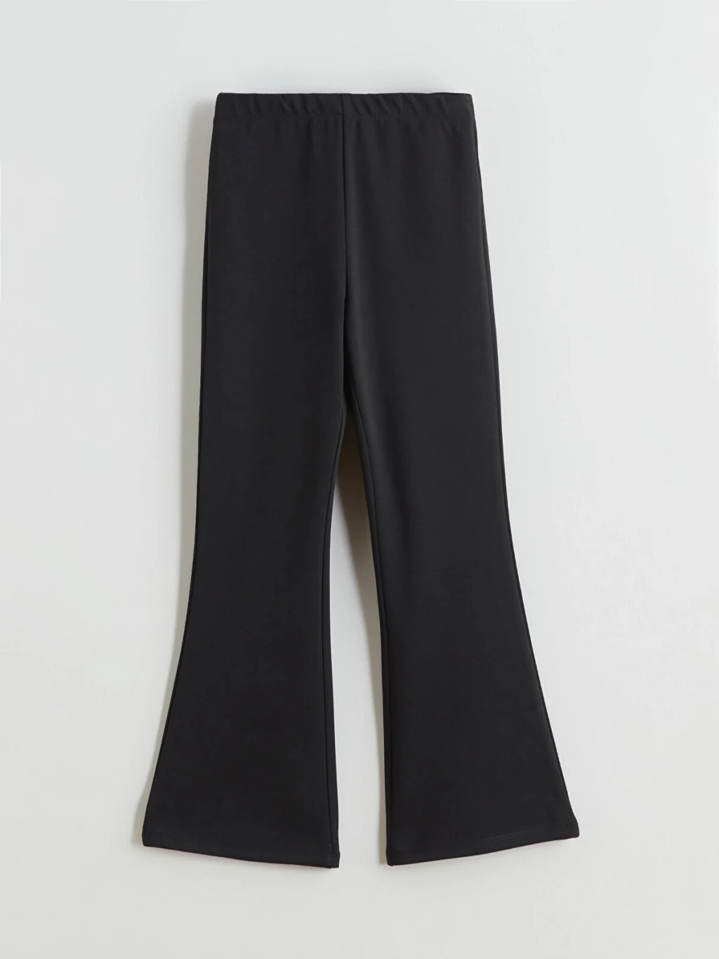 Beli lastikli ve desensiz kız çocuk tayt, dizden itibaren genişleyerek inen bir paça kesimine sahiptir.