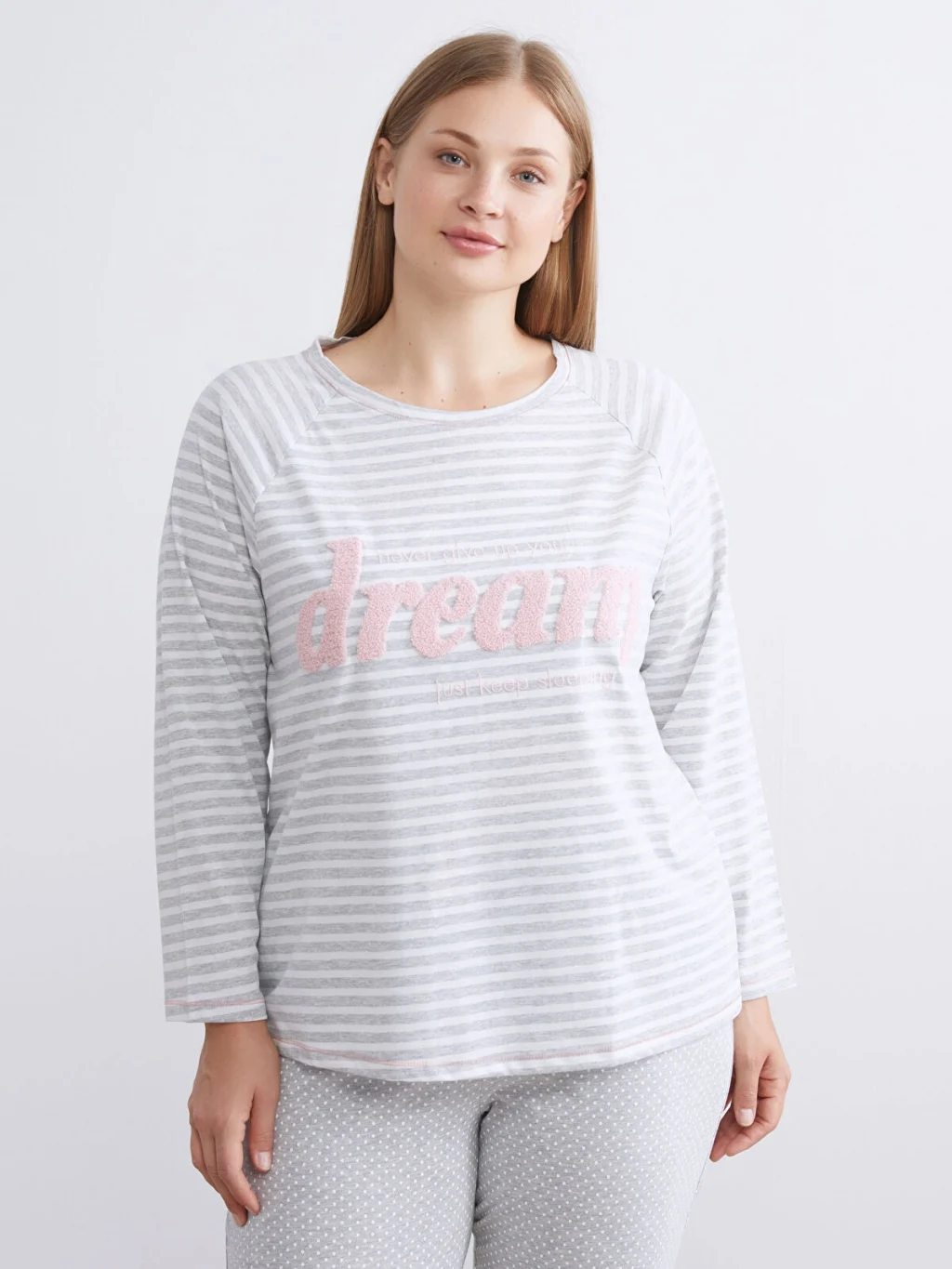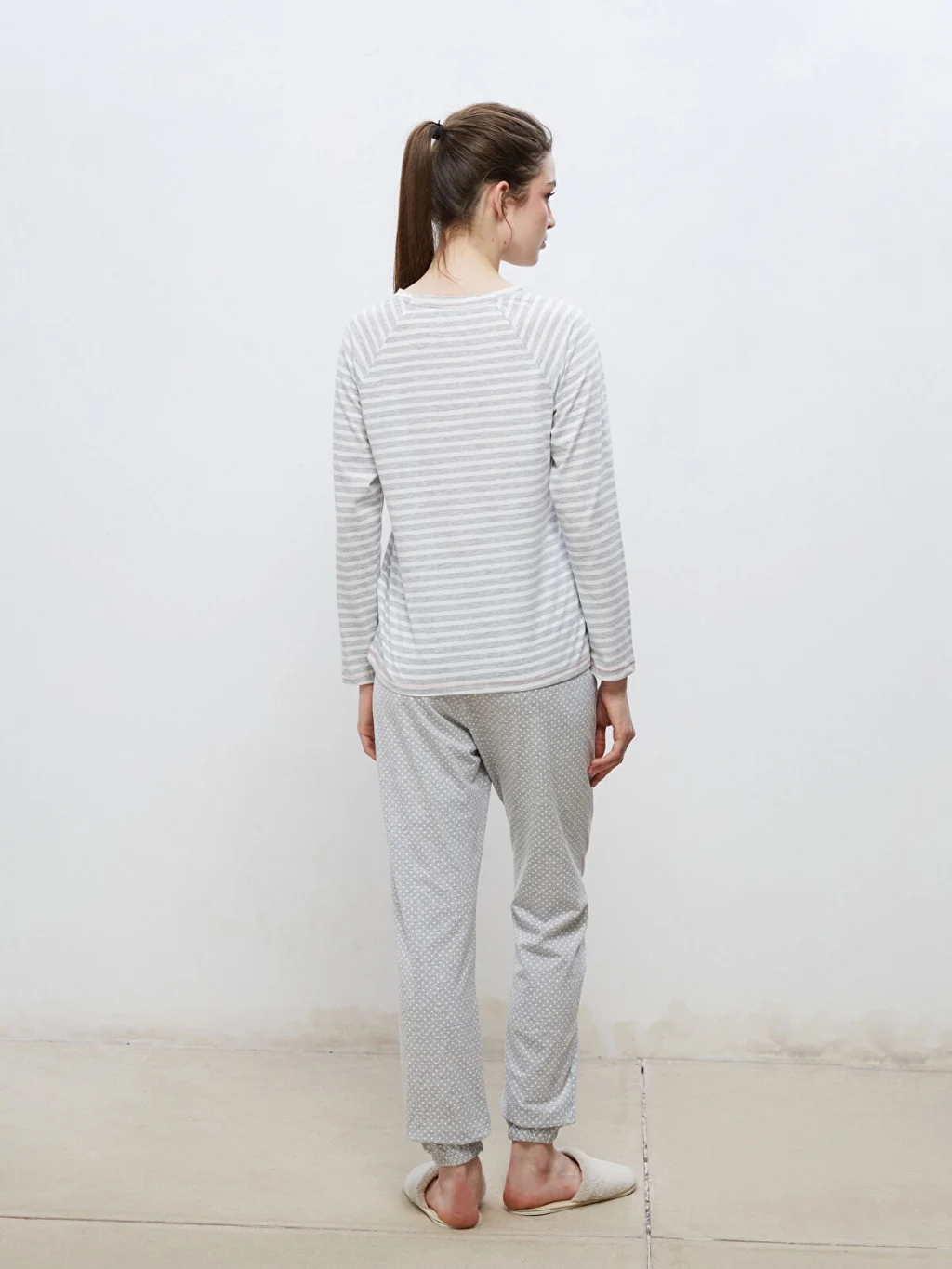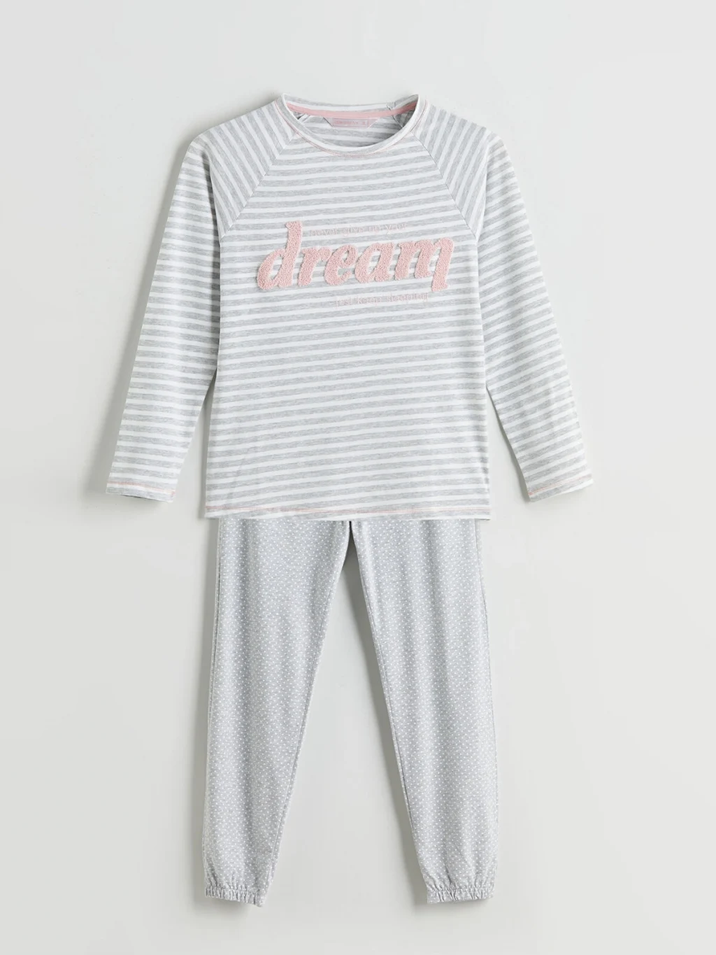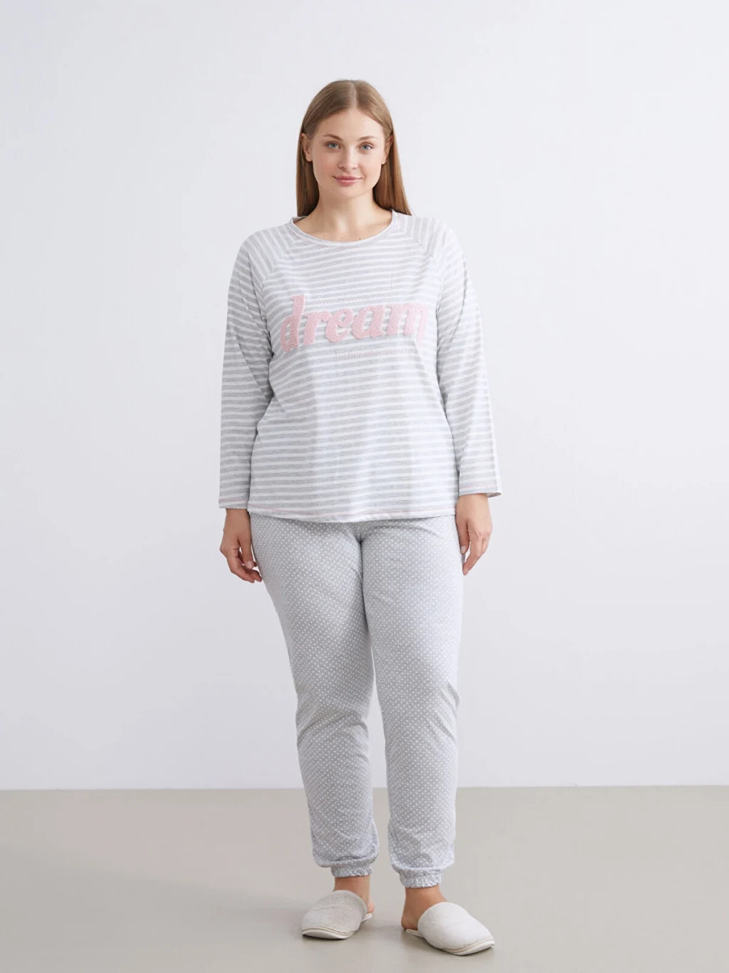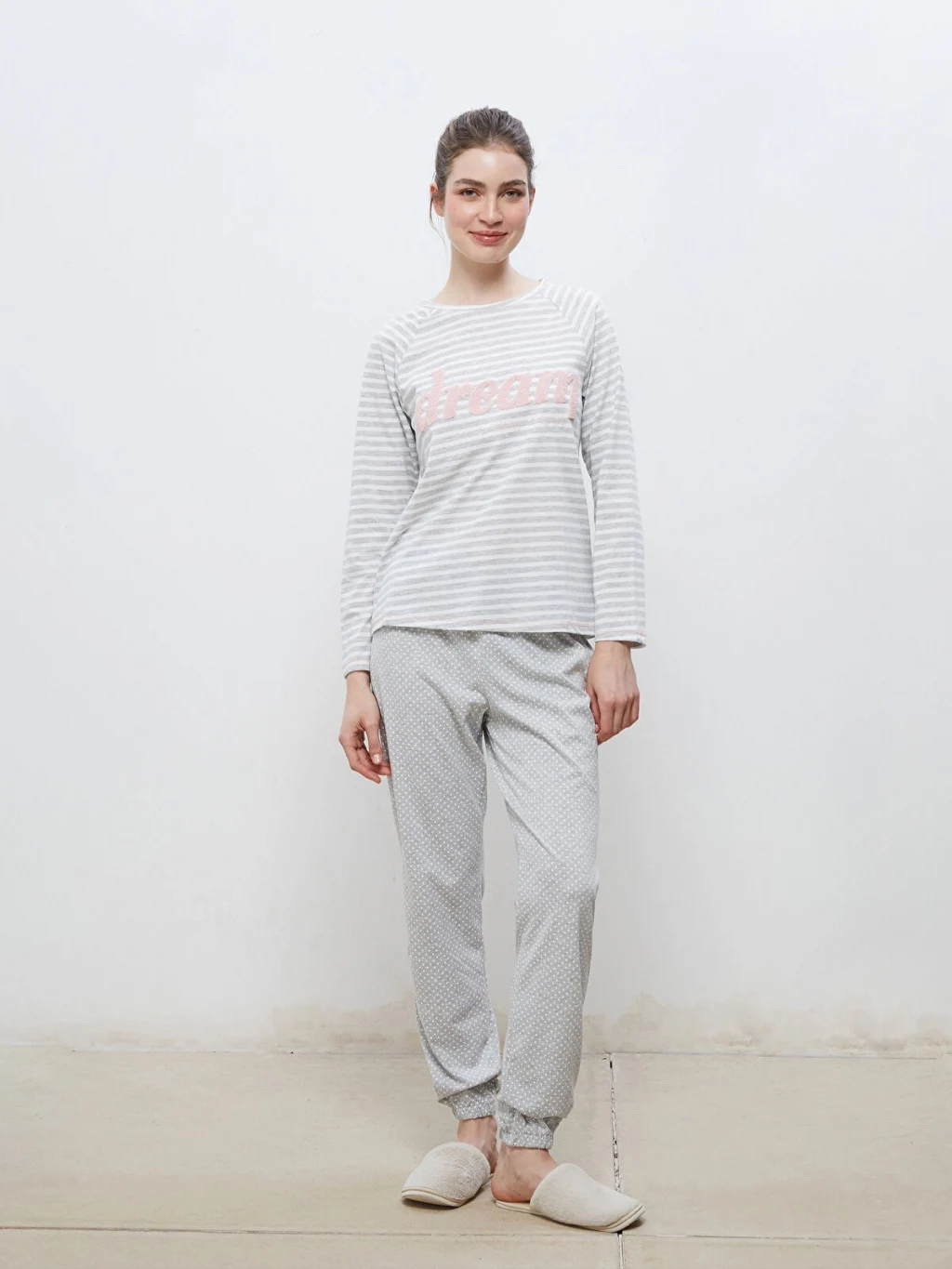 Kadın pijama takımı, bisiklet yaka nakışlı, çizgili, uzun kollu pijama üstü ve beli lastikli puantiyeli jogger pijama altından oluşur. Süprem kumaştan üretilmiştir.