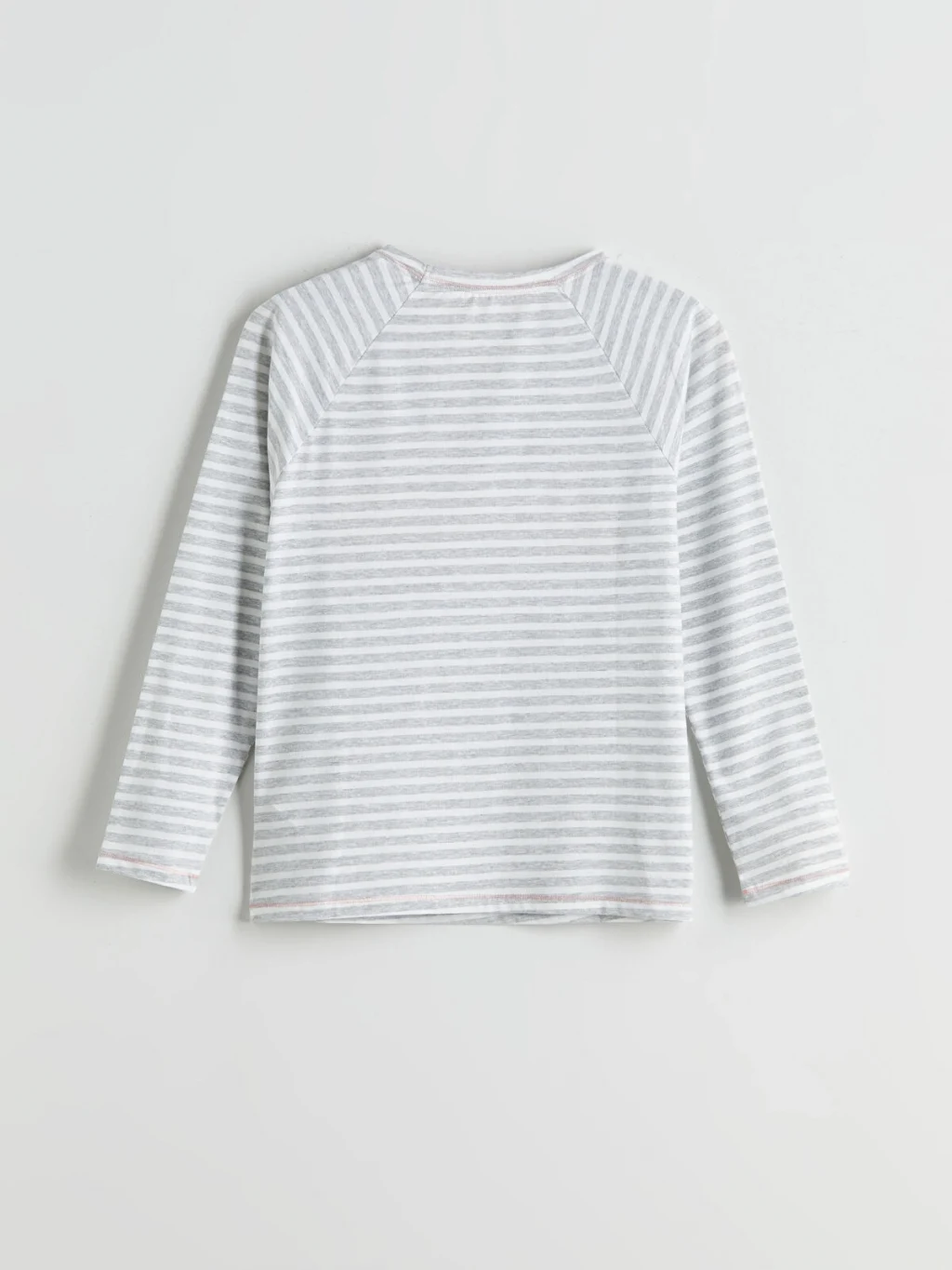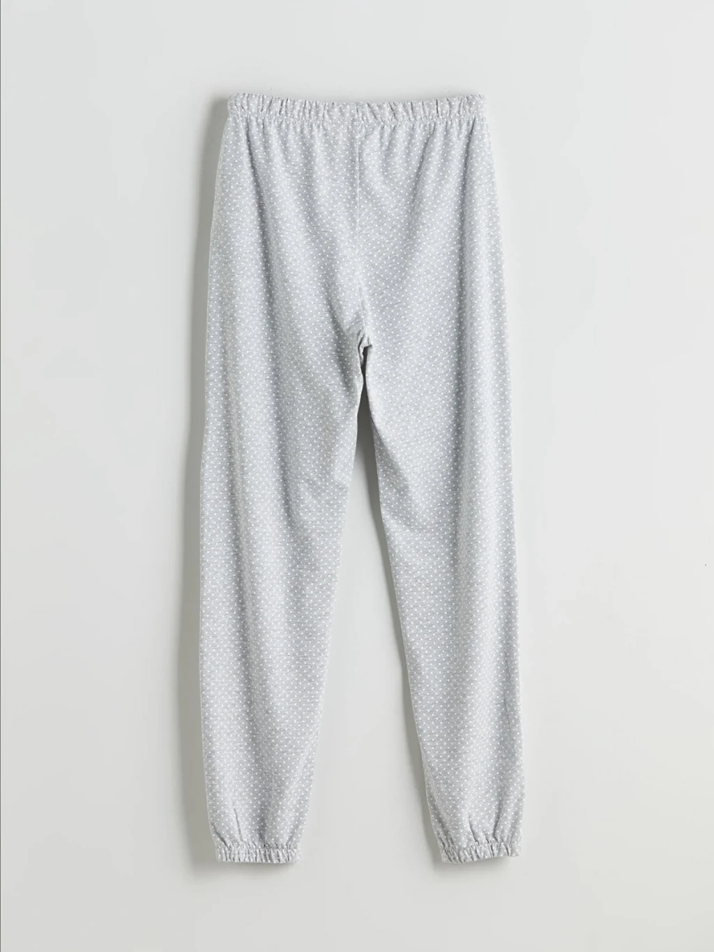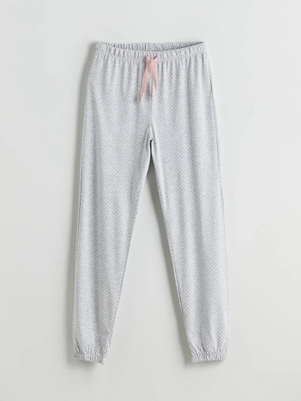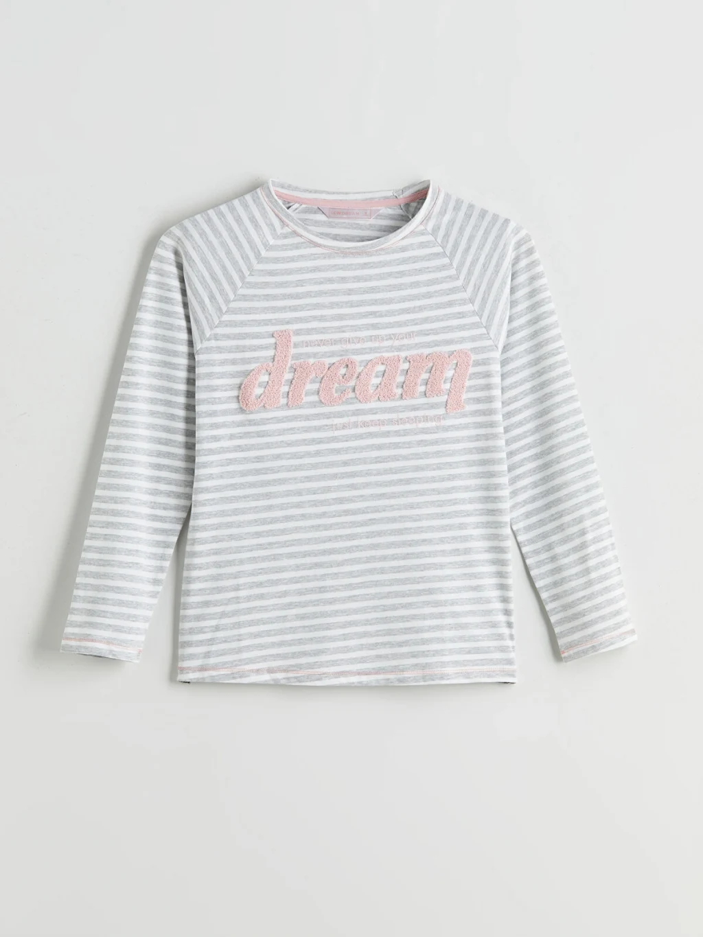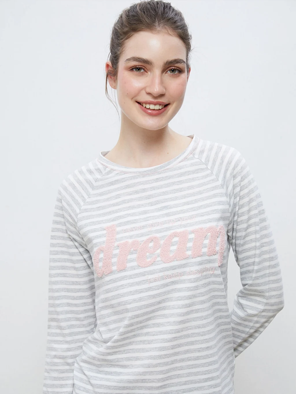 Kadın pijama takımı, bisiklet yaka nakışlı, çizgili, uzun kollu pijama üstü ve beli lastikli puantiyeli jogger pijama altından oluşur. Süprem kumaştan üretilmiştir.