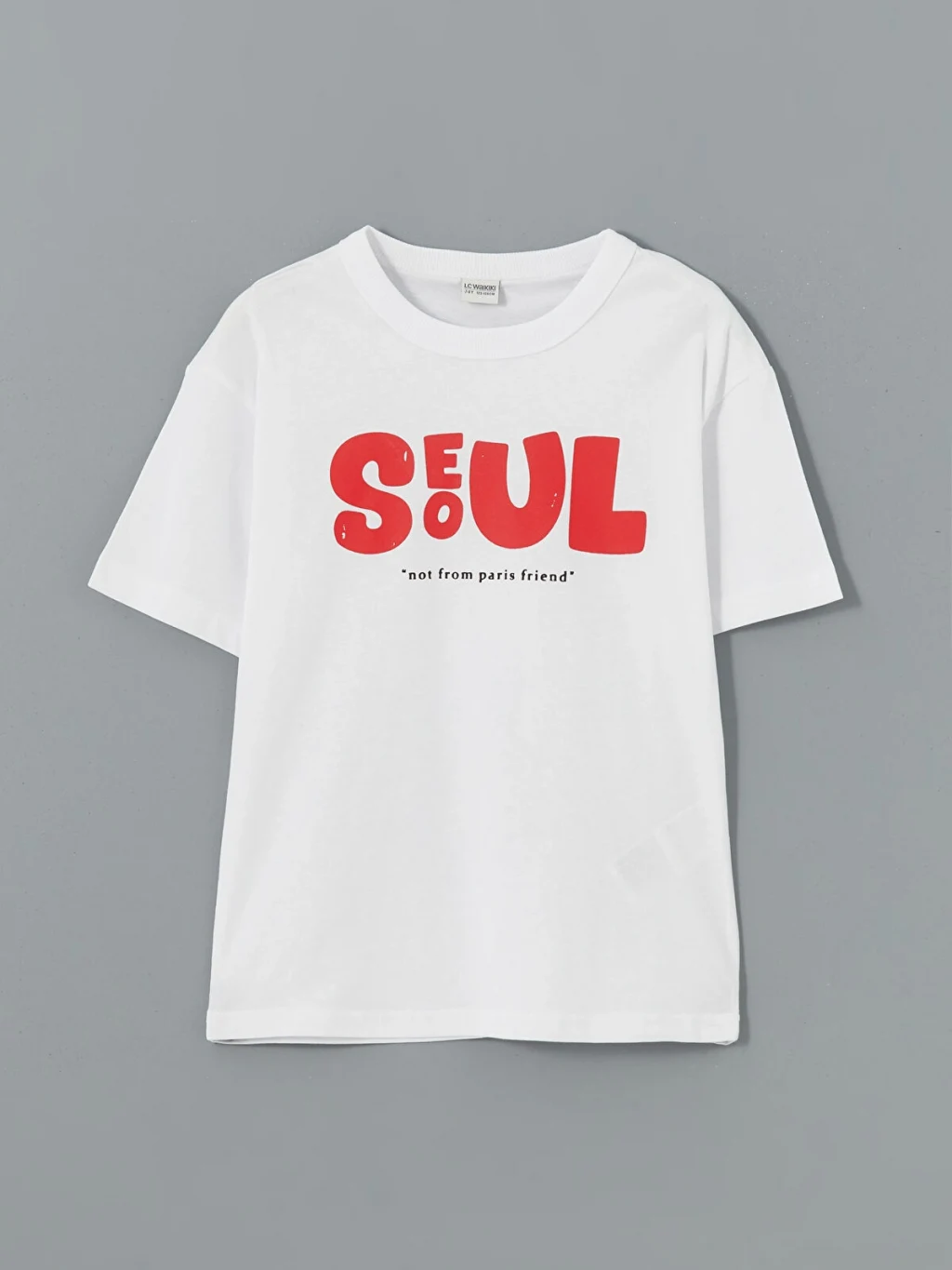 Standart kalıp erkek çocuk tişört, %100 pamuklu penye kumaştan üretilmiştir. Bisiklet yaka, kısa kollu ve önü yazı baskılıdır.