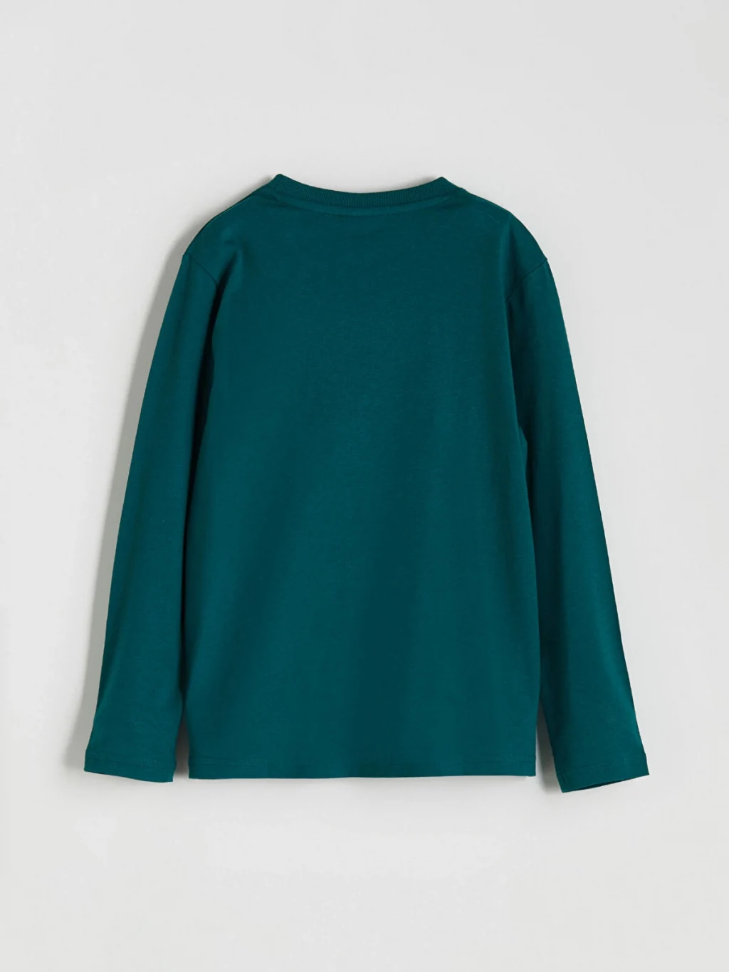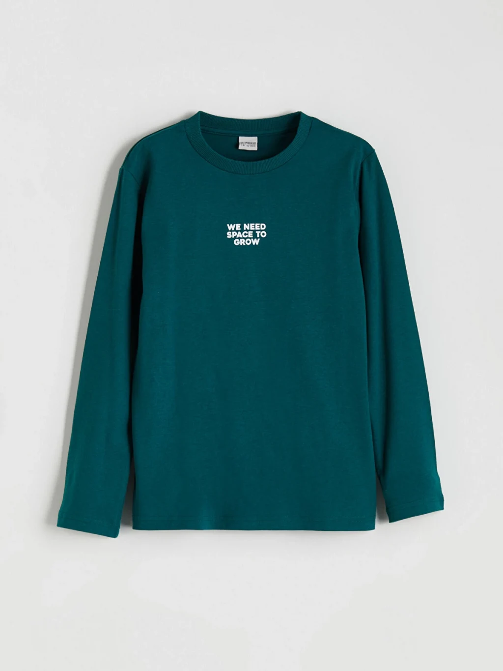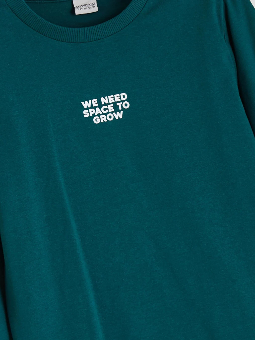 Bisiklet yaka yazı baskılı tişört, pamuklu penye kumaştan üretilmiştir. Uzun kolludur.