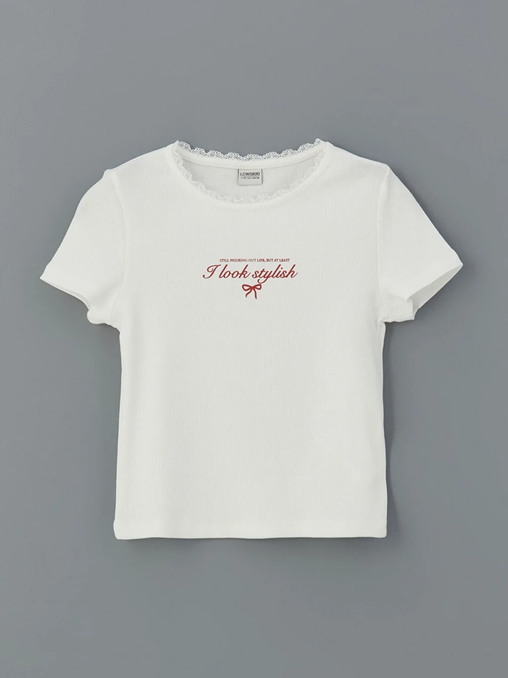 Yüksek pamuk içerikli kaşkorse kumaştan üretilen dar kalıplı kız çocuk tişört, dantel detaylı bisiklet yakalı, kısa kollu ve önü baskılıdır.