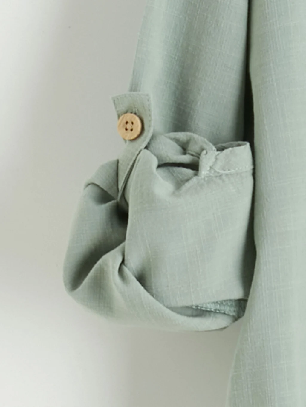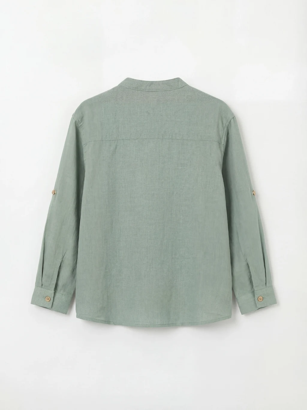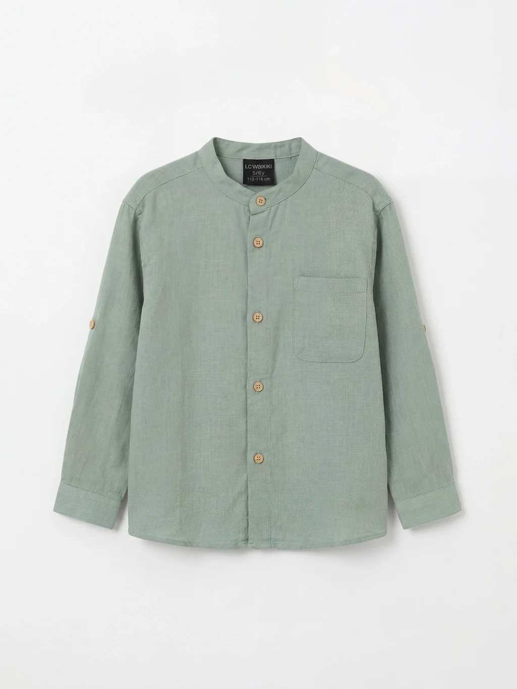 Hakim yaka, uzun kollu erkek çocuk gömlek, önden düğme kapamalıdır. Tek göğüs ceplidir ve kolları katlanabilir.