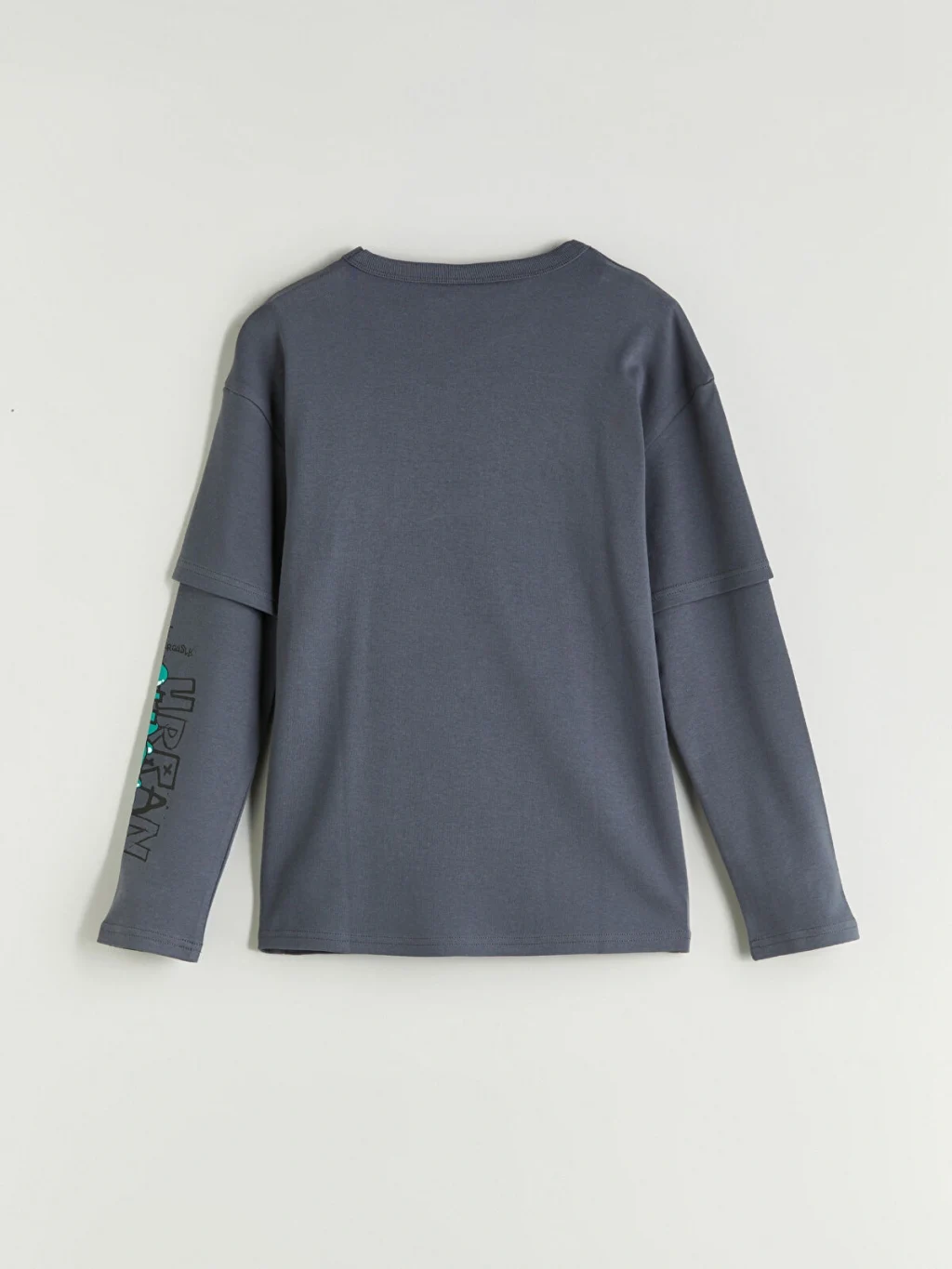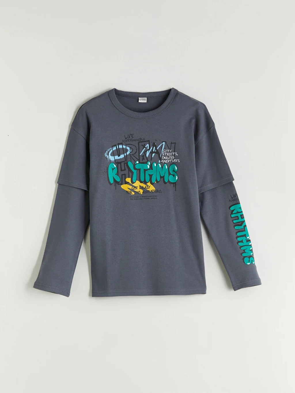 Standart kalıp erkek çocuk tişört, bisiklet yakalı ve uzun kolludur. İki parça görünümlü modelin önü ve kolu baskılıdır, interlok kumaşa sahiptir.