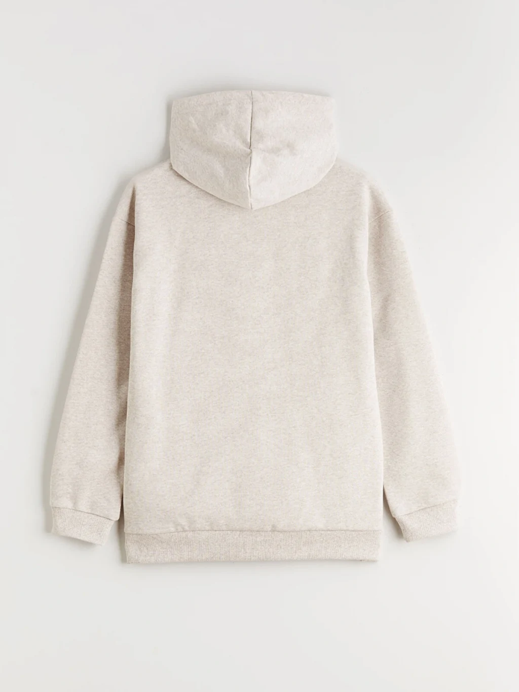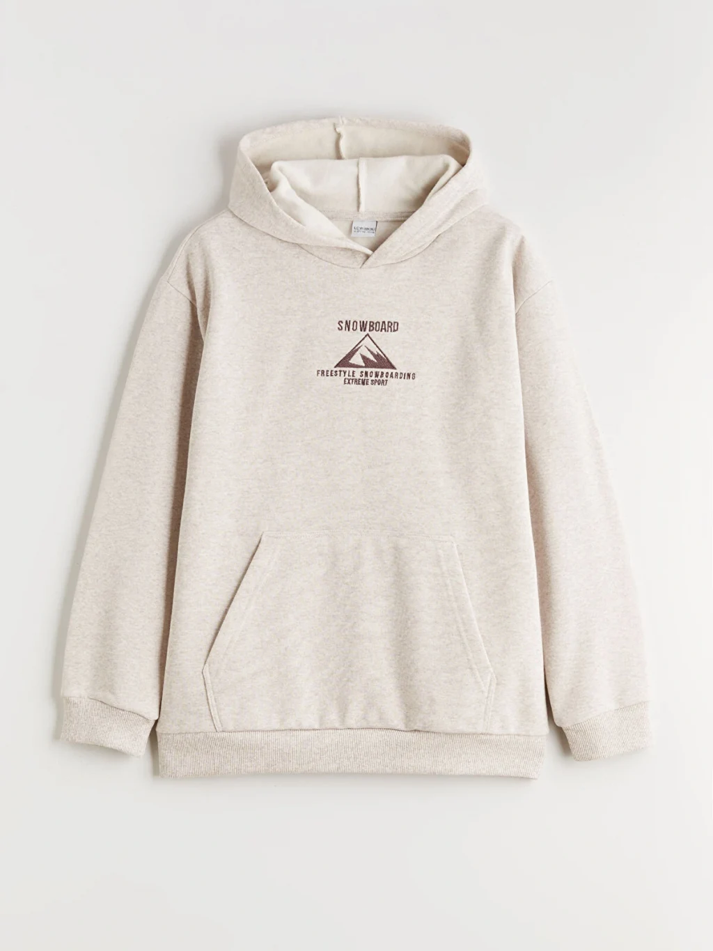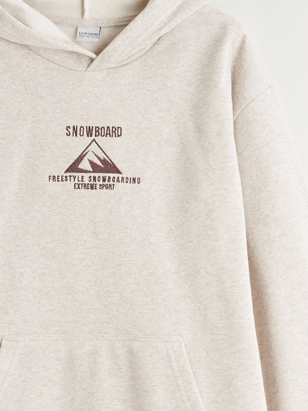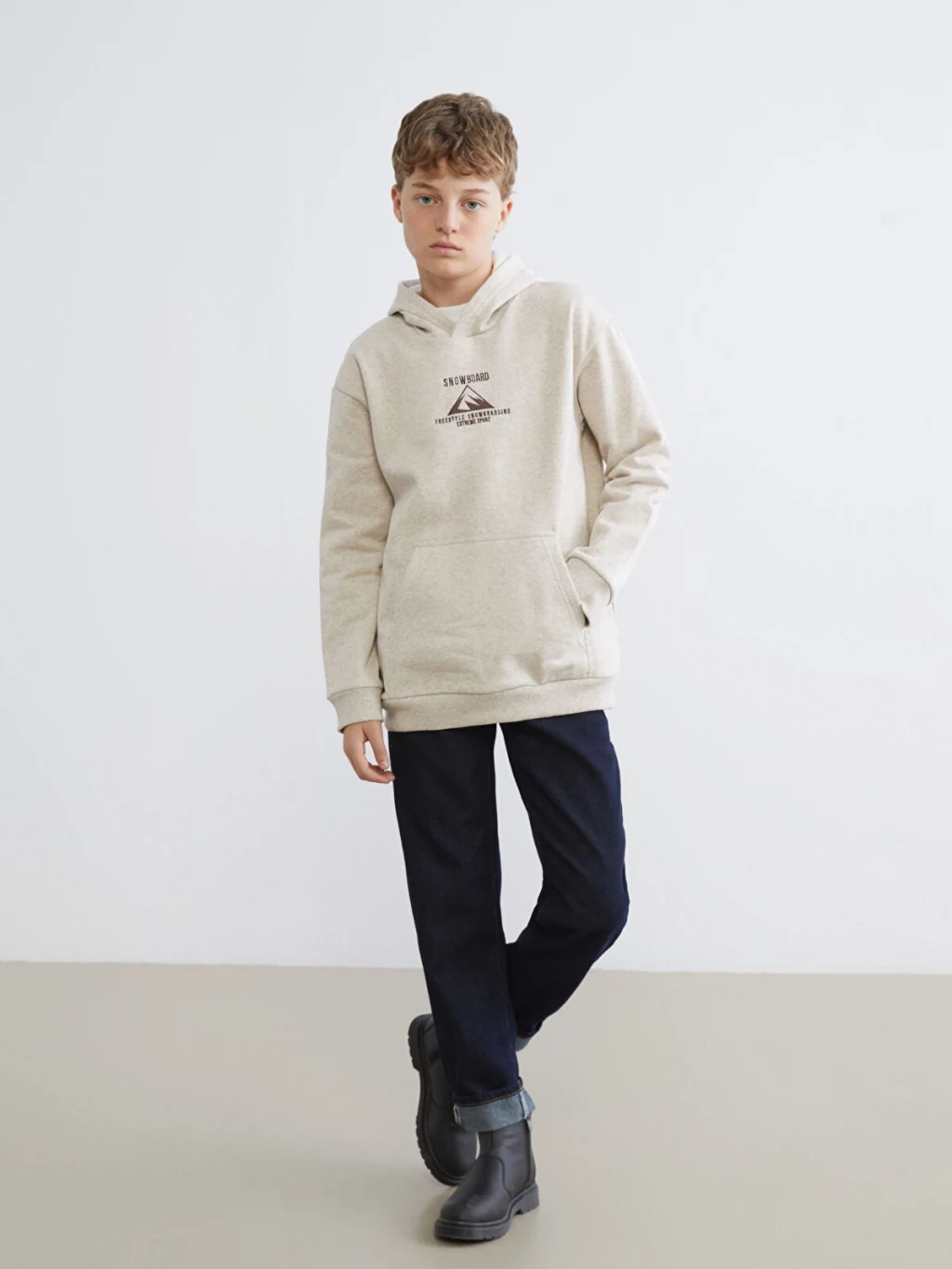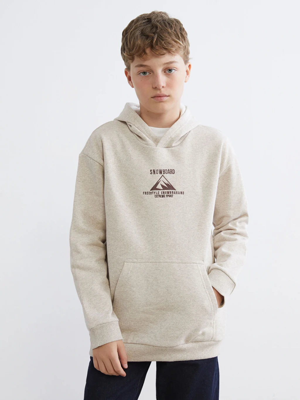 3 iplik şardonlu kumaştan üretilen kapüşonlu erkek çocuk sweatshirt, uzun kollu ve kanguru ceplidir. Önü baskılıdır.