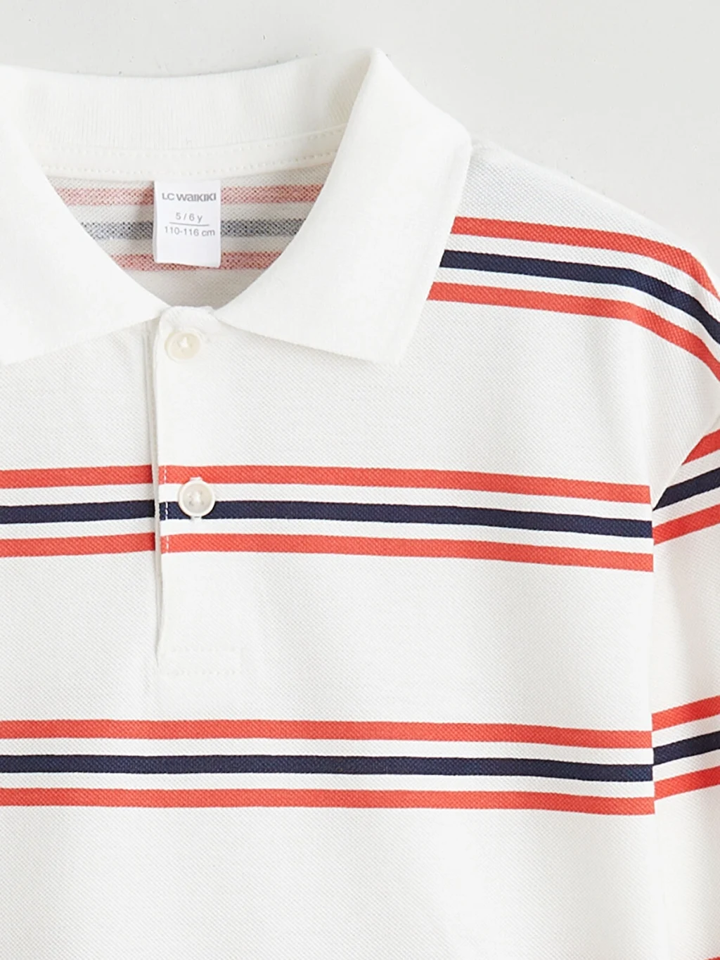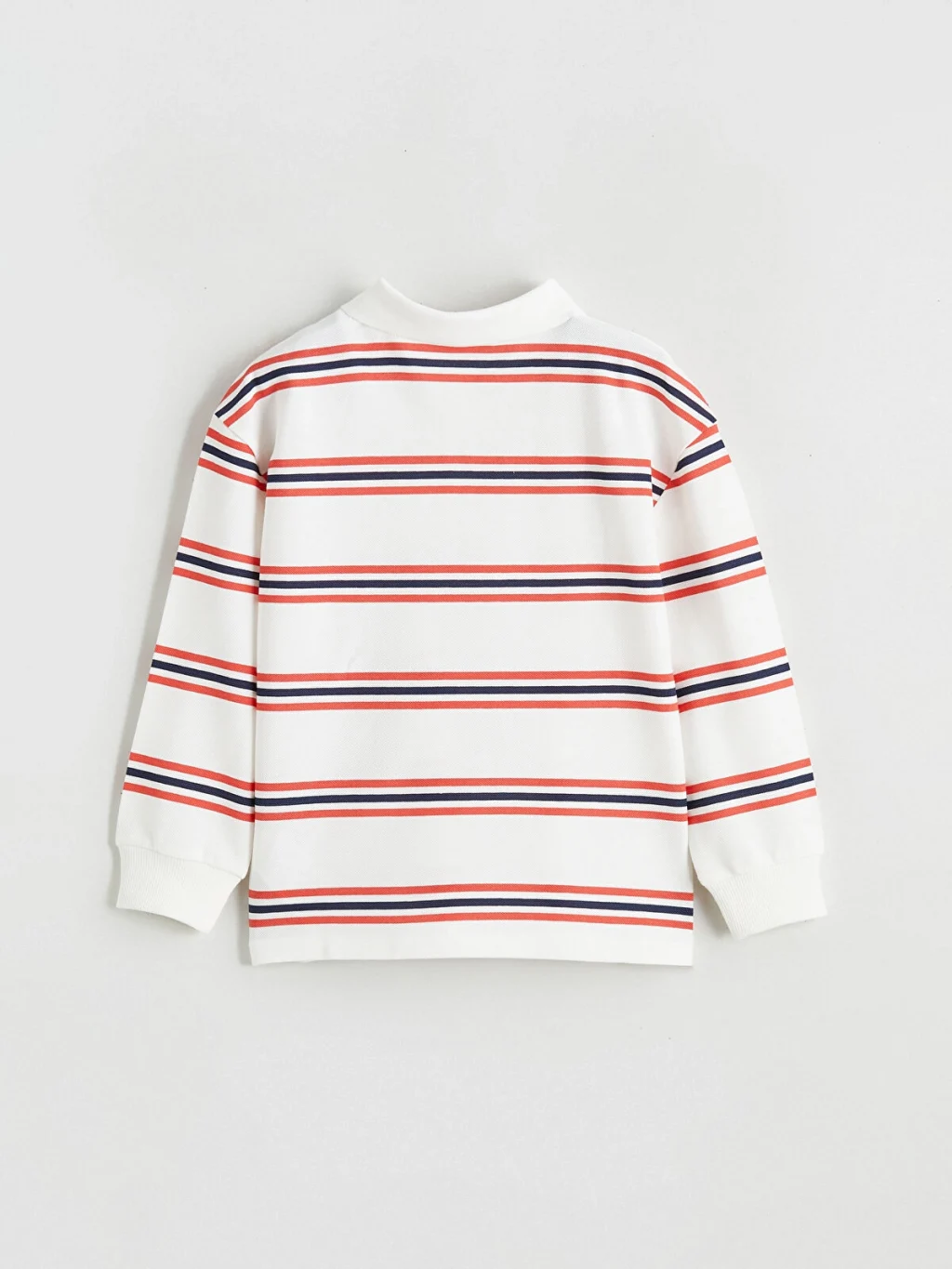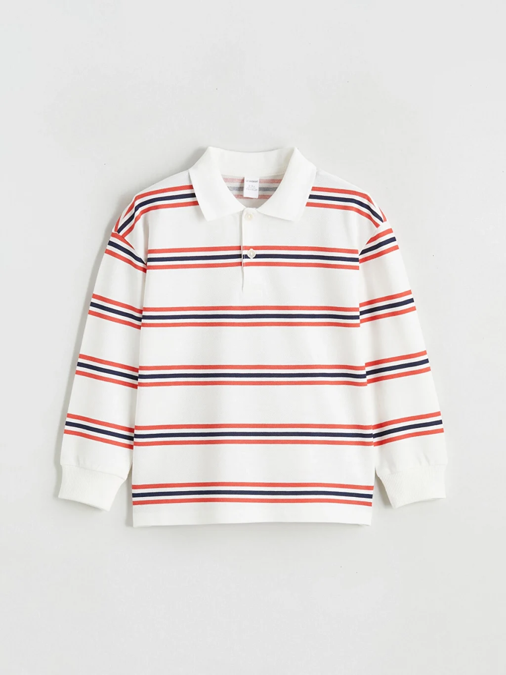 Polo yakalı ve uzun kollu erkek çocuk tişört, çizgili desenlidir. Önü düğme kapamalıdır, kol uçları ribana detaylıdır.