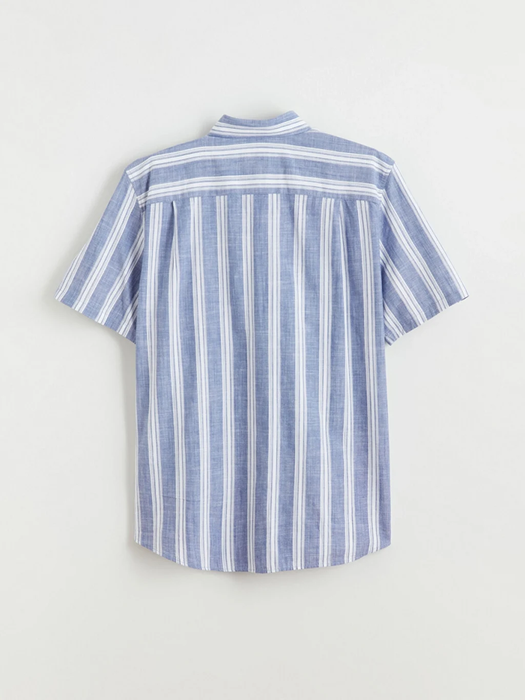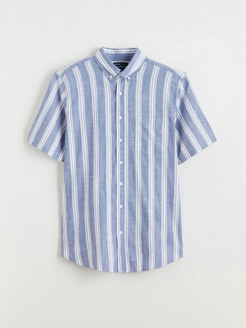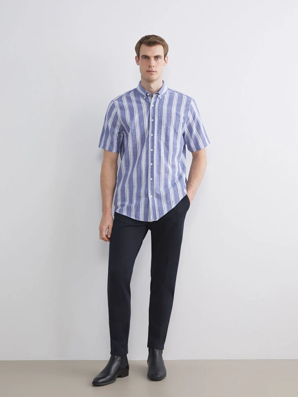 Keten karışımlı kumaştan üretilmiş, dikey çizgili erkek gömlek, gömlek yakalı ve kısa kolludur. Önden düğme kapamalıdır ve göğüs cebi bulunur.