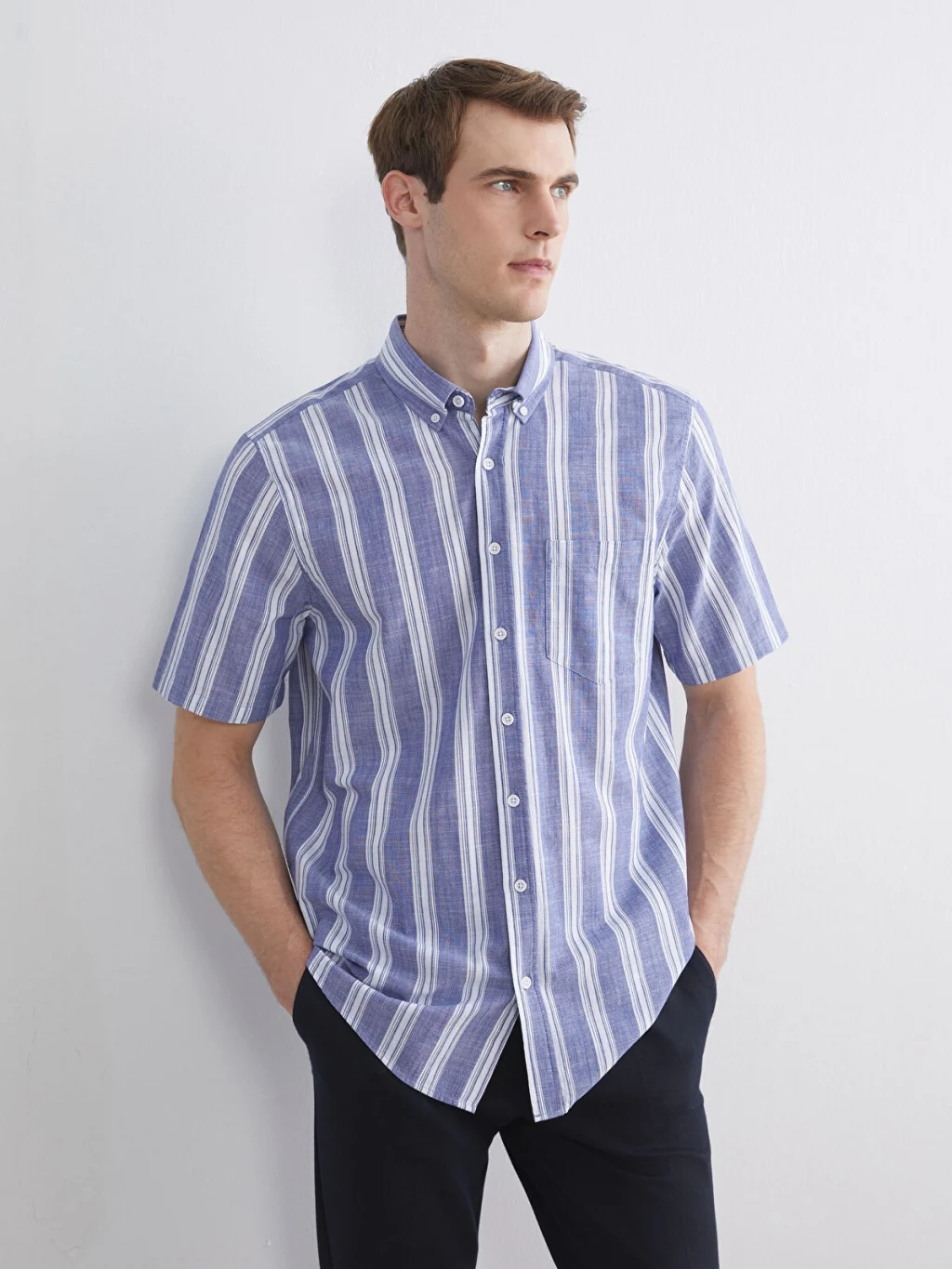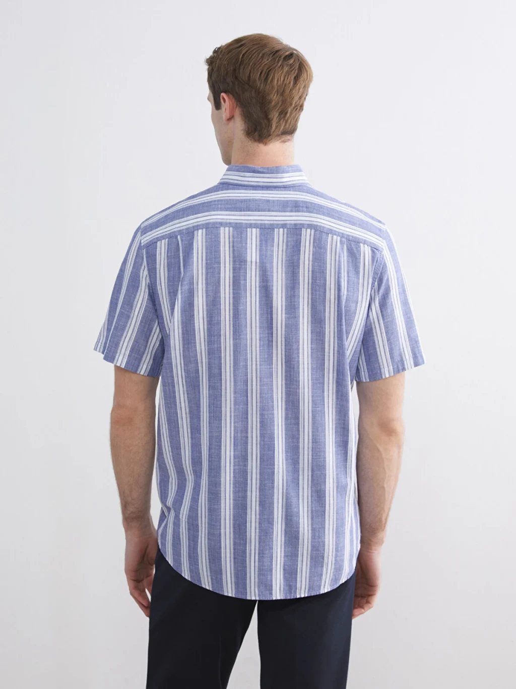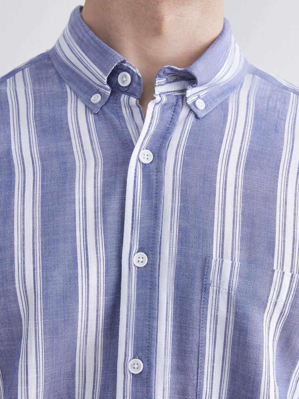 Keten karışımlı kumaştan üretilmiş, dikey çizgili erkek gömlek, gömlek yakalı ve kısa kolludur. Önden düğme kapamalıdır ve göğüs cebi bulunur.