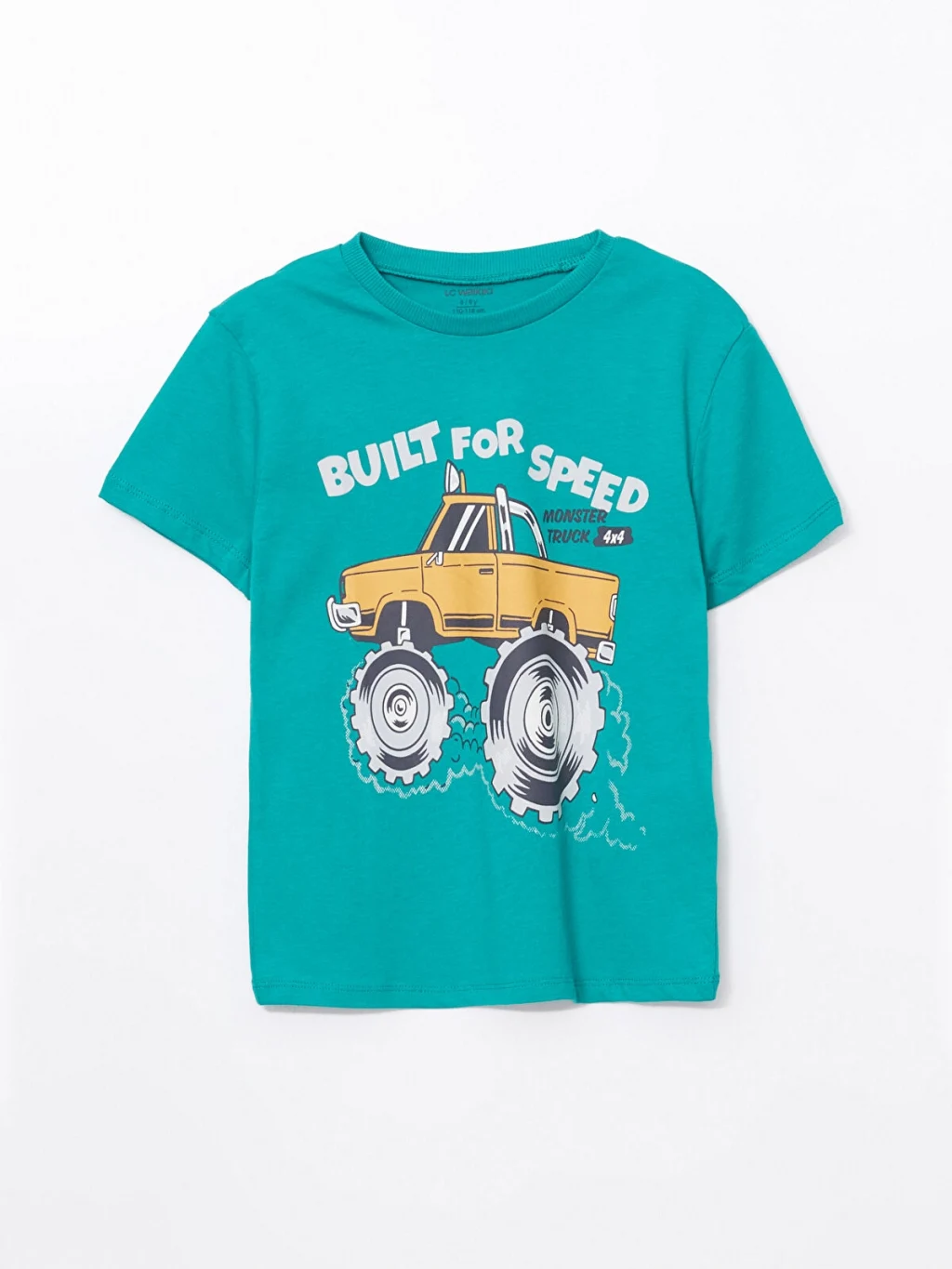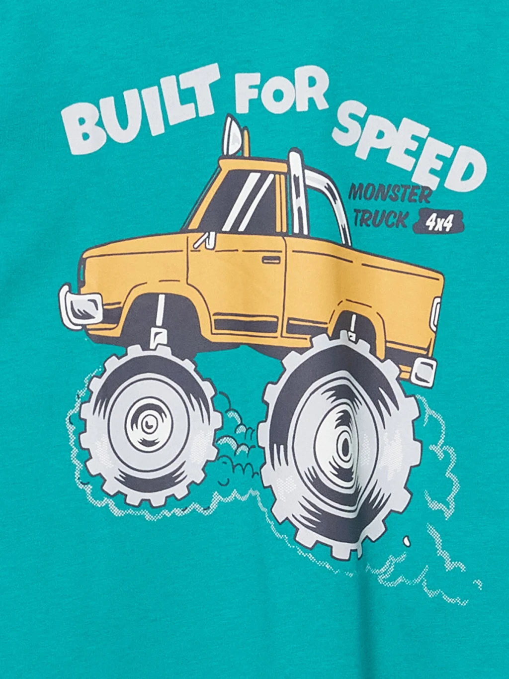 Bisiklet yaka, kısa kollu erkek çocuk tişört, %100 pamuklu penye kumaştan üretilmiştir. Ön yüzü canavar kamyon ve yazı baskılıdır.