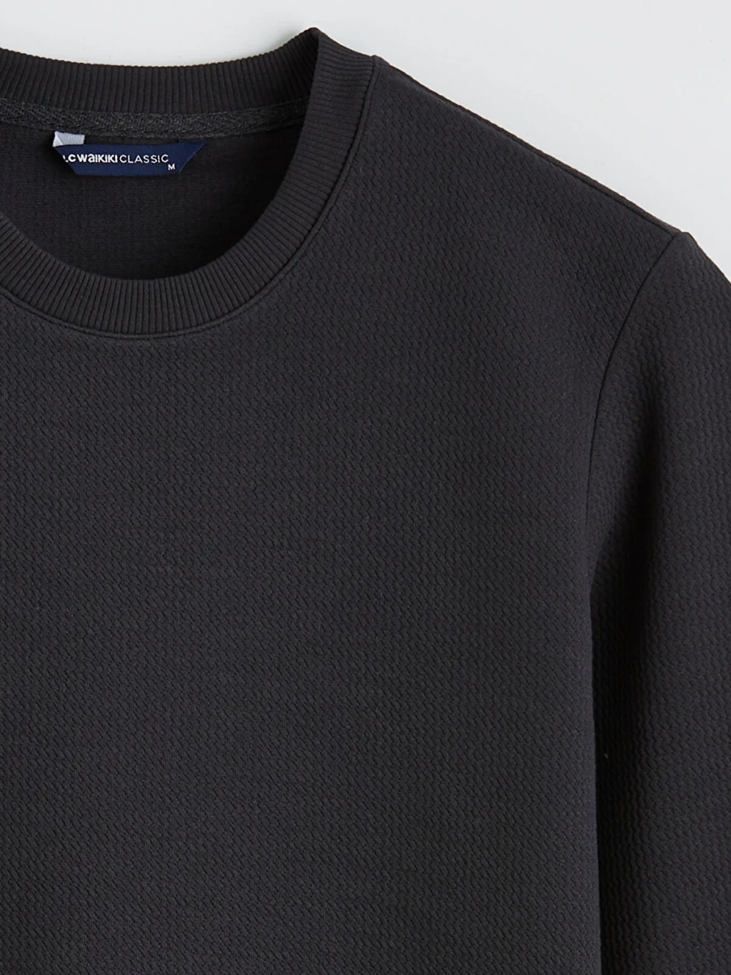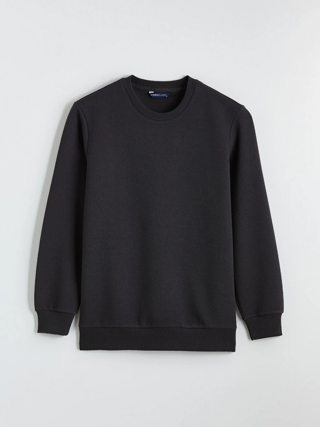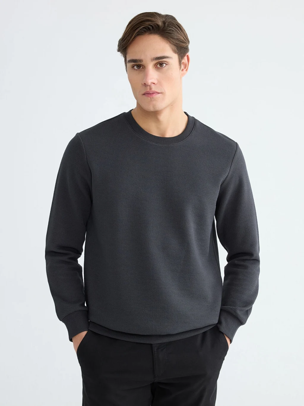 Bisiklet yaka, uzun kollu erkek sweatshirt, strüktürlü kumaştan üretilmiştir. Kol uçları ve etek ucu ribanalıdır.