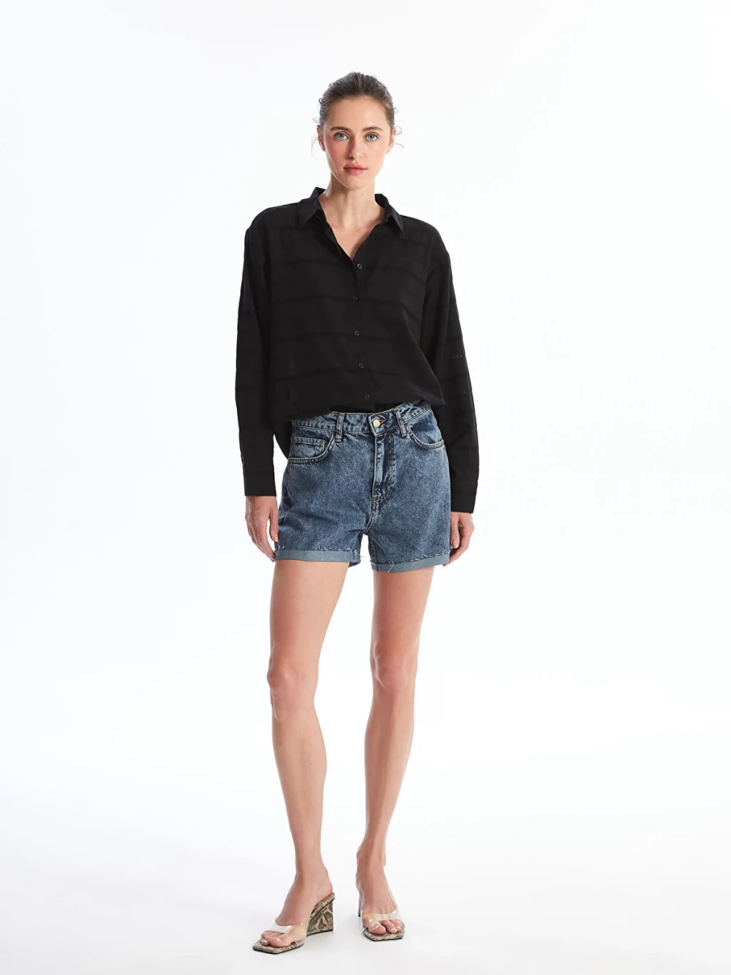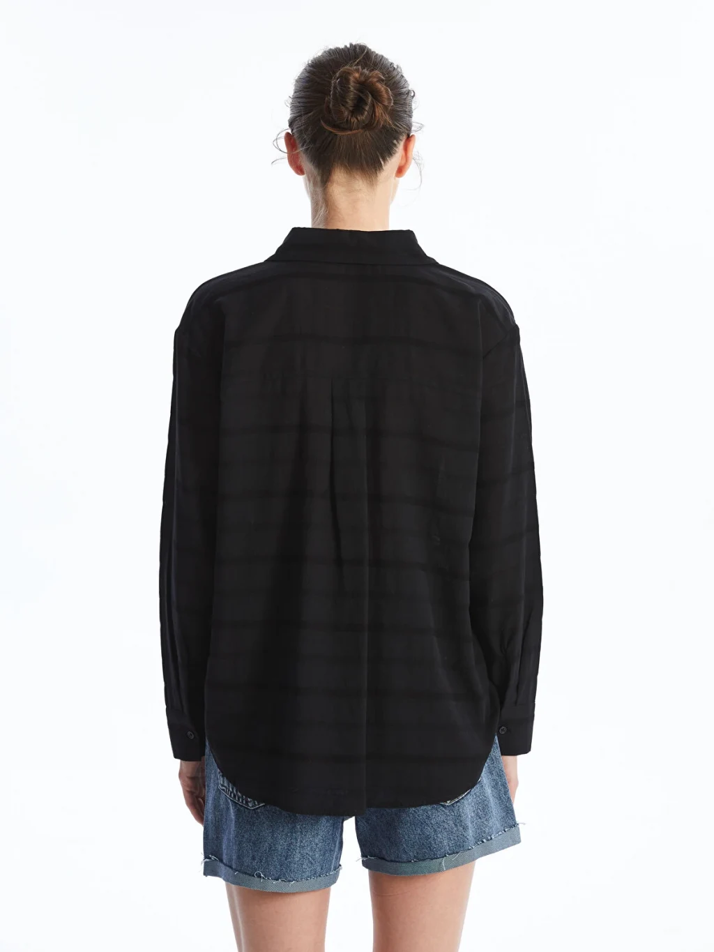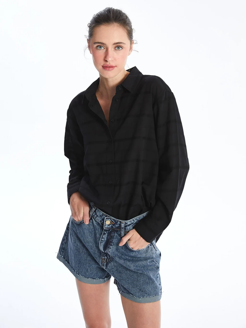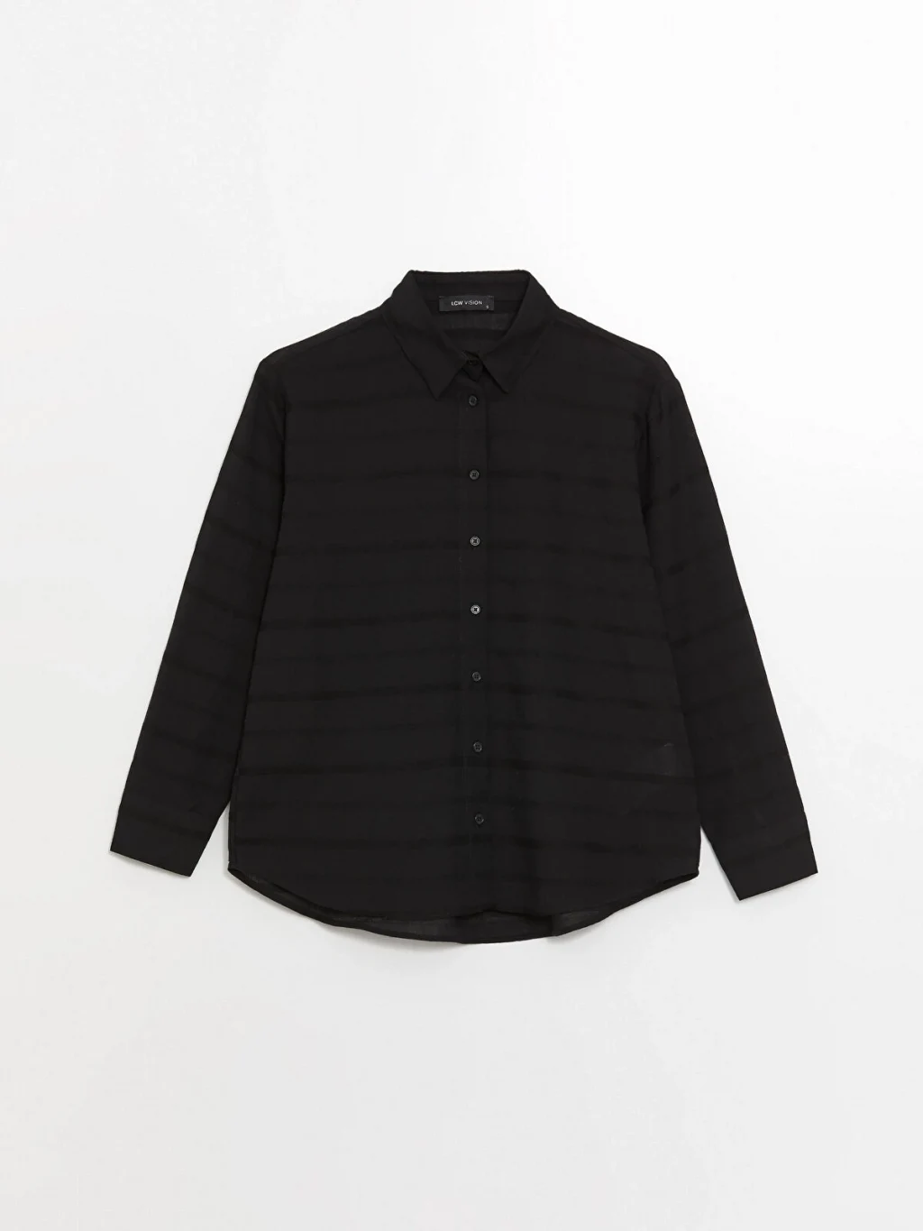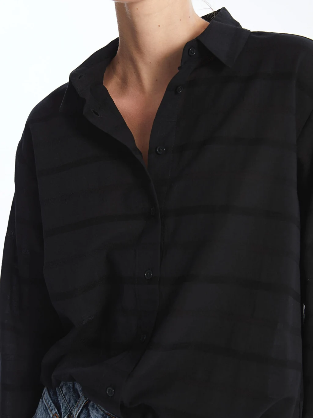 Kendinden desenli uzun kollu oversize gömlek, dayanıklı armürlü kumaştan üretilmiştir. Kumaşın kendine özgü dokusunda oluşan çizgili silüeti bulunur. Giyinme kolaylığı sağlamak için önden düğme kapamalıdır.