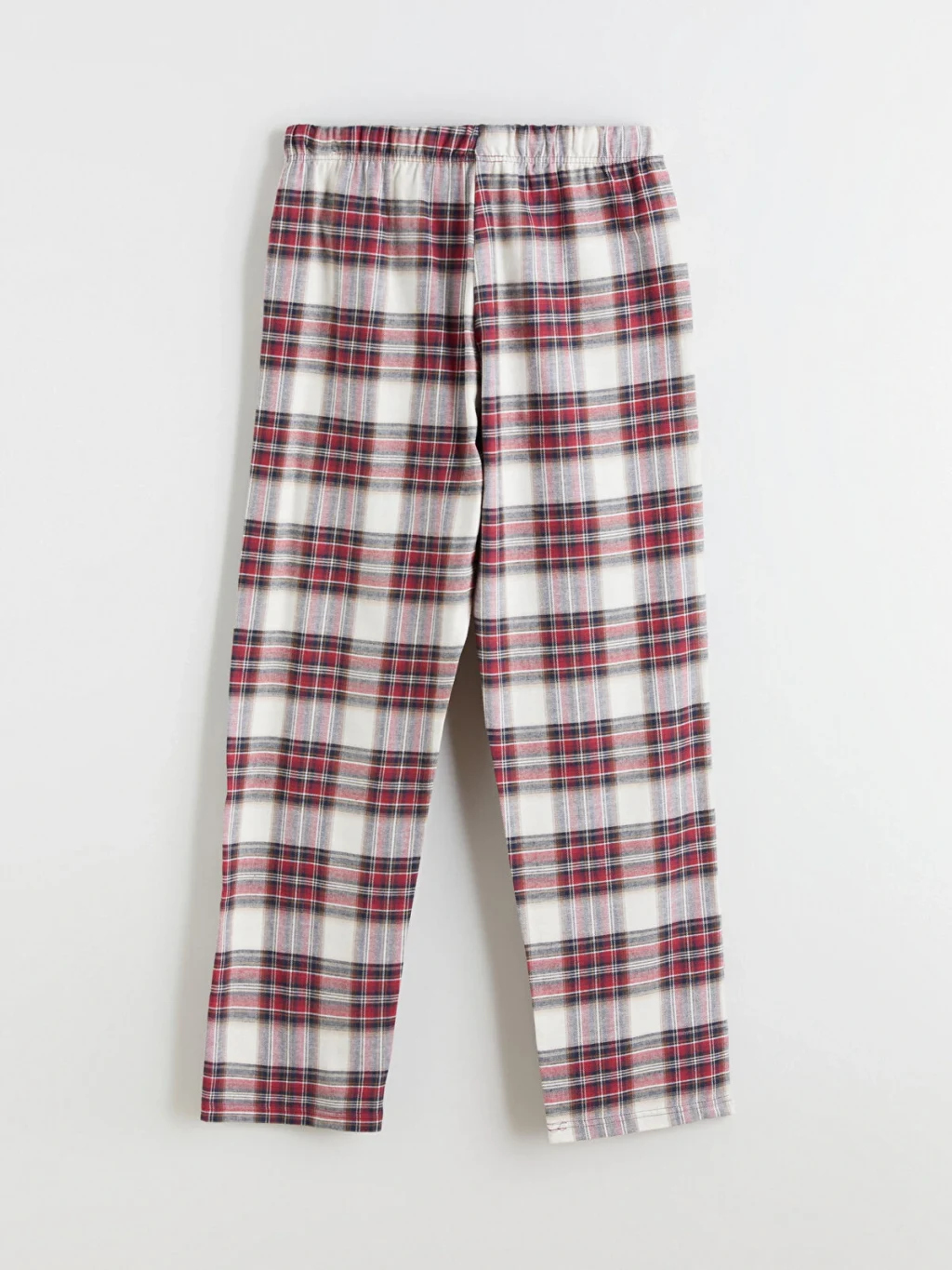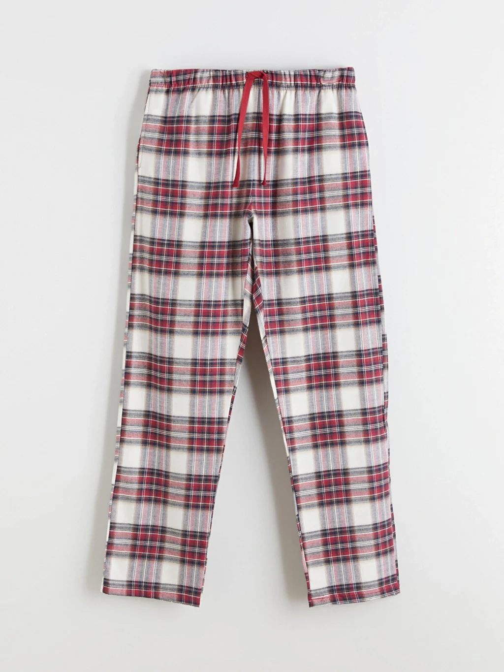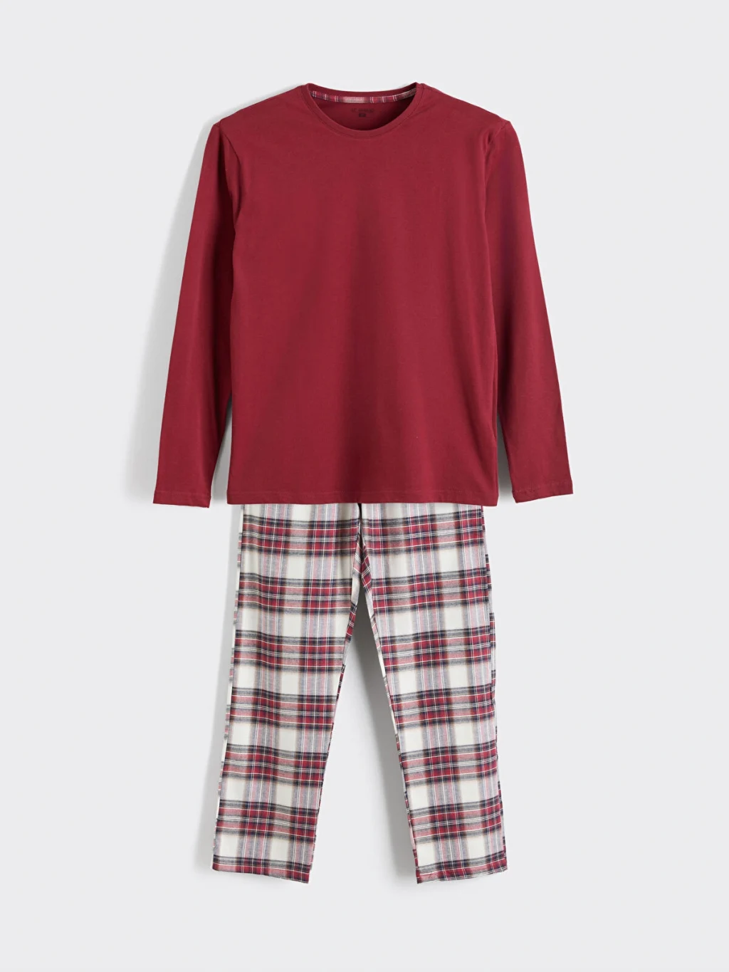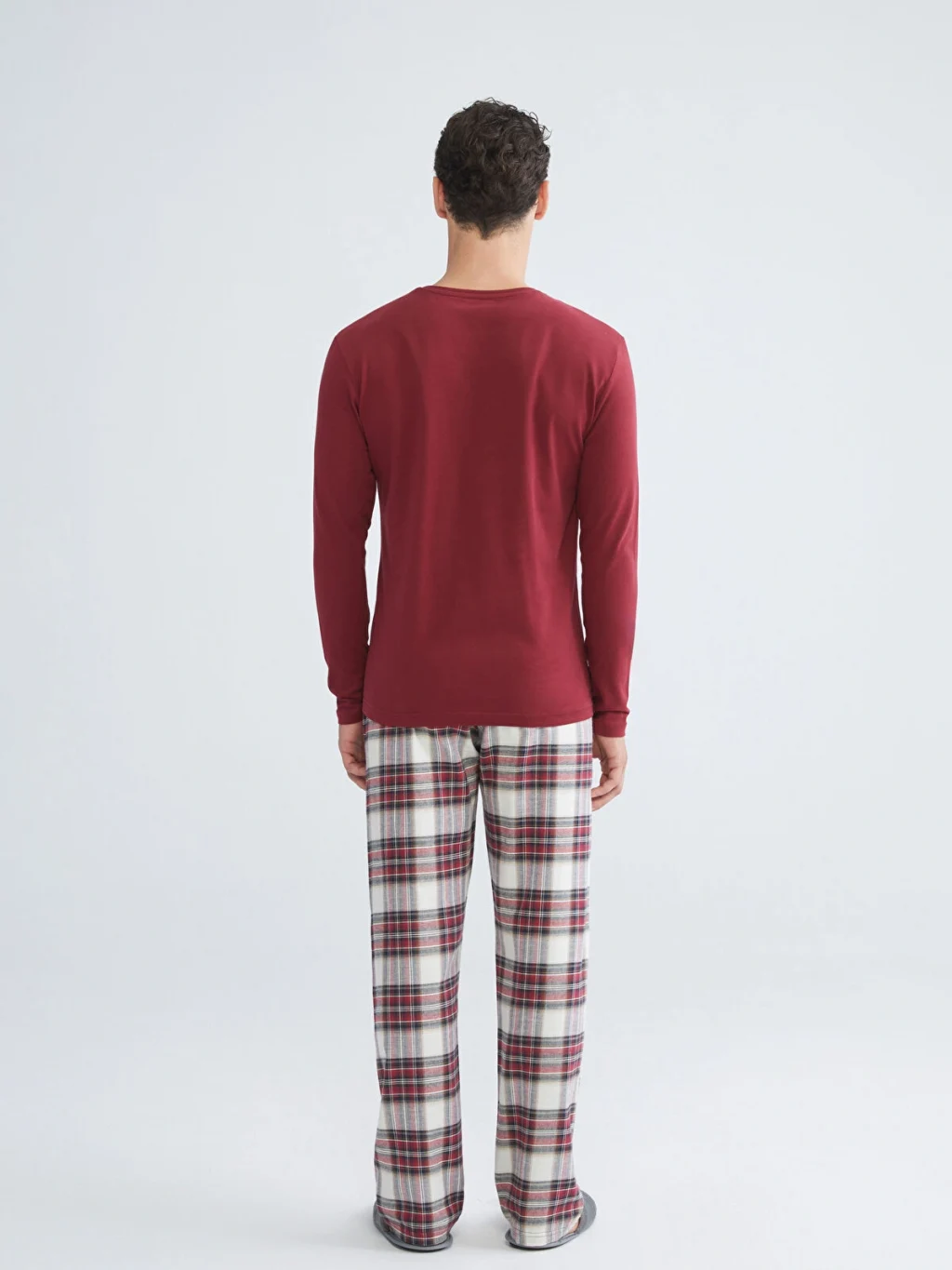 Bisiklet yaka, uzun kollu üst ve ekose desenli alt parçadan oluşan erkek pijama takımı, flanel kumaştan üretilmiştir.