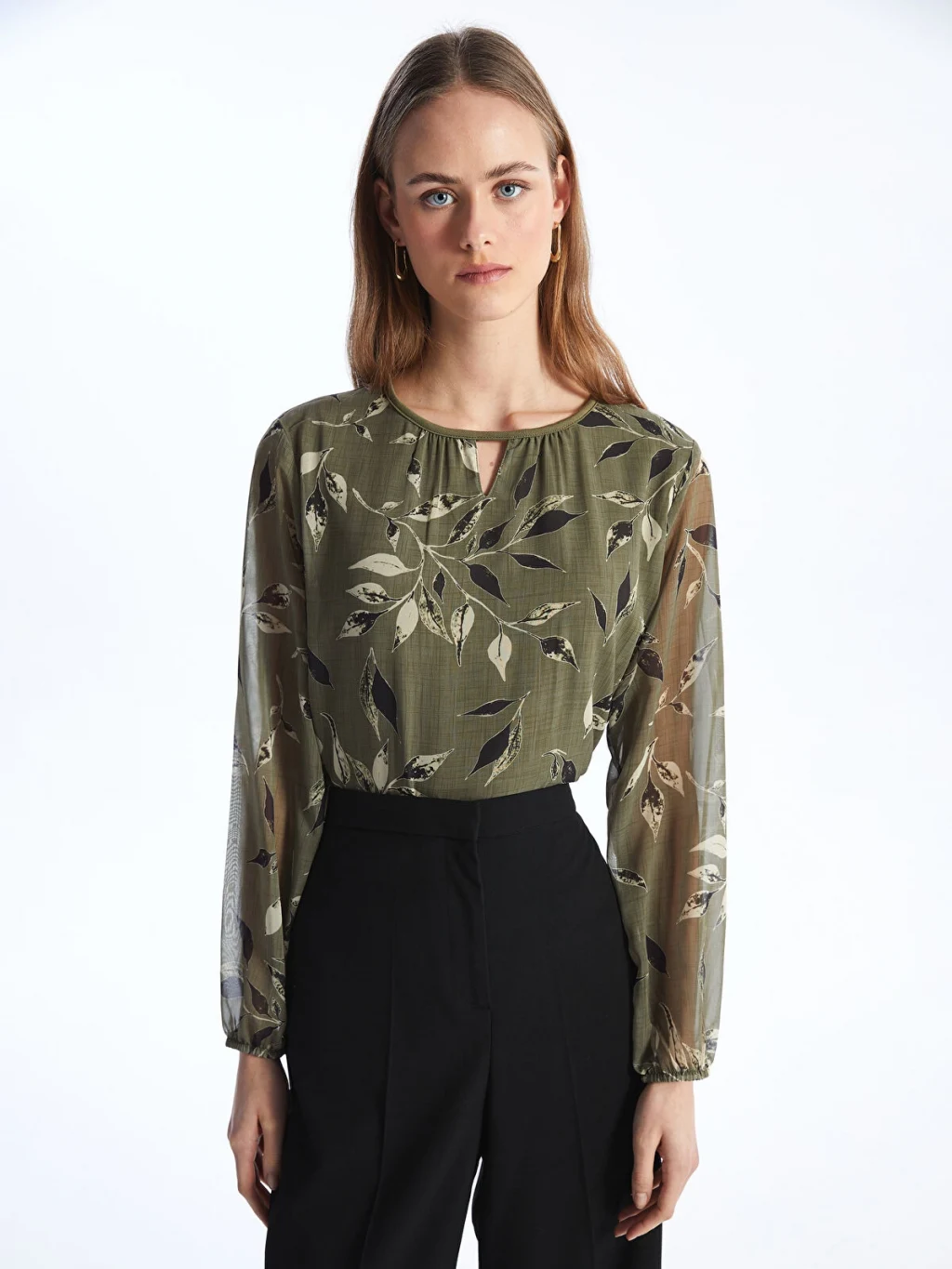 Bisiklet yaka desenli bluz, süprem kumaştan üretilmiştir. Hafif ve nefes alabilen yapısı ile gün boyu konfor sunar. Bileklerinde bulunan lastikler bileğinizi kavrayarak hareket özgürlüğü sağlar, yakasında dikkat çekici pencere detayı bulunur.