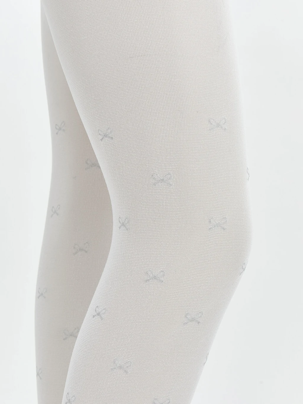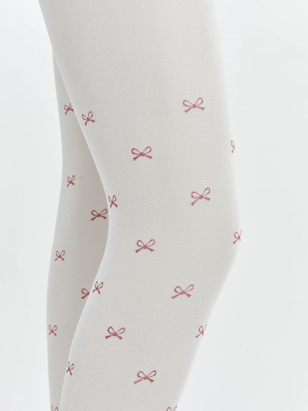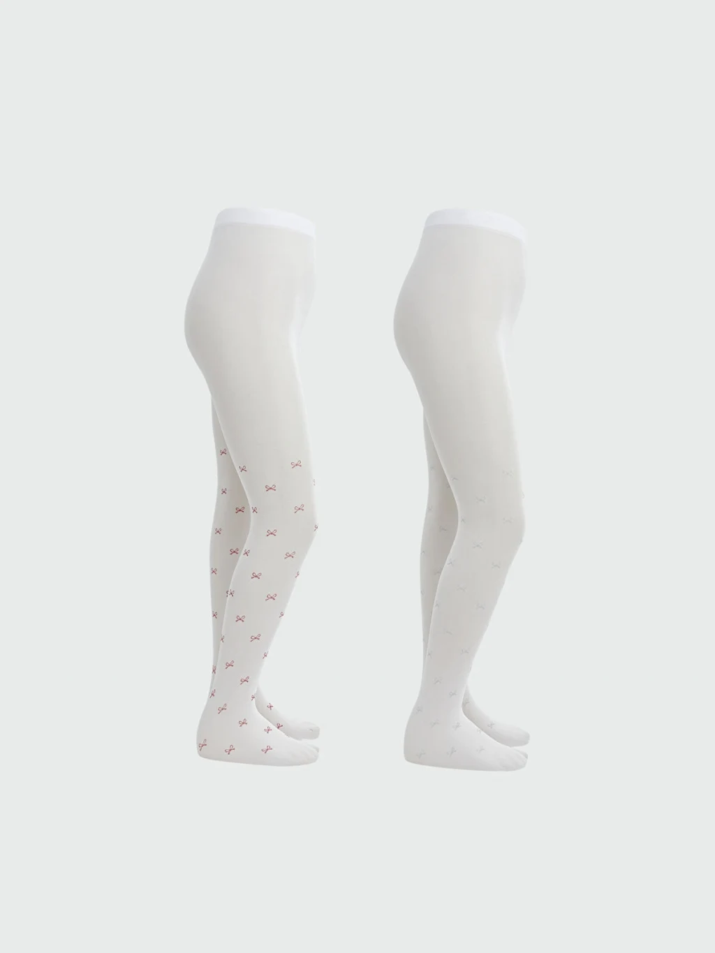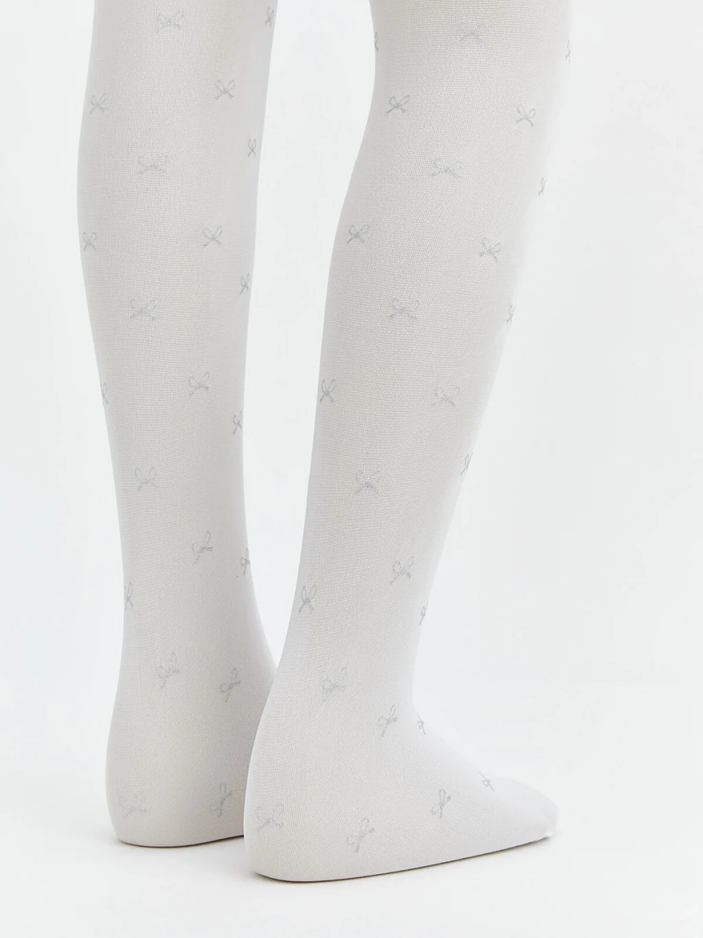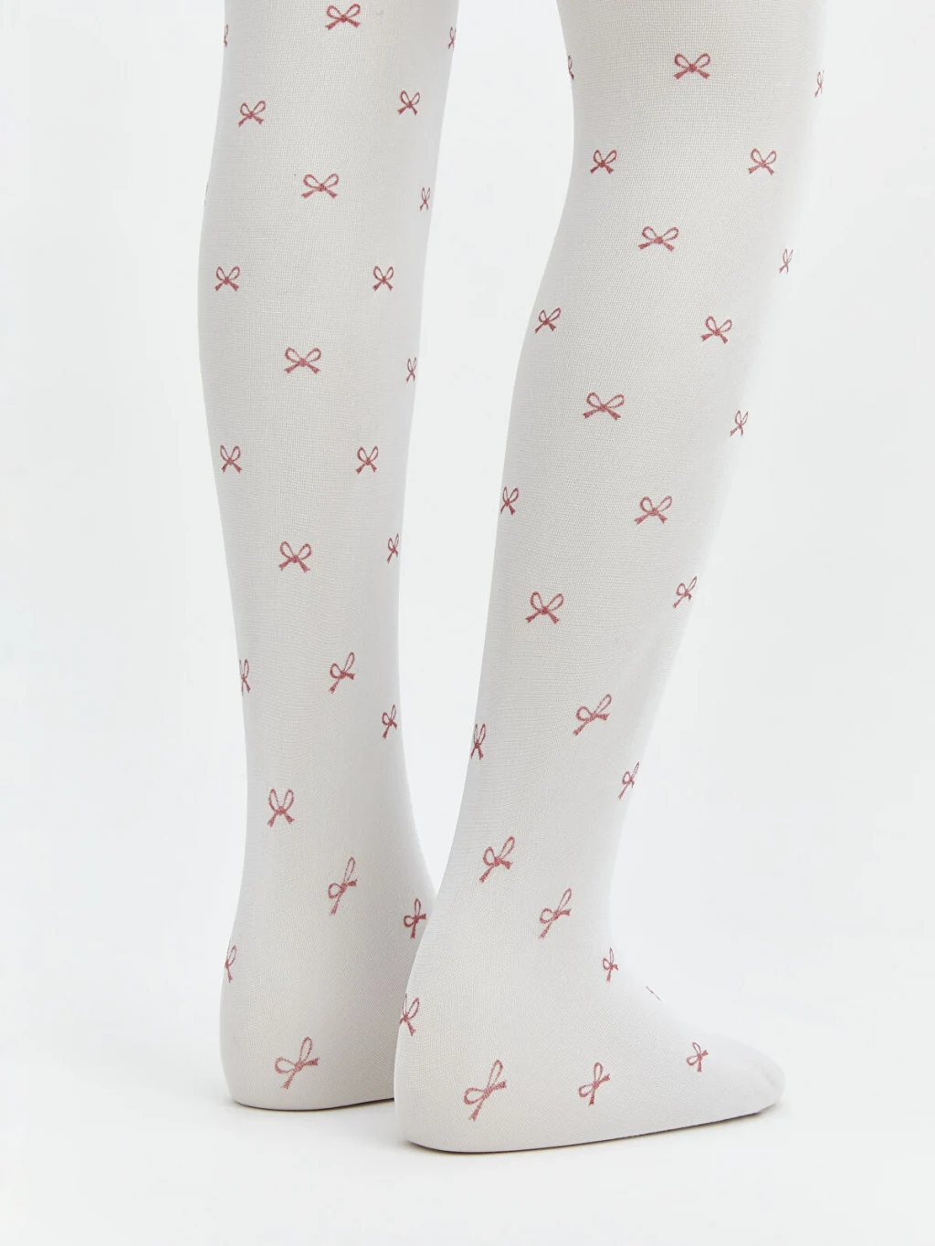 Esnek bel bandına sahip, tamamı tekrarlayan fiyonk desenli kız çocuk külotlu çorap.