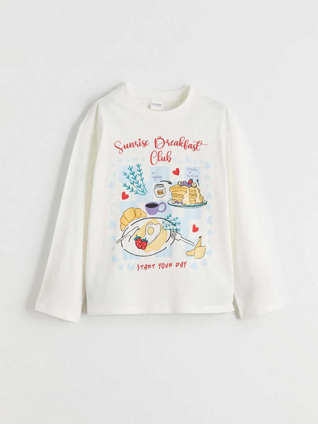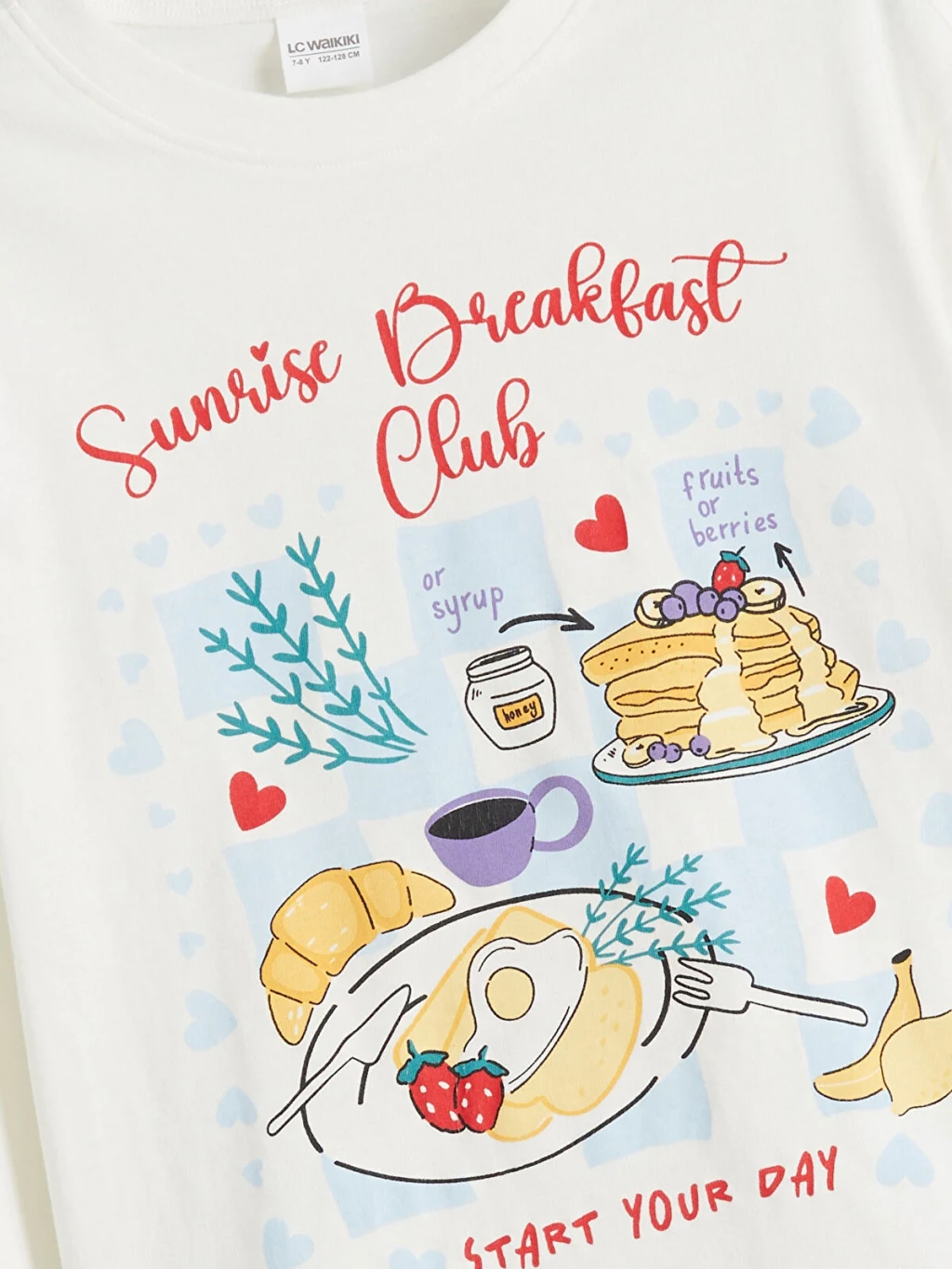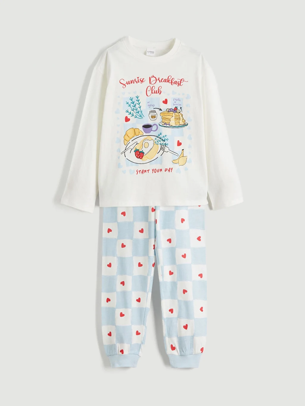 Kız çocuk pijama takımı, %100 pamuklu penye kumaştır. Bisiklet yaka, uzun kollu, baskılı üst ve paçası lastikli, desenli alt parçadan oluşur.