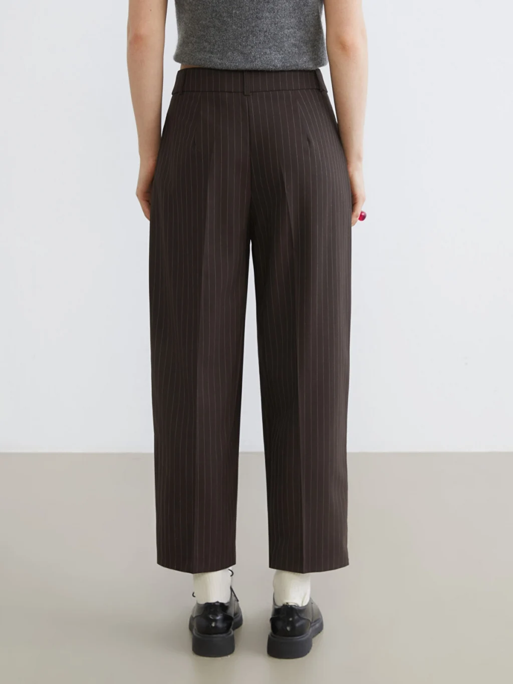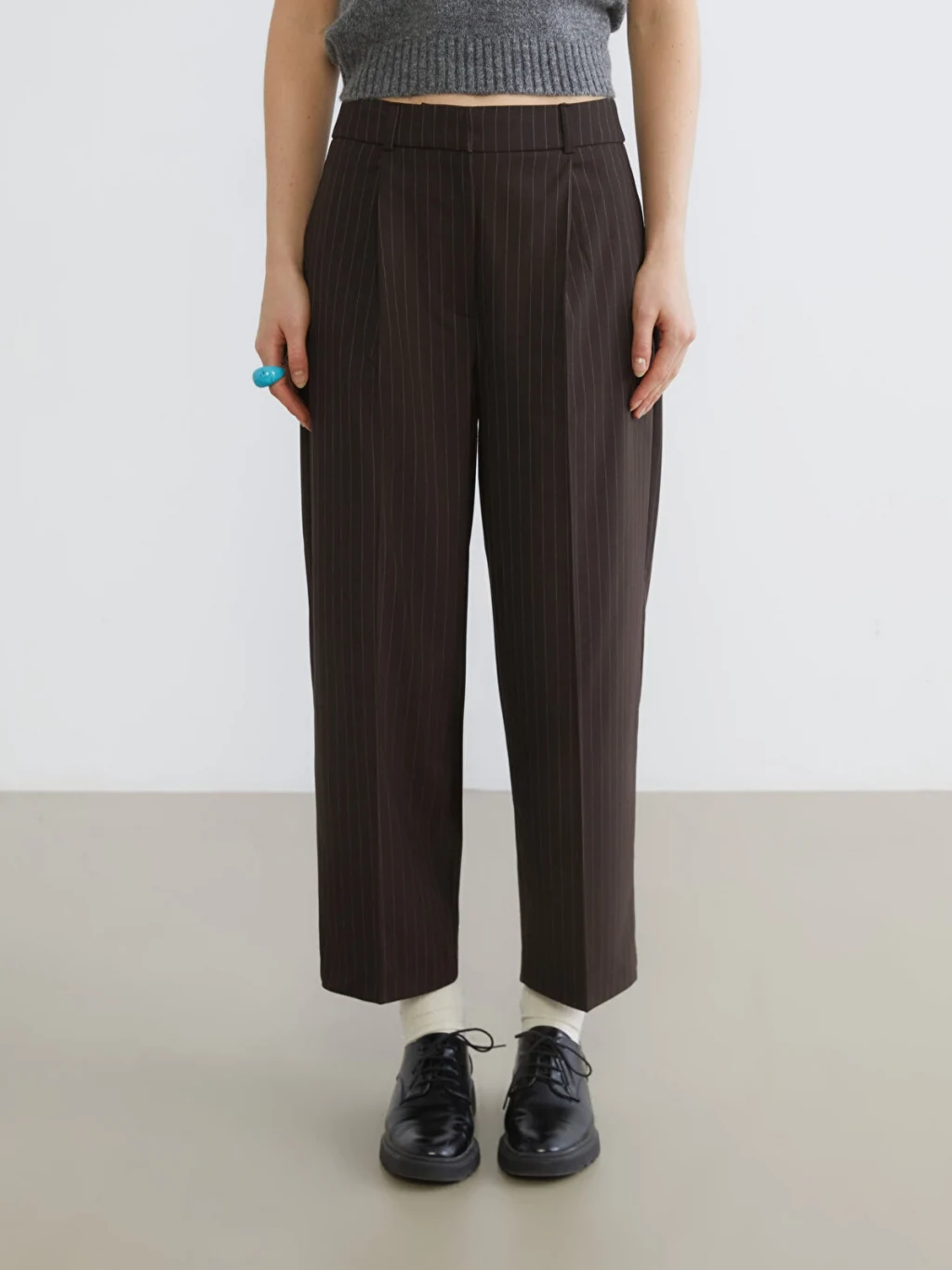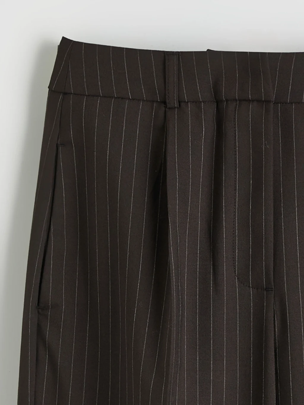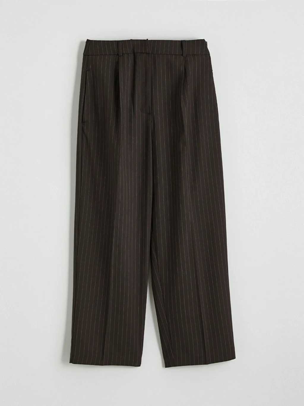 Bol kesim, çizgili desenli kadın pantolon, poliviskon kumaştan üretilmiştir. Önü pilili olup fermuar ve düğme kapamalıdır.