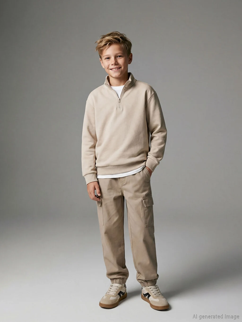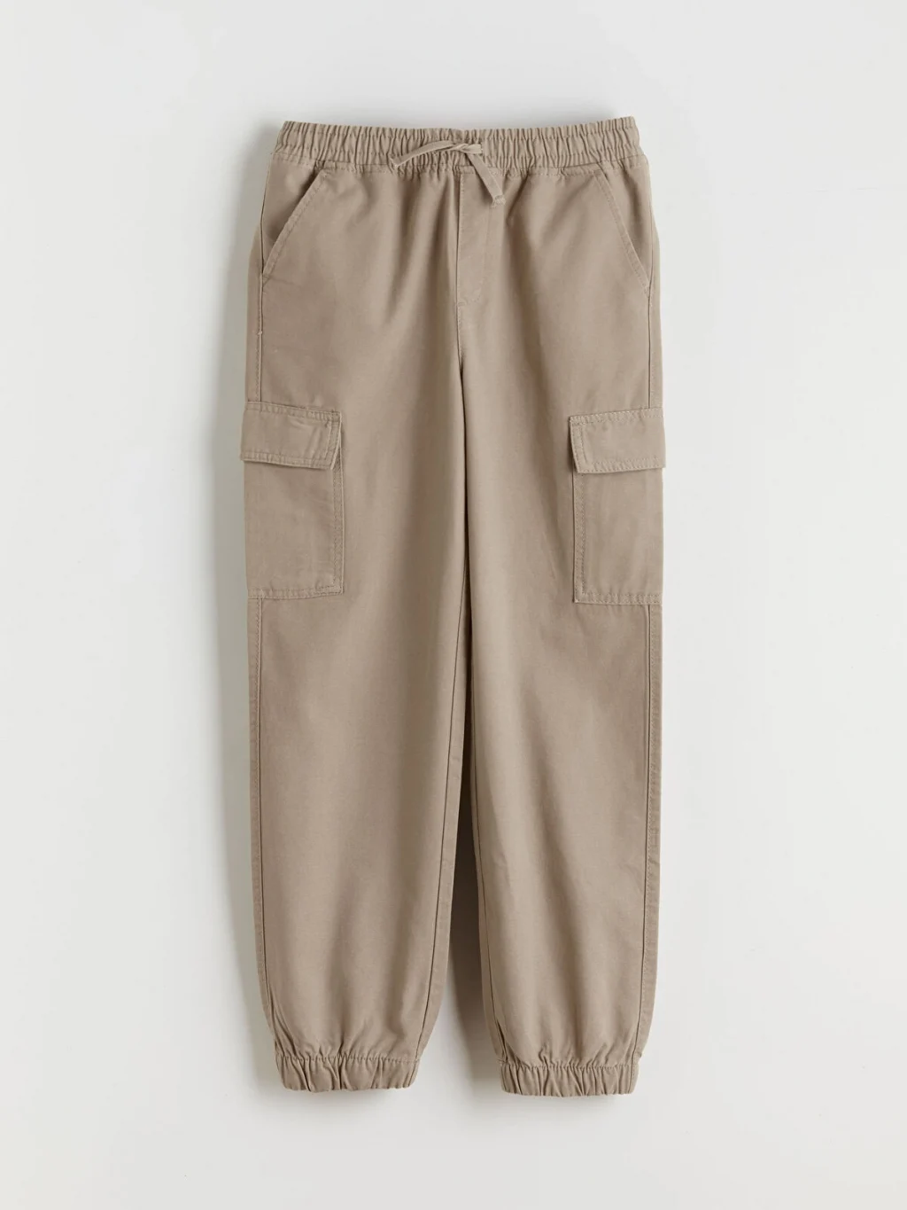 Standart kalıp erkek çocuk pantolon, %100 pamukludur. Beli ve paçaları lastiklidir, beli ayarlanabilir iplidir. Yan ve kapaklı kargo cepleri bulunur.