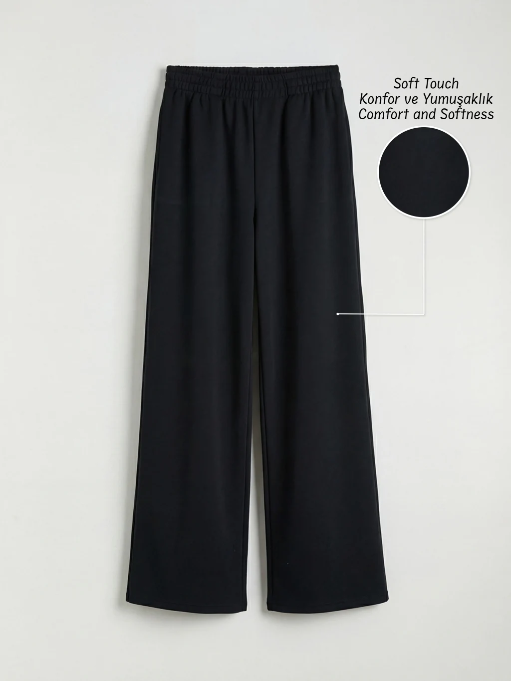 Beli lastikli ve cepli kız çocuk eşofman altı, geniş paça kesimlidir ve orta kalınlıkta eşofman kumaşından üretilmiştir.