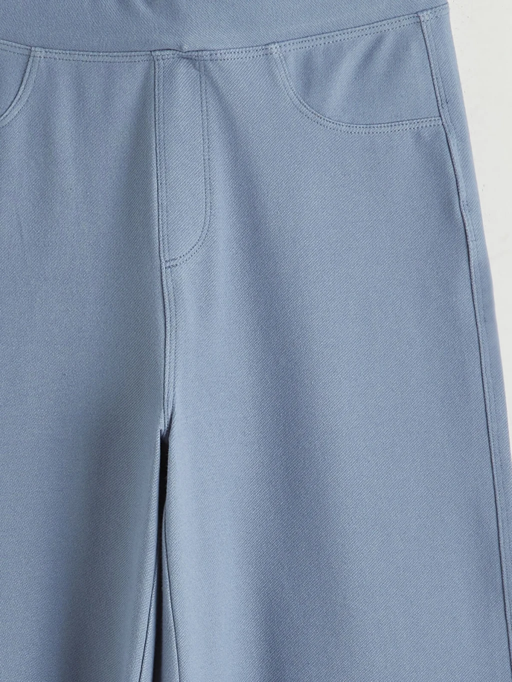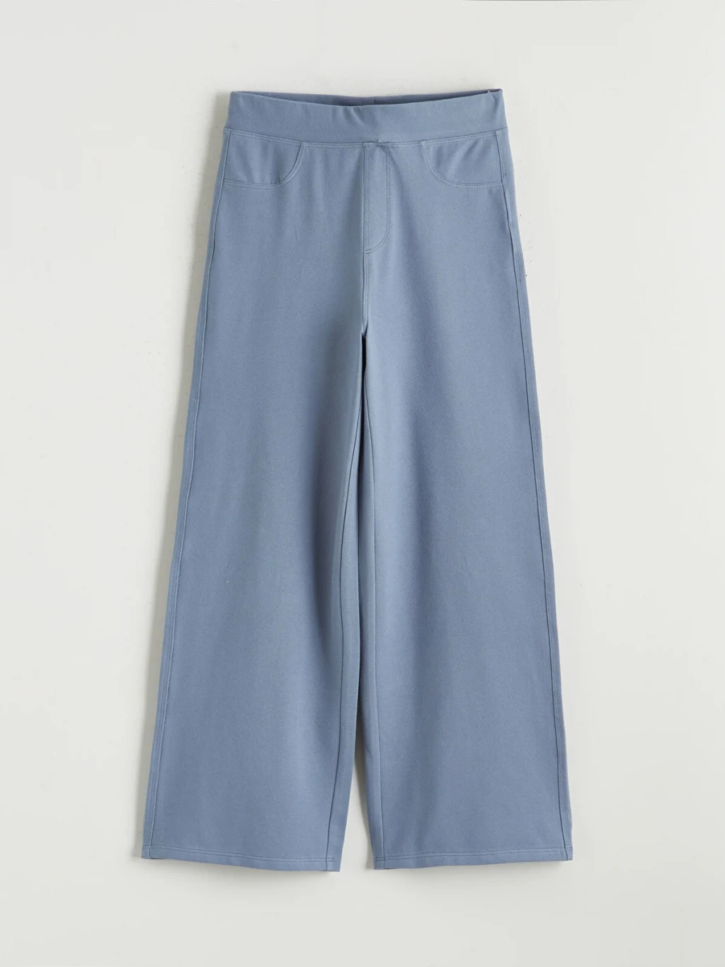 Yüksek pamuk içeren denim görünümlü kumaştan üretilen kız çocuk eşofman altı, beli lastikli, önü cepli ve geniş paçalıdır.
