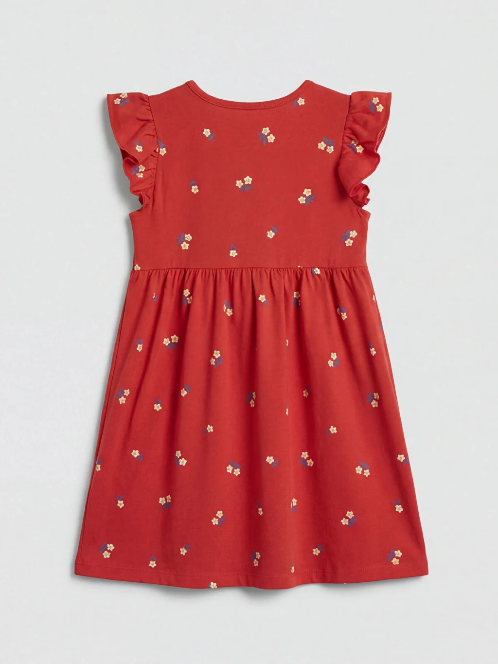 Kız çocuk elbise, pamuklu penye kumaştan üretilmiştir. Bisiklet yakalı, kısa fırfırlı kollu ve beli büzgülüdür.