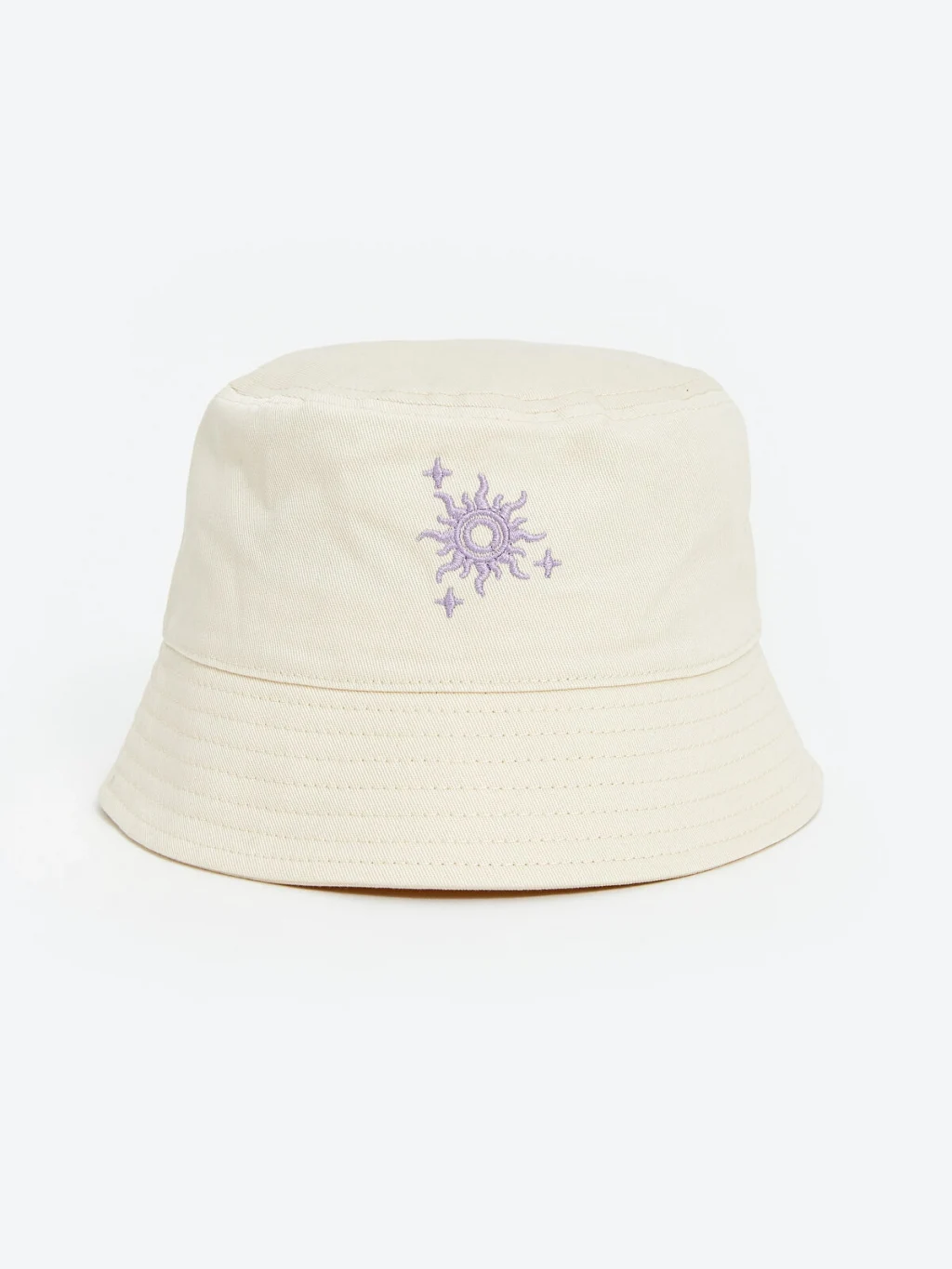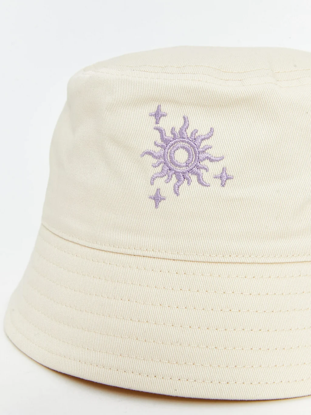 Kız çocuk bucket şapka, ön kısmında güneş ve yıldız işlemesi bulunur; siperliği dikiş detaylıdır.