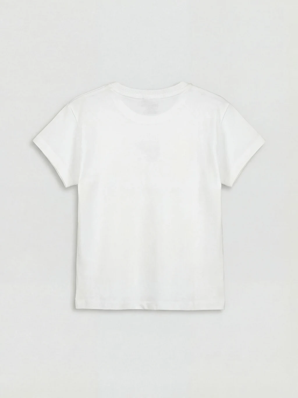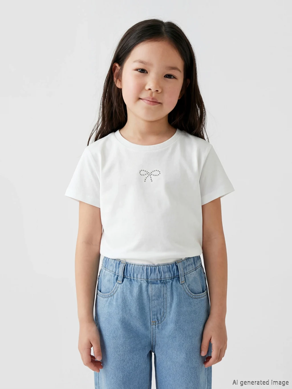 Bisiklet yaka ve kısa kollu kız çocuk tişört, %100 Pamuk penye kumaştan üretilmiştir ve nakış detayına sahiptir.