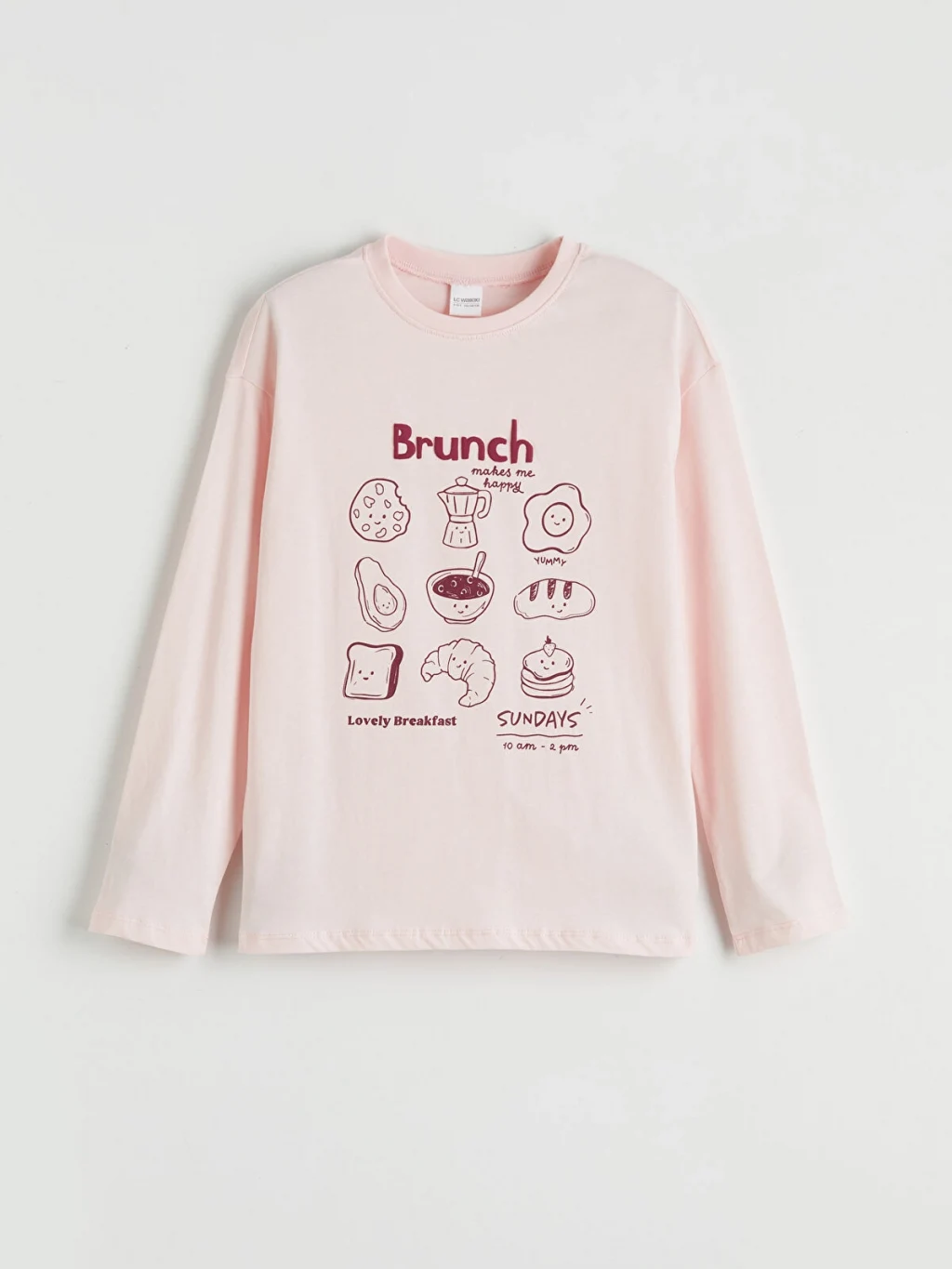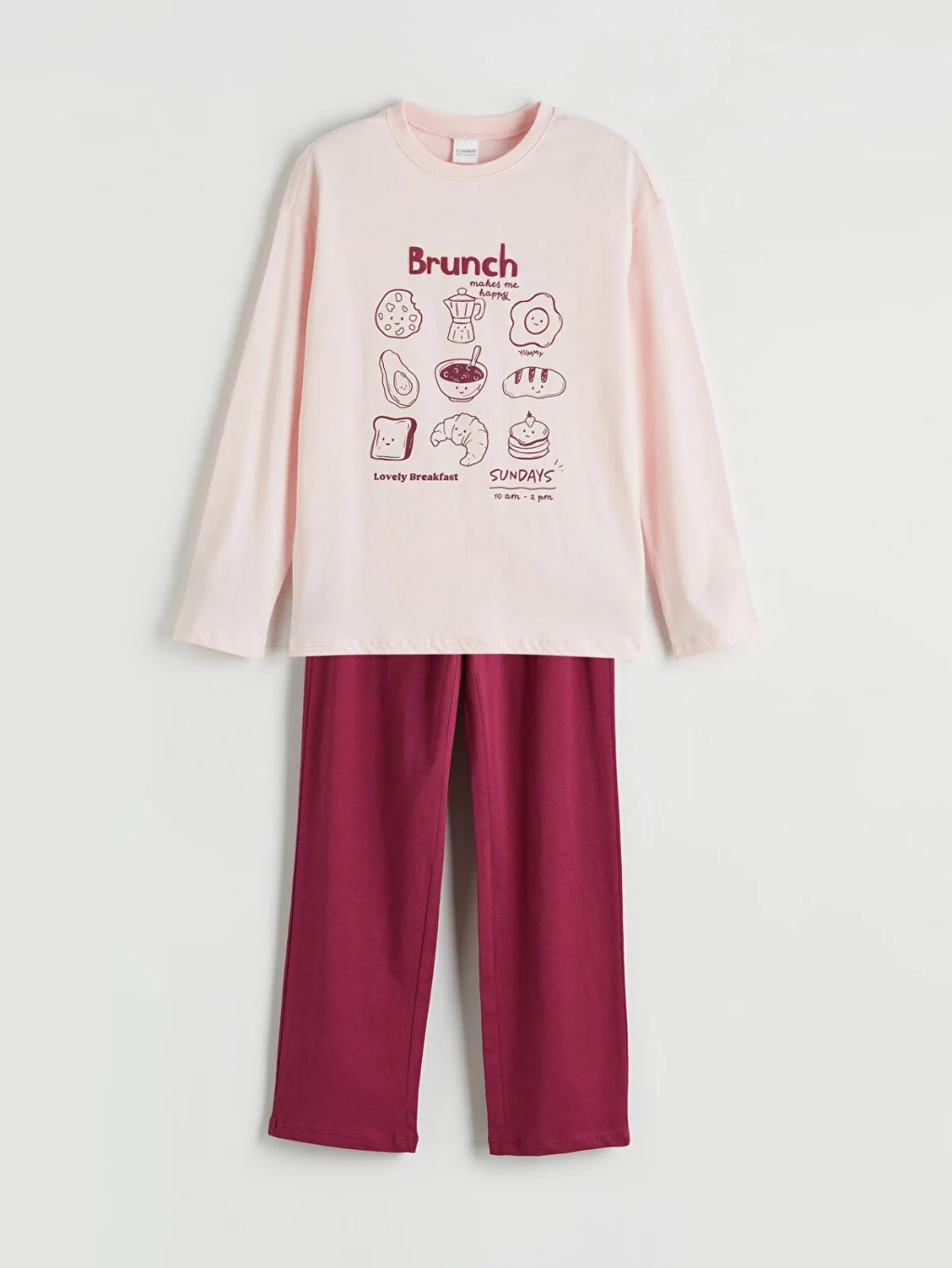 Kız çocuk pijama takımı, bisiklet yaka ve uzun kollu baskılı üst ile pijama alttan oluşur. %100 pamuk kumaştan üretilmiştir.