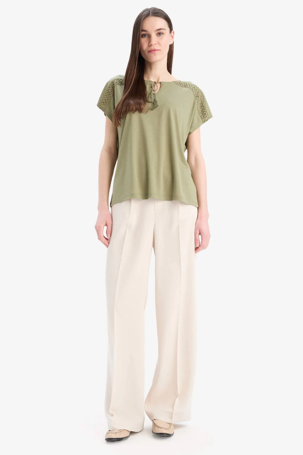 Yetişkin kadınlar için Traditional markasının özel koleksiyonundan kısa kollu tişört. Haki rengi ve dantel detayları ile şıklığı ön plana çıkarıyor. İlkbahar/Yaz mevsimlerinde tercih edebileceğiniz bu tişört, örme giyim grubundan. Bisiklet yakalı ve yarasa kollu dizaynıyla fark yaratıyor.