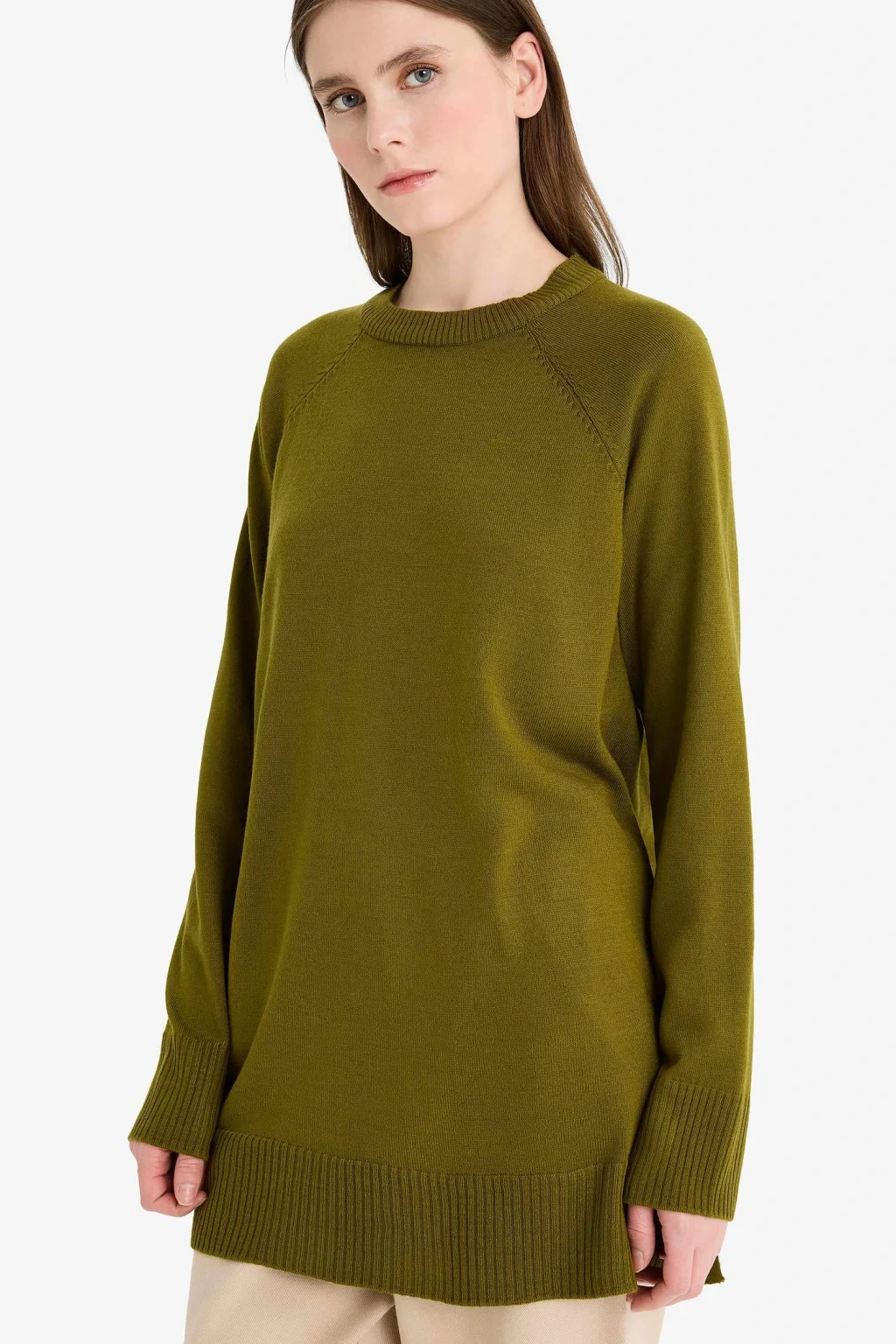 Defacto C4474AXKH463 Haki Regular Fit Bisiklet Yaka Basic Düz Triko Kazak Tunik