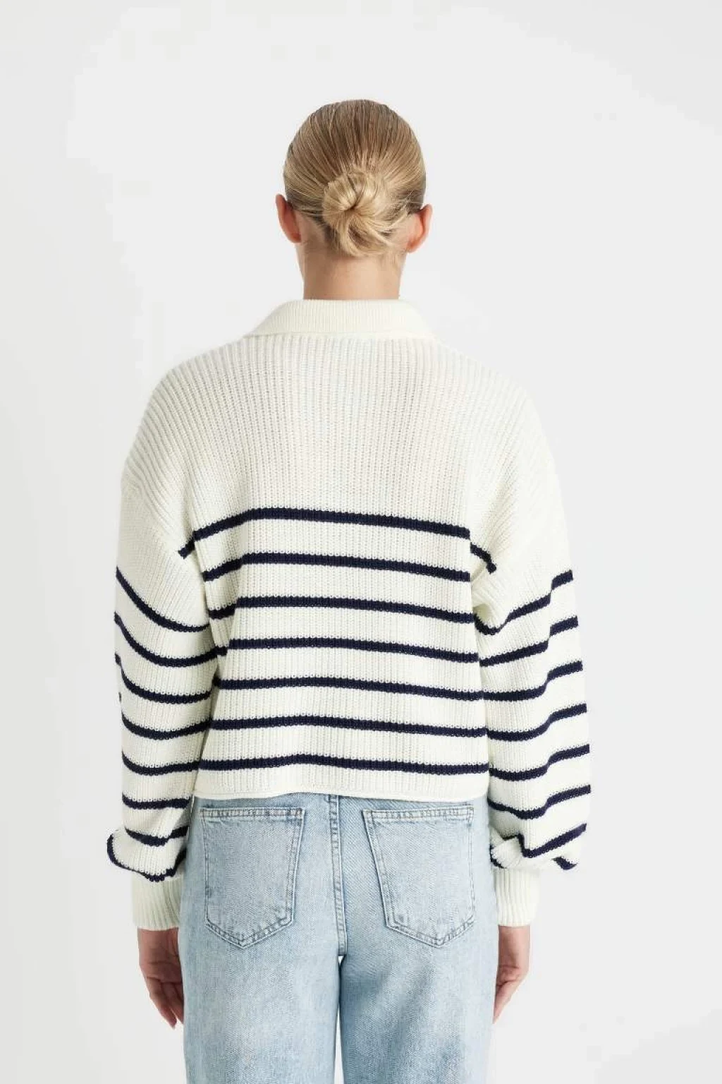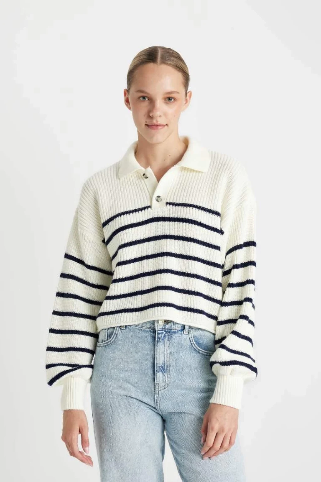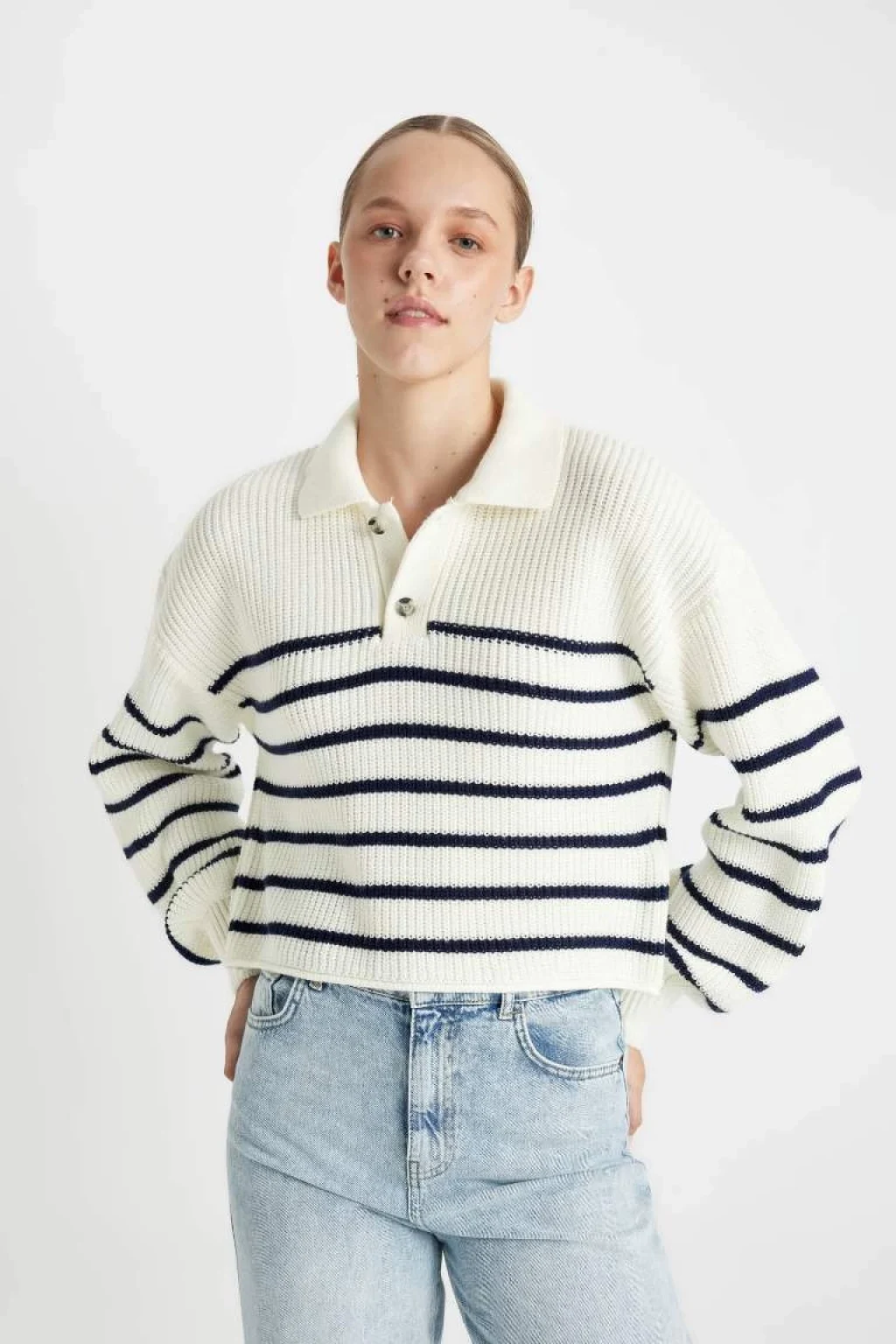 C4918 Coool Relax Fit Polo Yaka Yarım Düğmeli Çizgili Triko Kazak