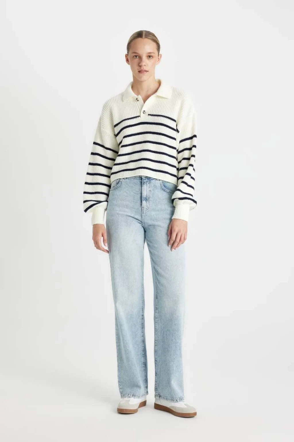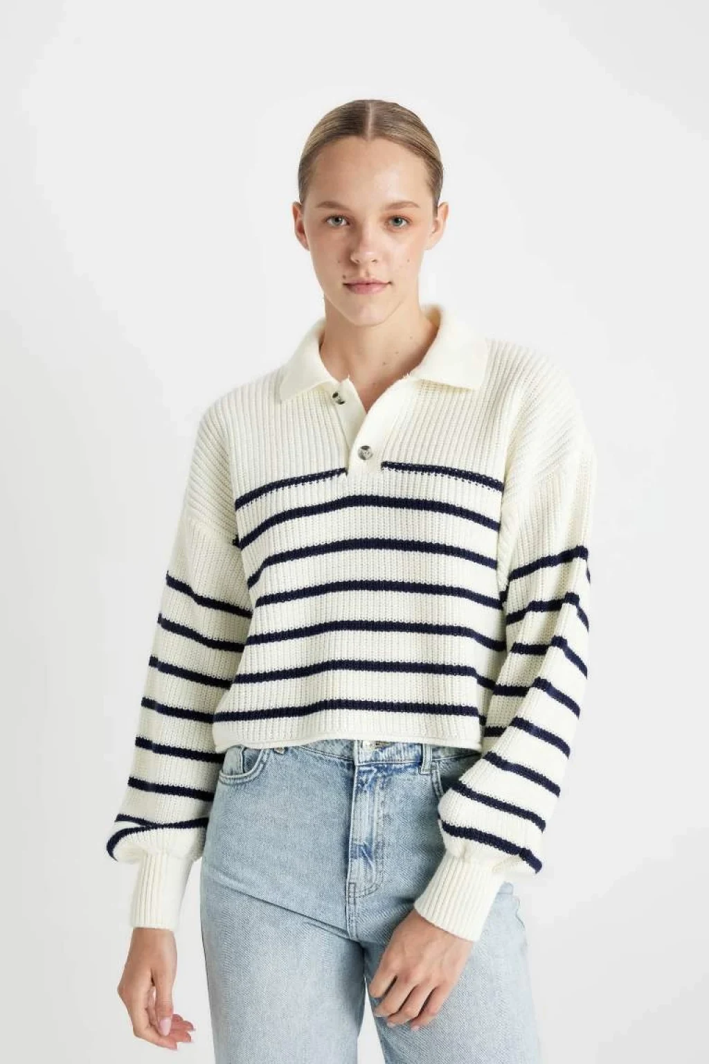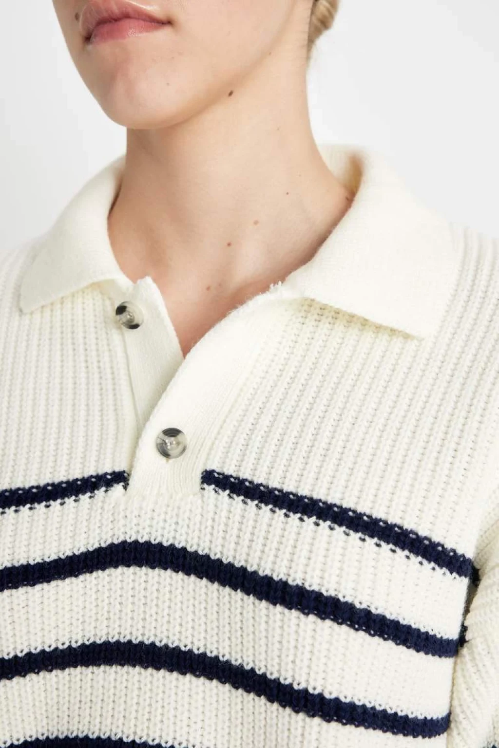 C4918 Coool Relax Fit Polo Yaka Yarım Düğmeli Çizgili Triko Kazak