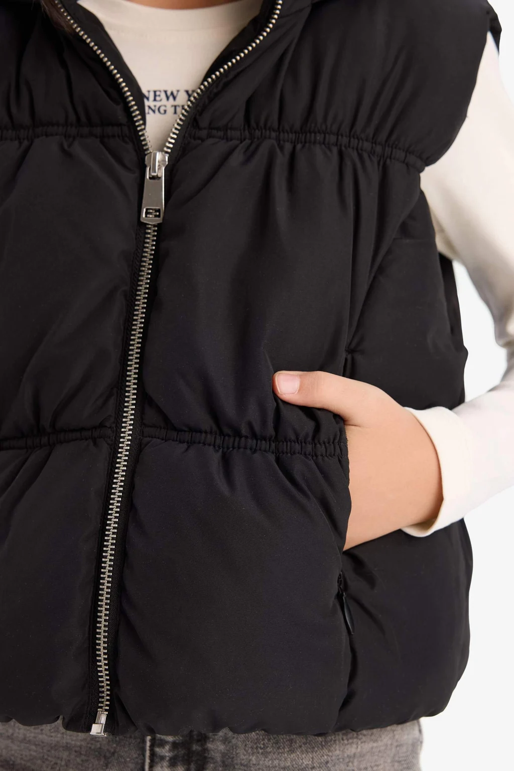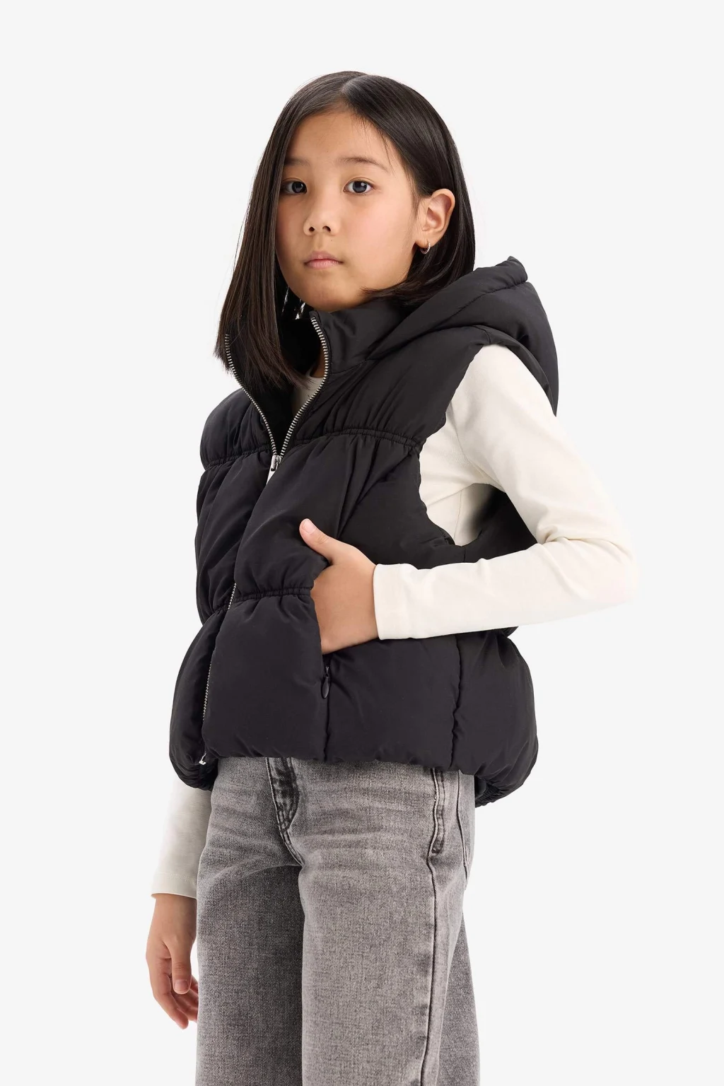 Kız Çocuk Su İtici Kapüşonlu Şişme Yelek, hafif ve su itici özelliğiyle çocukları yağmur ve rüzgârdan korur. Kapüşonlu tasarımı sayesinde ekstra koruma sağlar ve hareket özgürlüğü sunar. Soğuk havalarda şıklık ve konforu bir arada sunan ideal bir dış giyim parçasıdır.