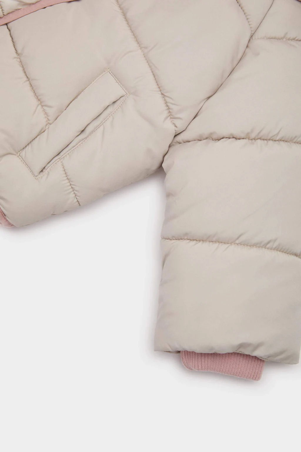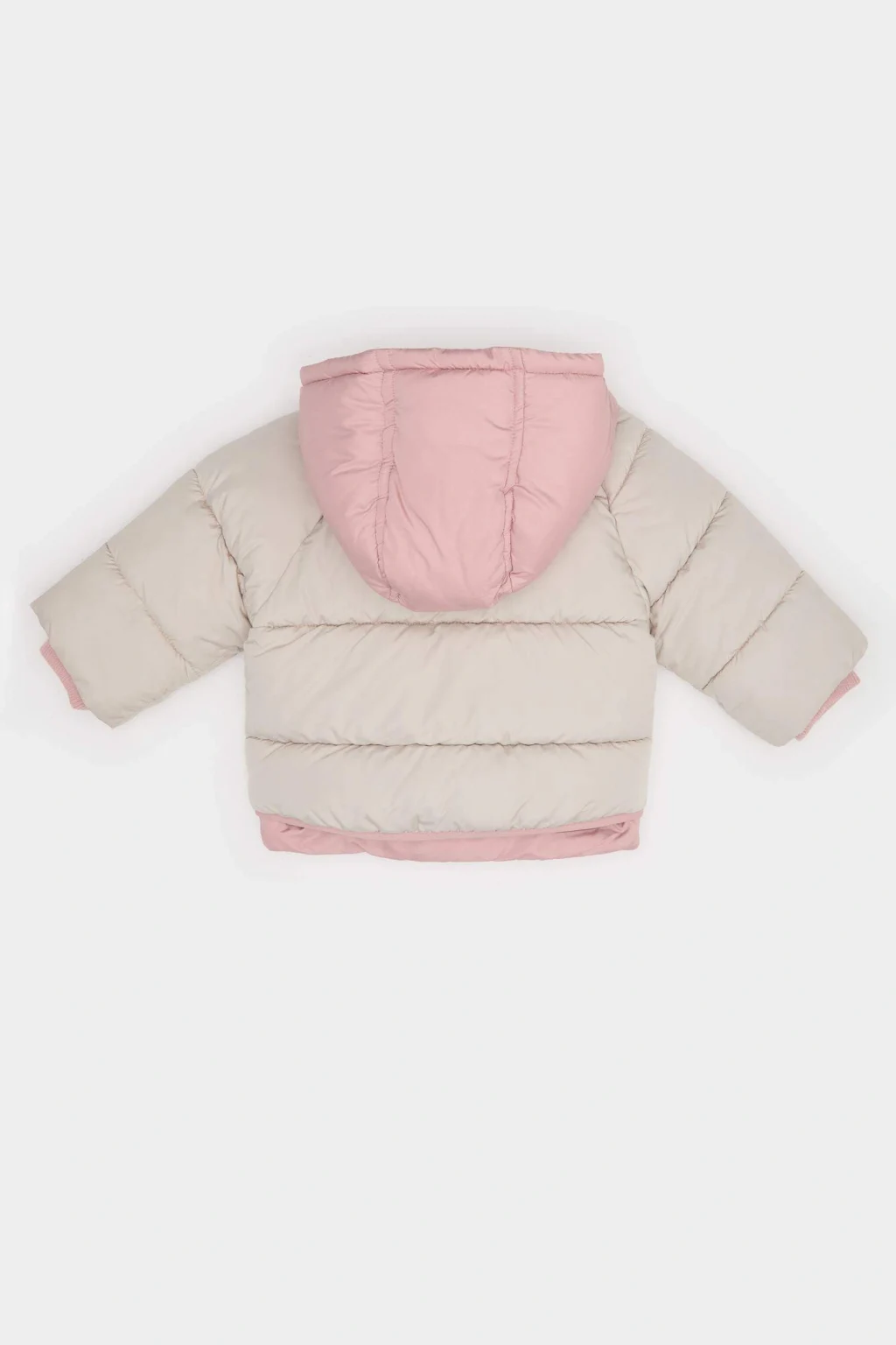 Kız Bebek Kapüşonlu Fermuarlı Şişme Mont, yumuşak dolgu yapısı ve kapüşonuyla soğuk havalarda sıcaklık ve koruma sunar. Fermuarlı tasarımı sayesinde kolay giyilip çıkarılabilir, konforlu bir dış giyim parçasıdır.
