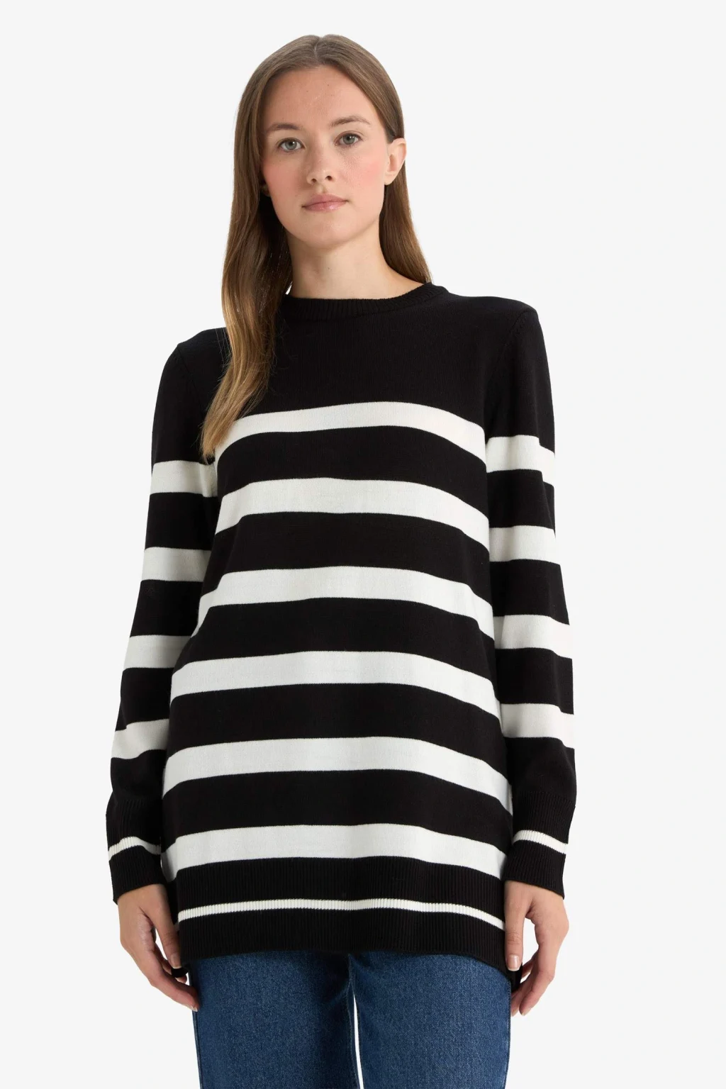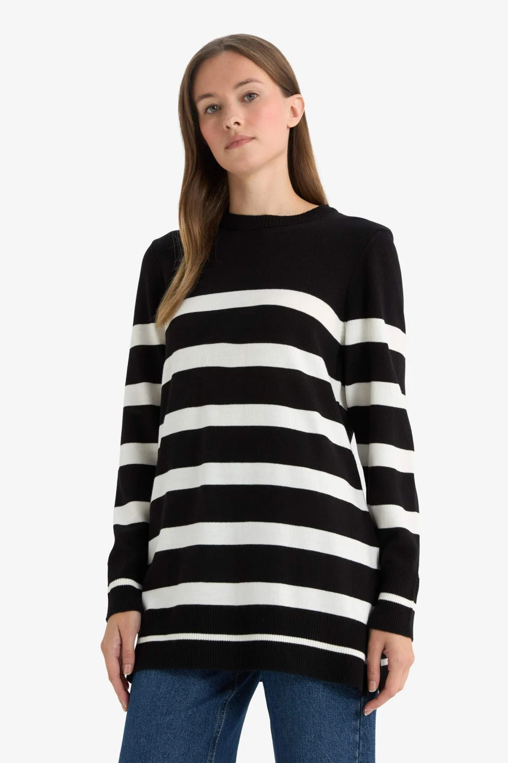 Regular Fit Bisiklet Yaka Çizgili Kazak Tunik, soğuk havalarda hem şık hem de sıcacık kalmanızı sağlar. Rahat kalıbı ve yumuşak triko dokusu gün boyu konfor sunarken, zamansız çizgili deseniyle her tarza kolayca uyum sağlar.