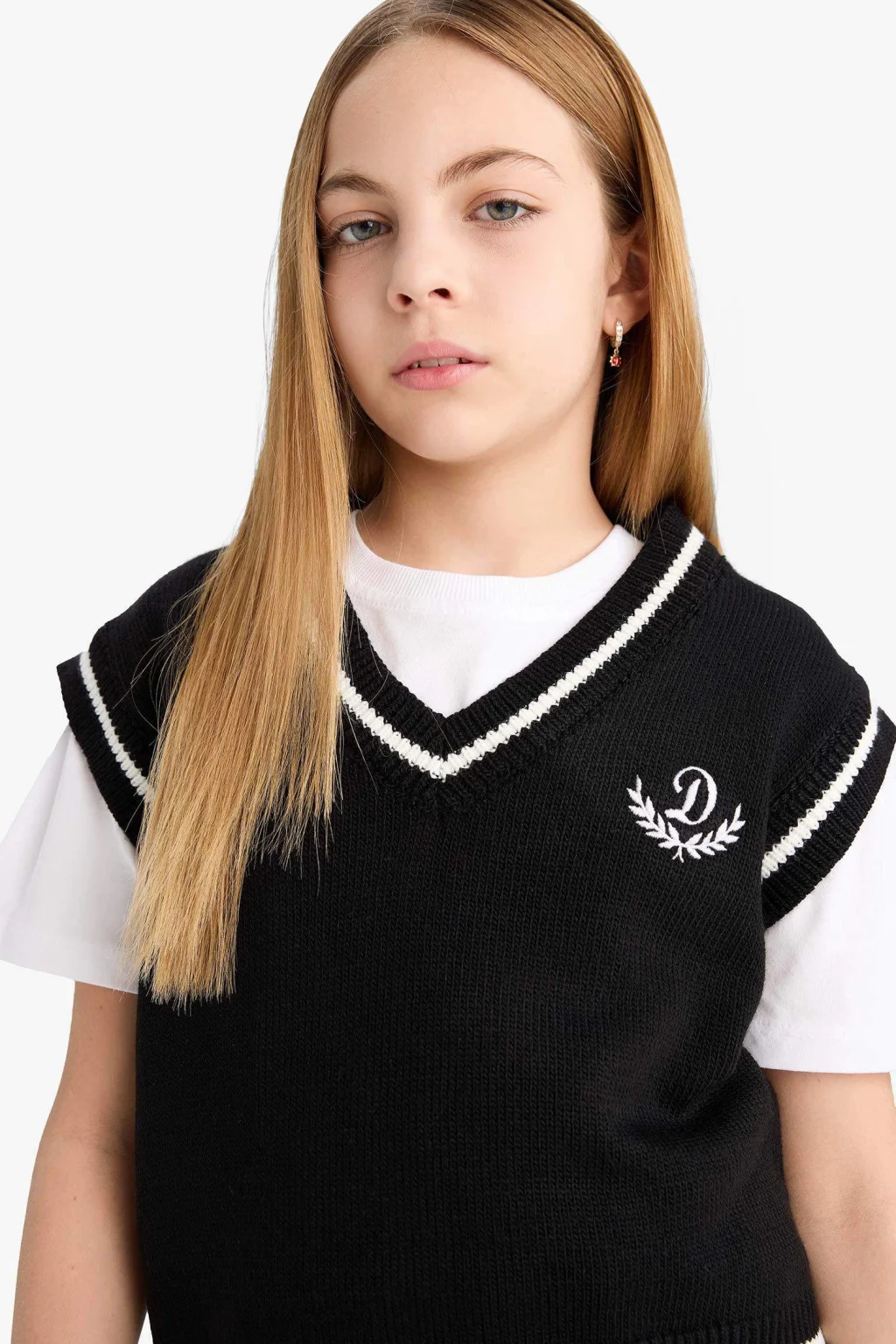 Kız çocuklar için standart fit V yaka süveter, yumuşak dokusu ve klasik tasarımıyla şık bir görünüm sunar. Gömlek veya tişörtlerle kolayca kombinlenebilir.
