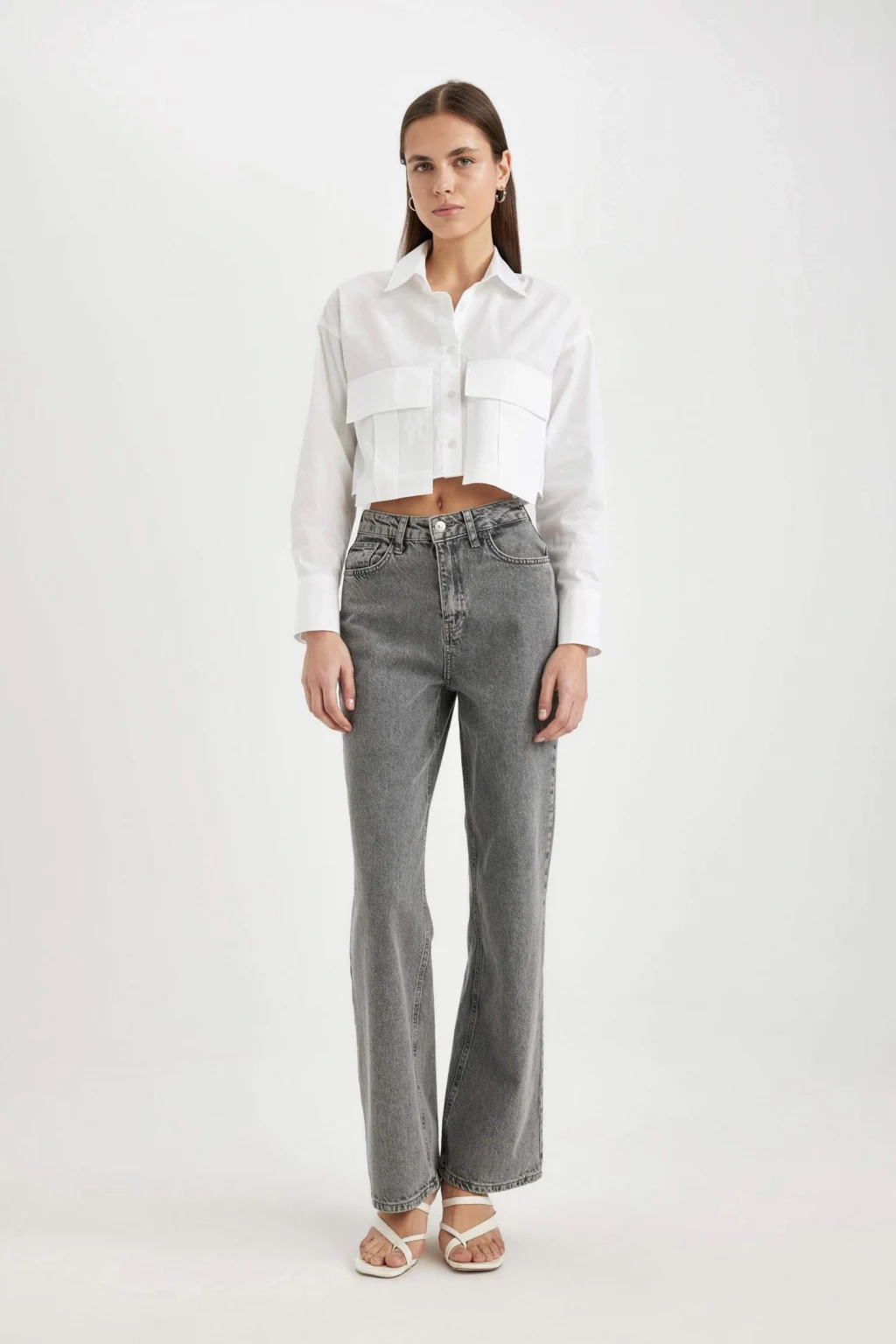 Defacto C5026 Gri Oversize Geniş Kalıp Crop Poplin Uzun Kollu Gömlek