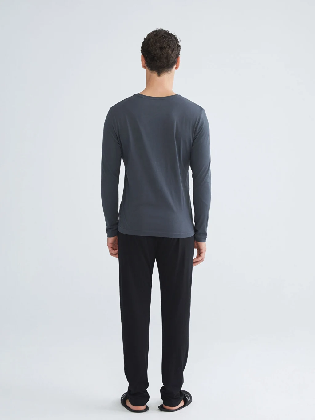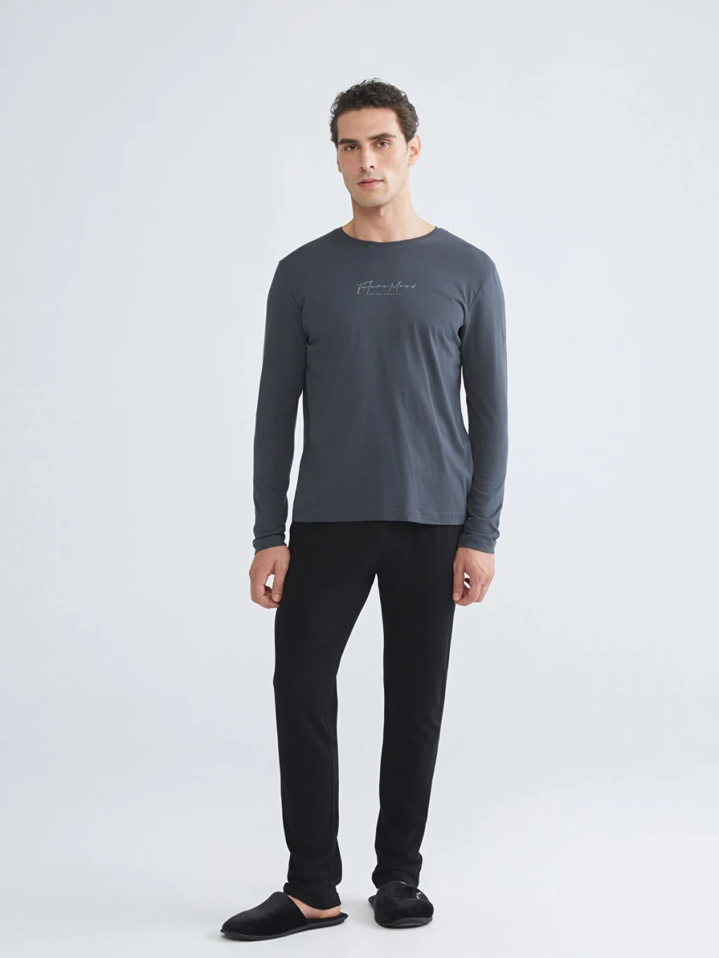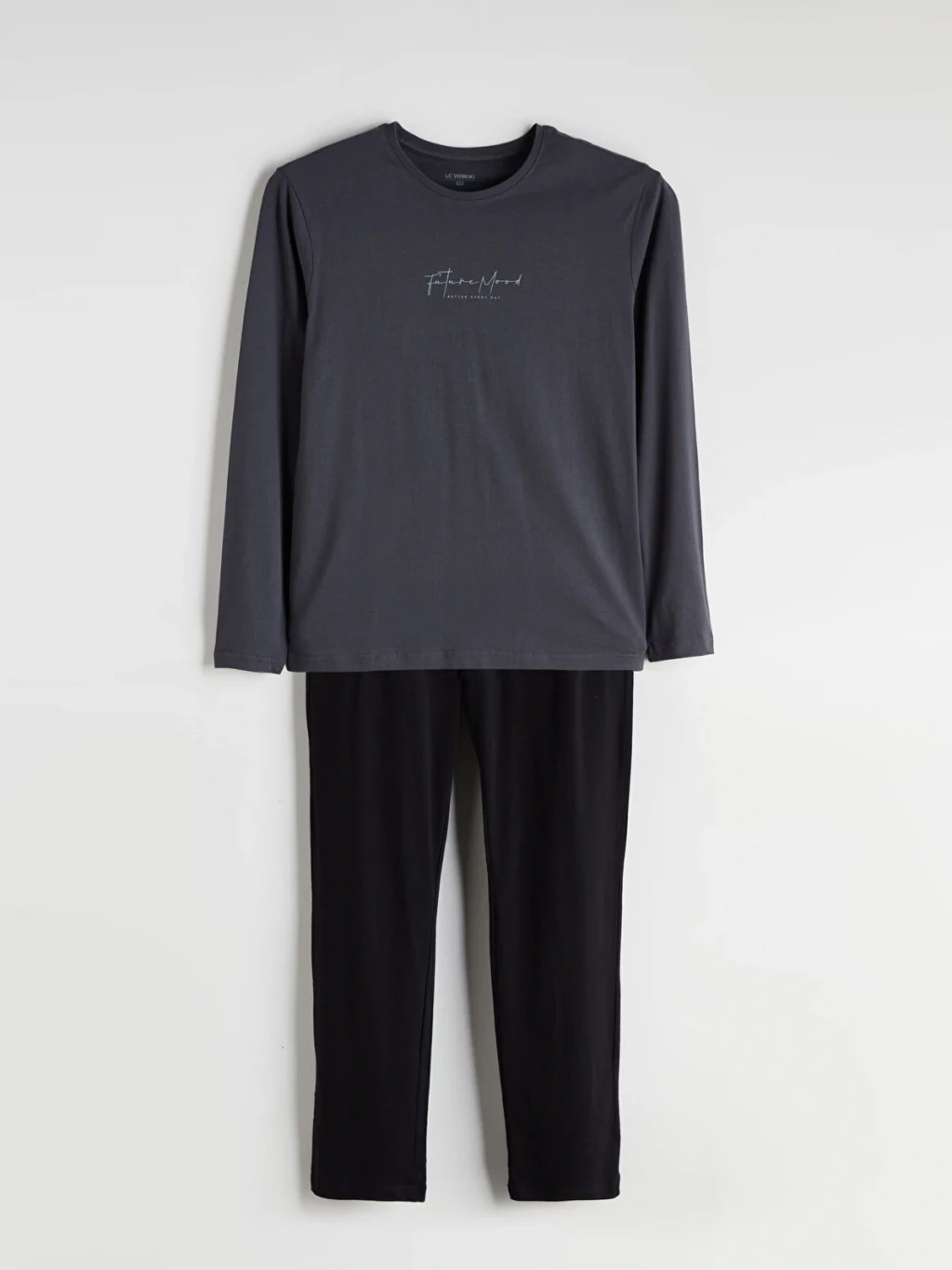 Penye kumaş erkek pijama takımı, bisiklet yaka ve uzun kollu baskılı bir üst ile düz bir pijama altından oluşmaktadır.