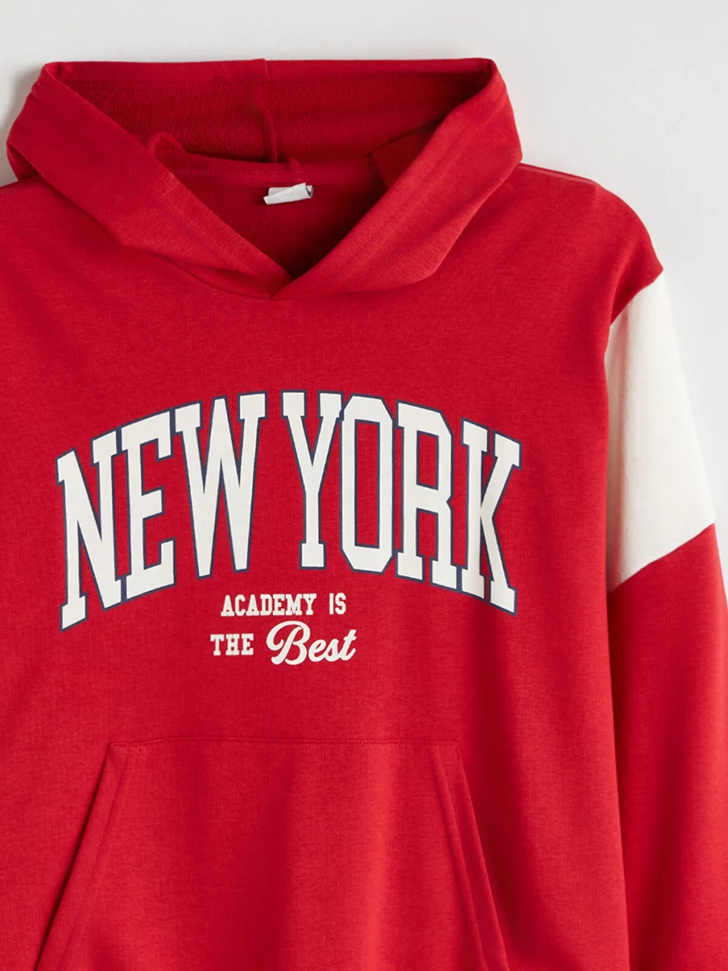 3 iplik kumaştan üretilen erkek çocuk sweatshirt, kapüşonlu ve baskılı tasarıma sahiptir. Manşetleri ve etek ucu ribanalıdır.