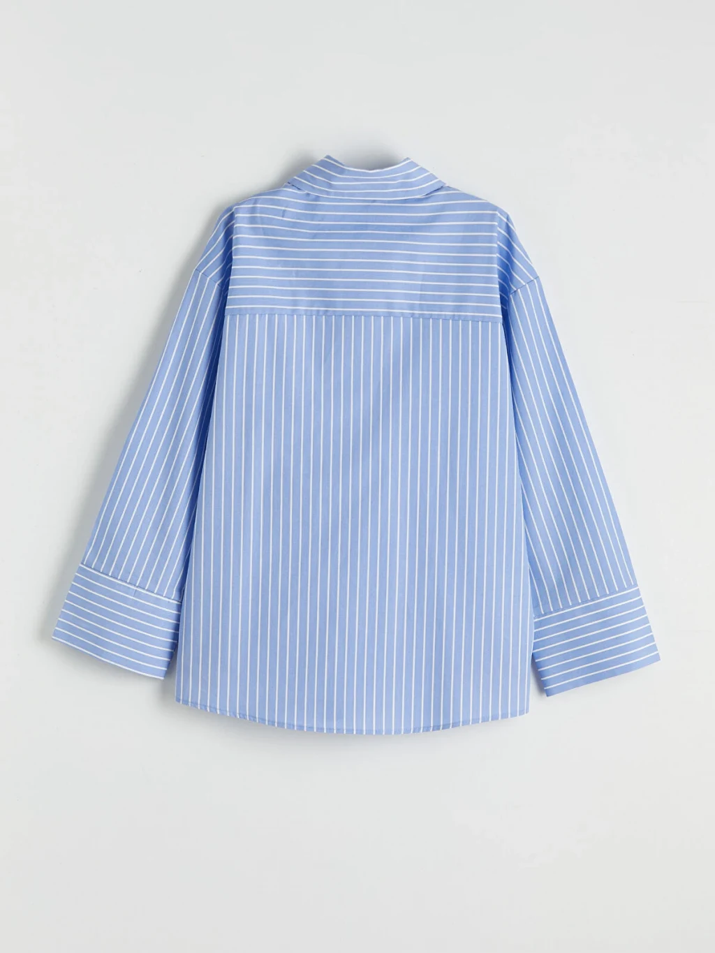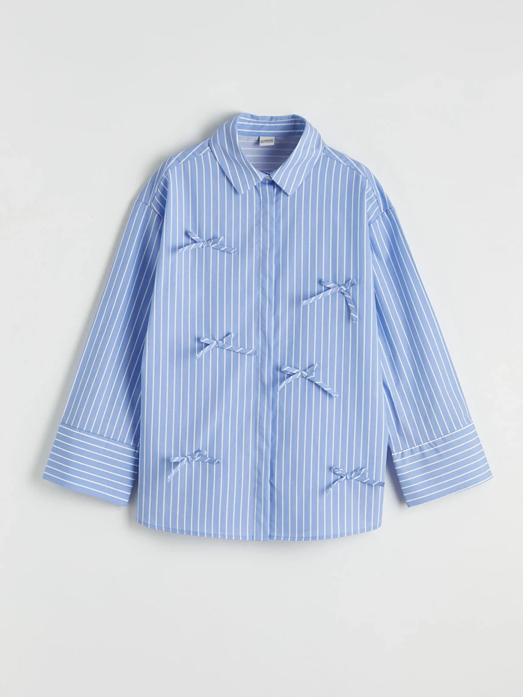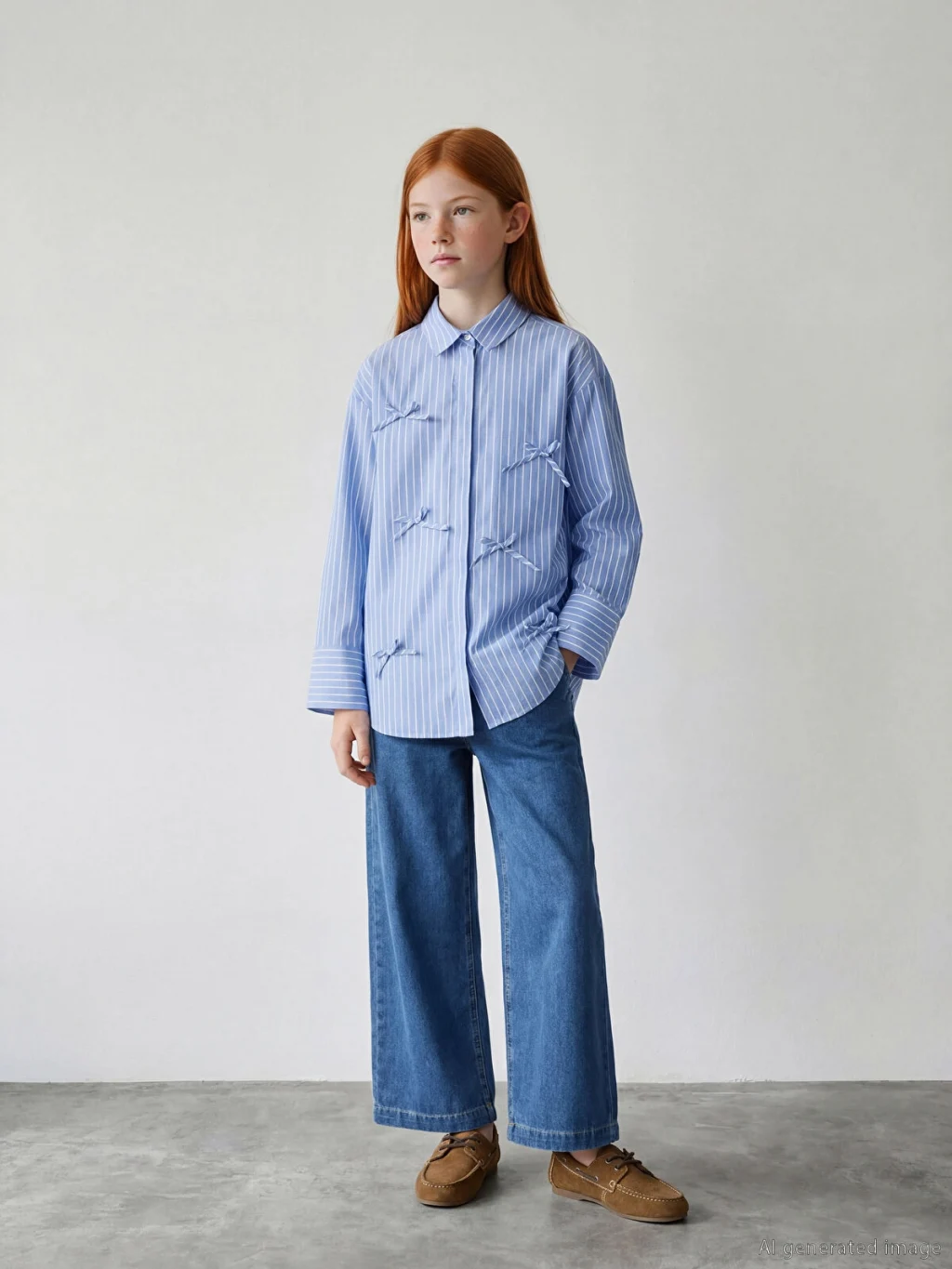 Kız çocuk gömlek, %100 pamuklu poplin kumaştan üretilmiştir. Çizgili desenli, uzun kollu ve fiyonk detaylı olup önden düğme kapamalıdır.