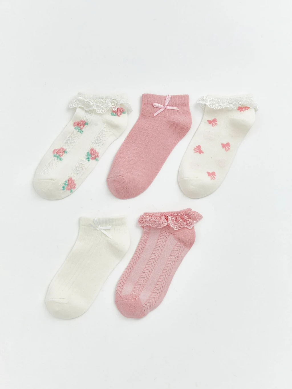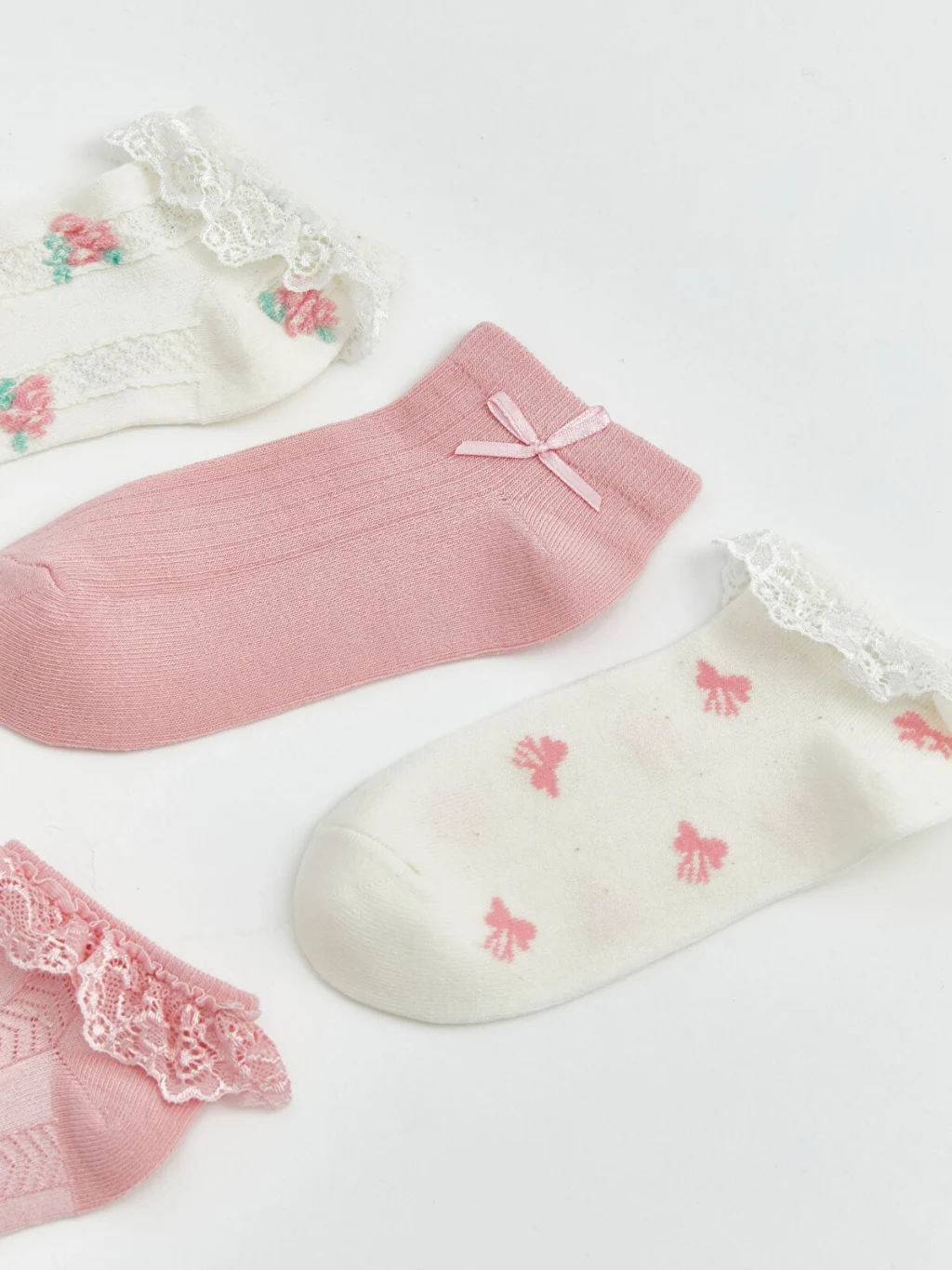 Farklı desen ve dokulara sahip kız çocuk patik çorap seti, fırfır ve fiyonk gibi detaylar içermektedir.