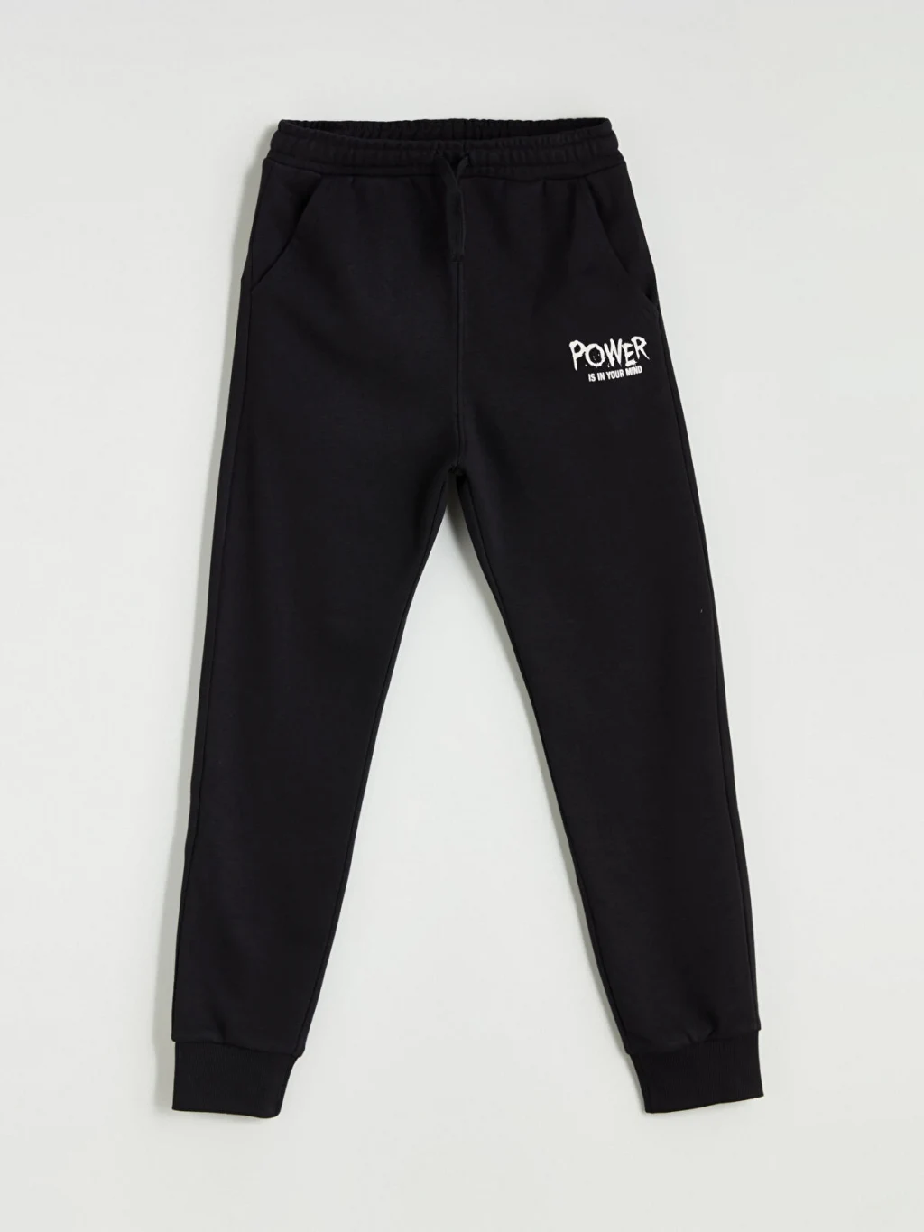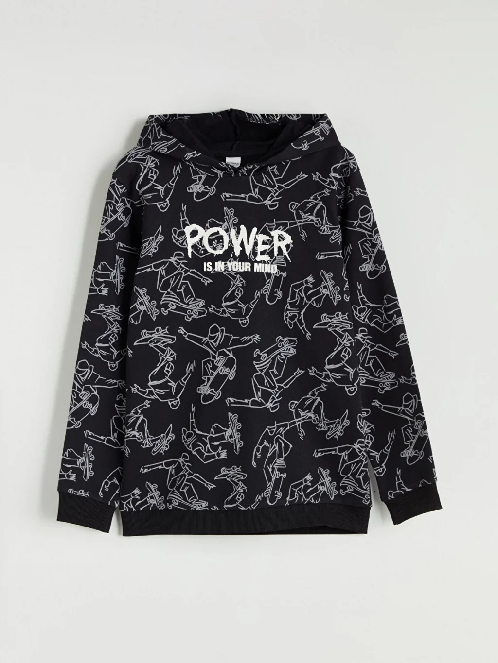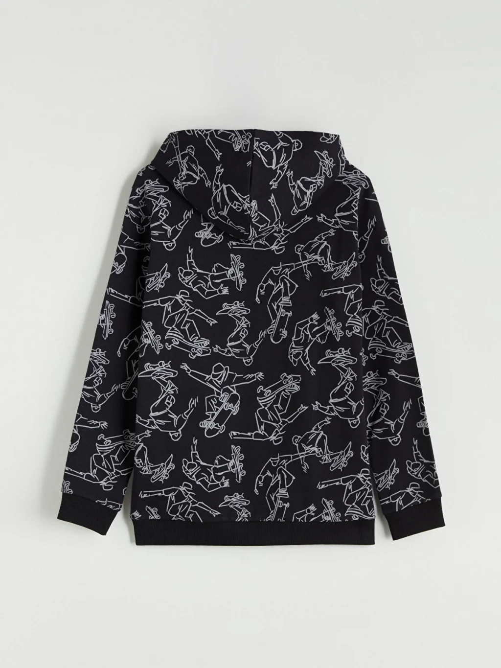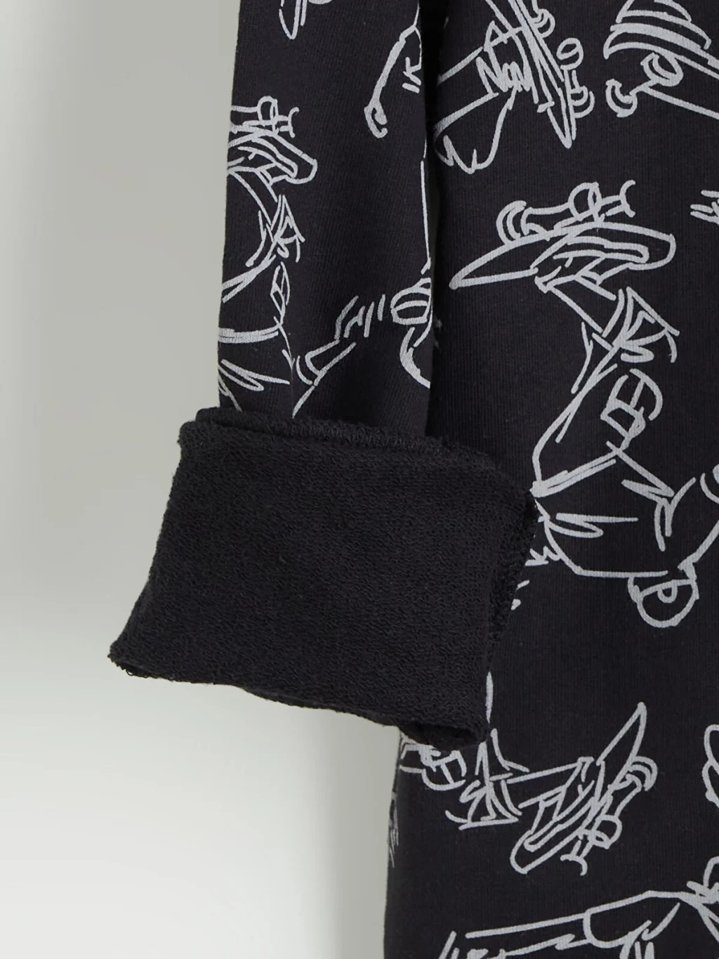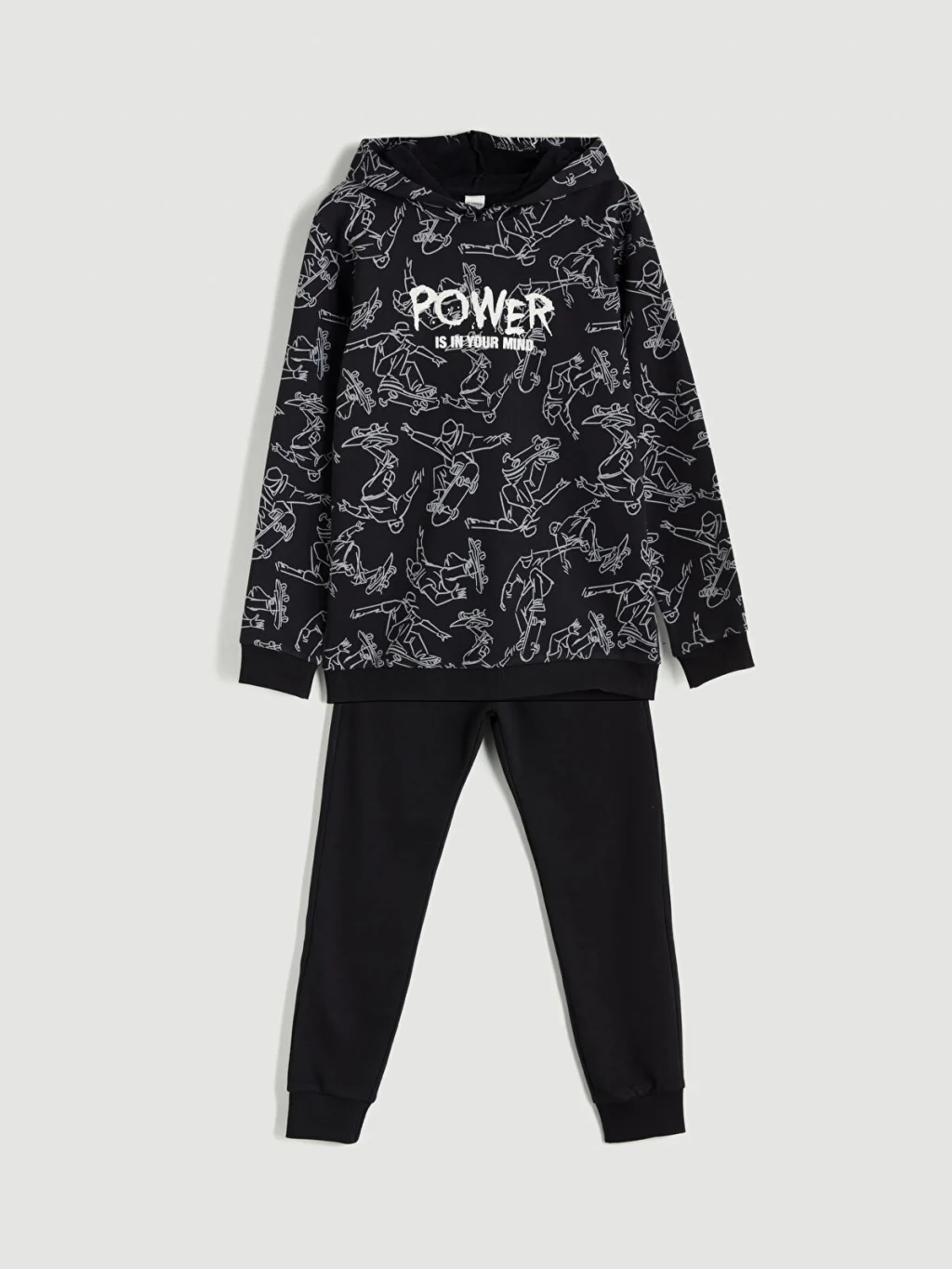 Baskılı erkek çocuk eşofman takımı, 3 iplik kumaştan üretilmiştir. Üstü kapüşonlu, altı lastiklidir.