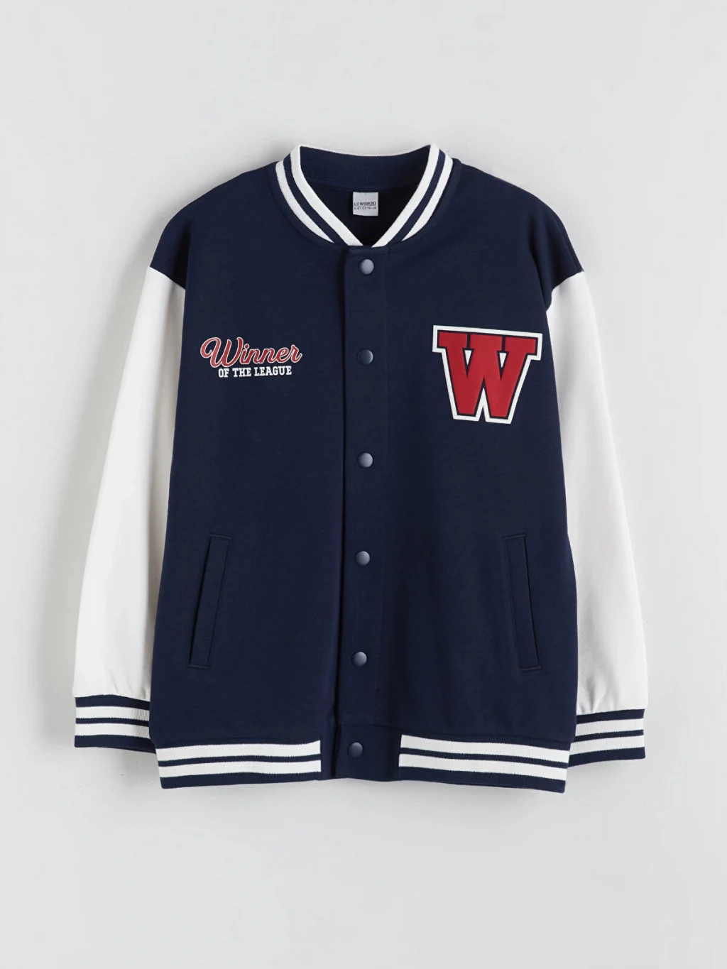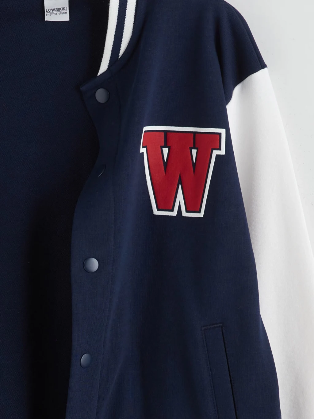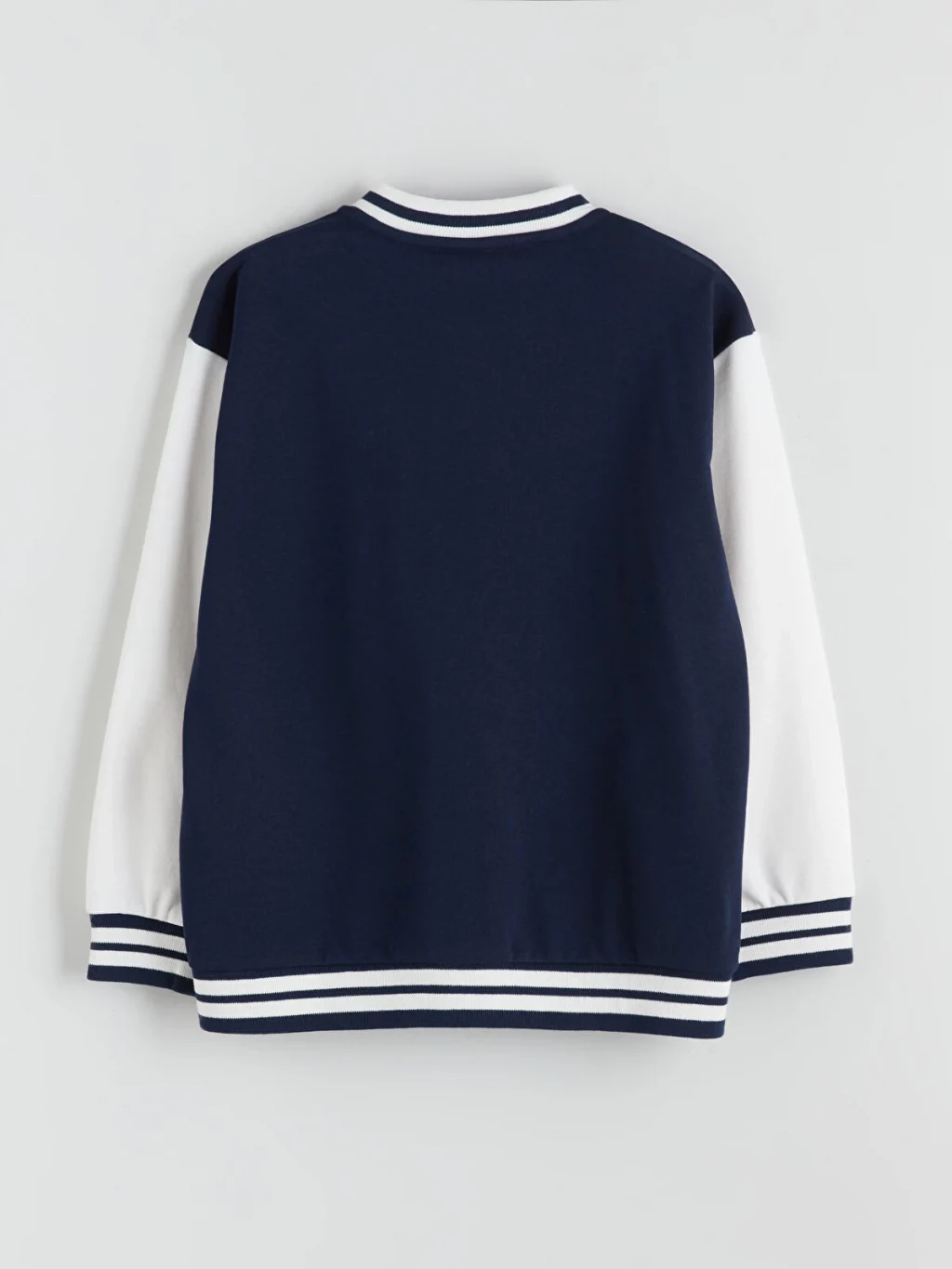 Kolej yakalı erkek çocuk sweatshirt, kalın 3 iplik kumaştan üretilmiştir. Önden çıtçıt kapamalıdır, göğsünde işleme ve yan cepleri bulunur. Yaka, manşet ve etek ucu şeritlidir.