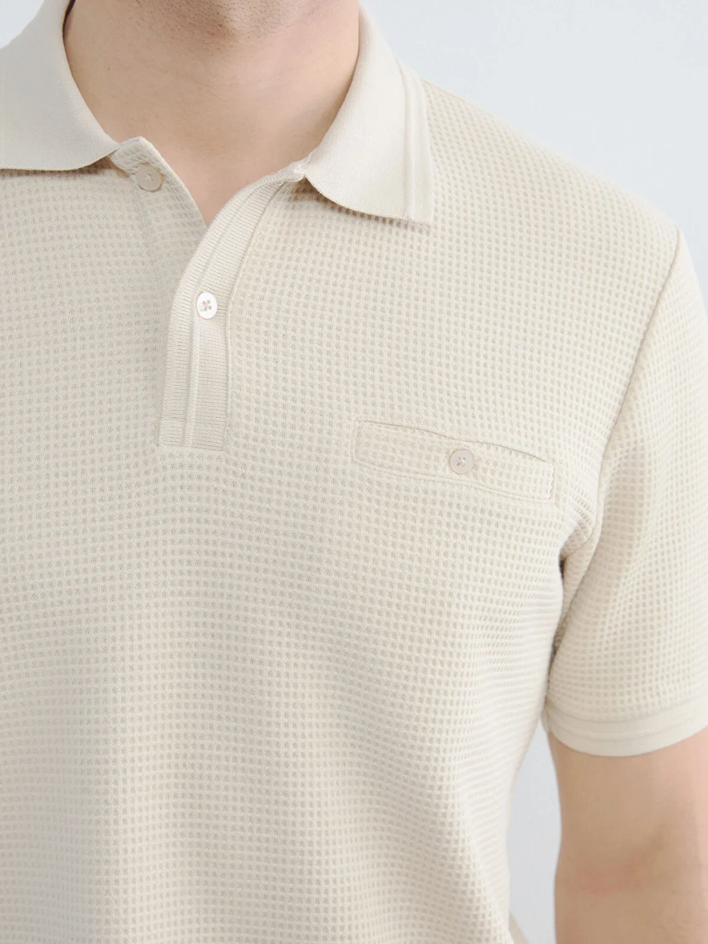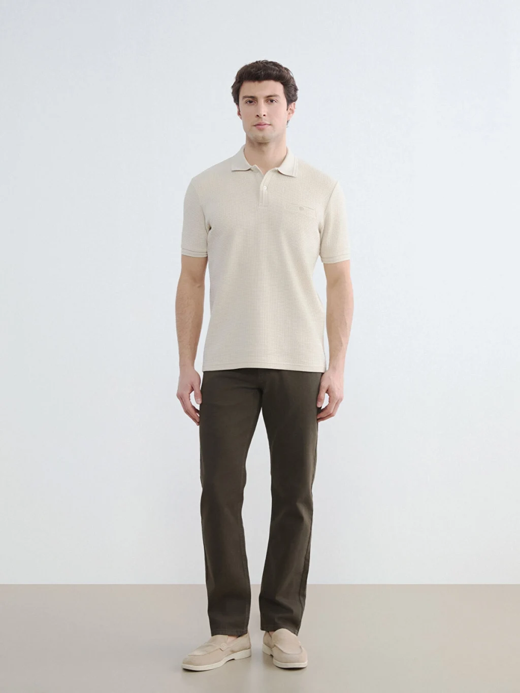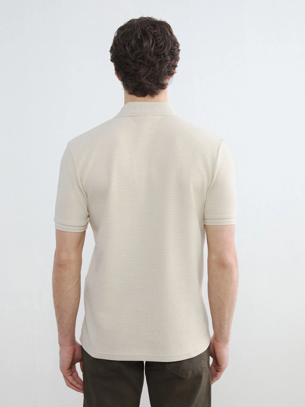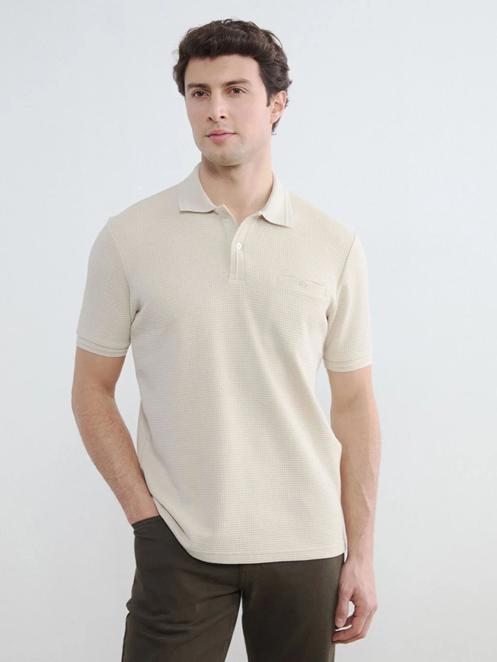 Standart kalıplı, polo yakalı erkek tişört, strüktürlü kumaştan üretilmiştir. Kısa kollu, düğme kapamalı ve göğüs ceplidir.