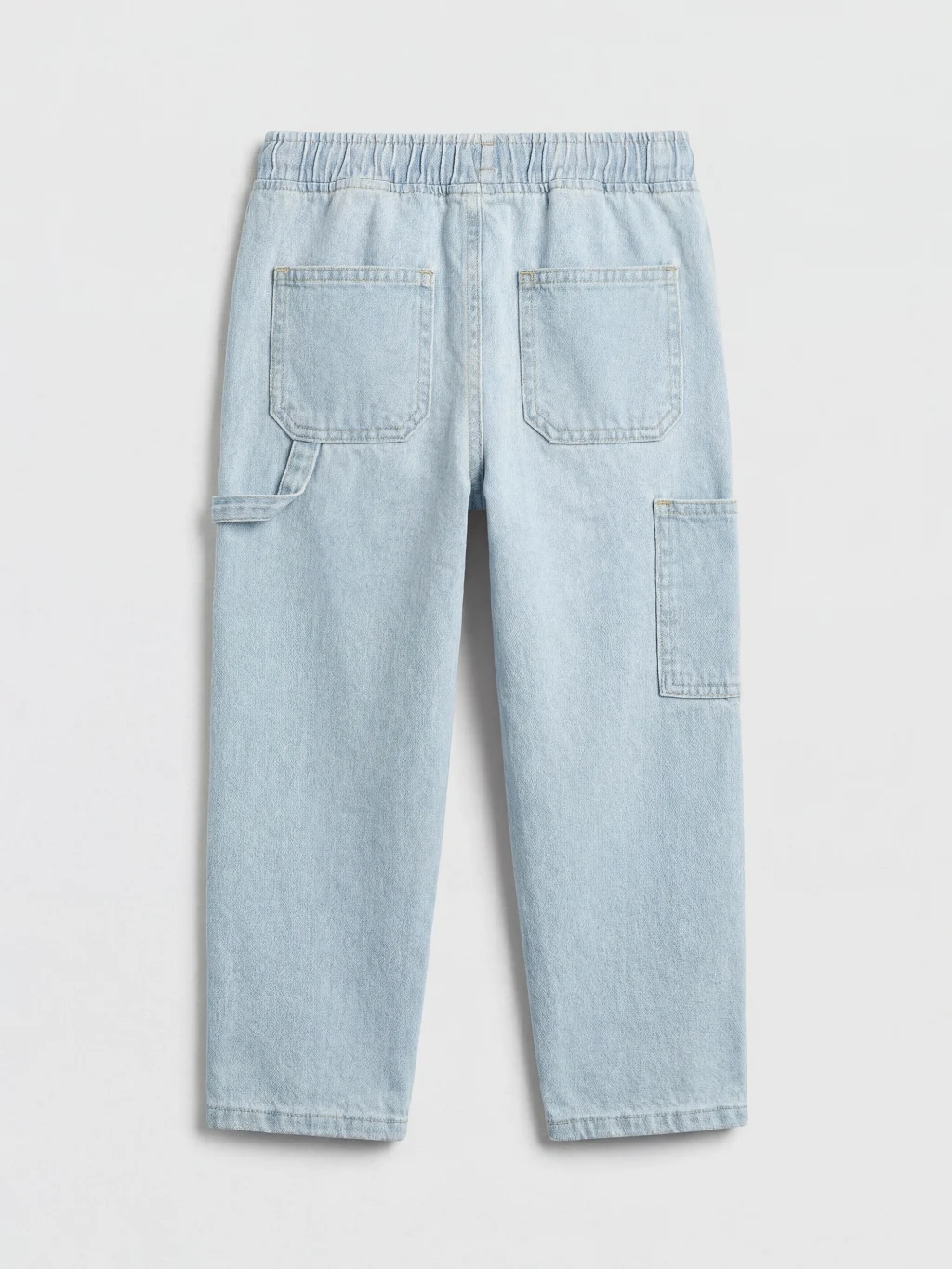 Beli lastikli ve ayarlanabilir bağcıklı, cepli erkek çocuk jean pantolon, %100 pamuklu kumaştan üretilmiştir.
