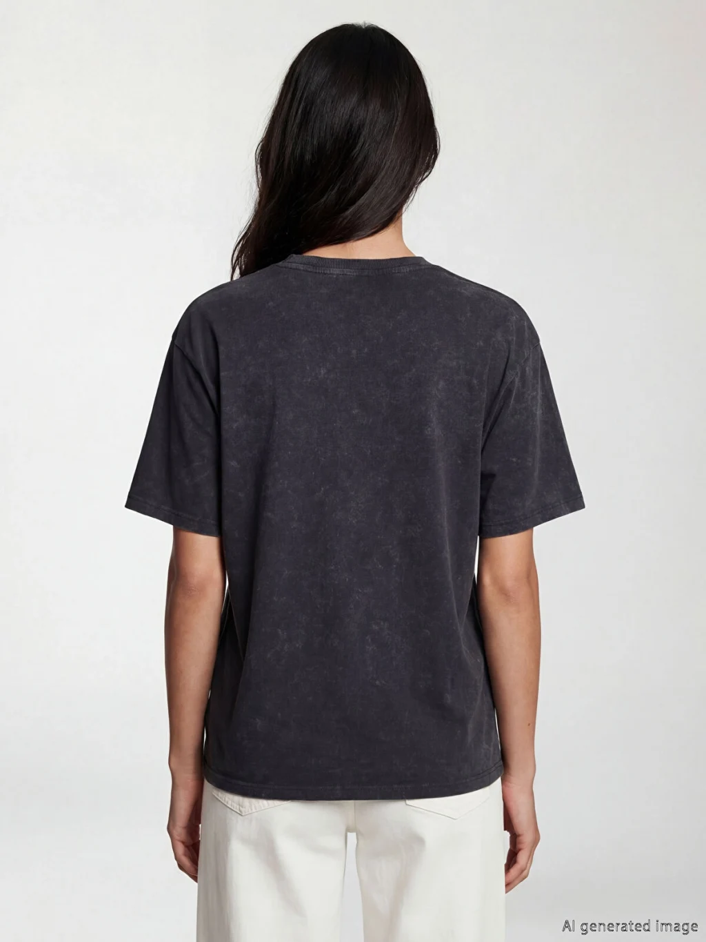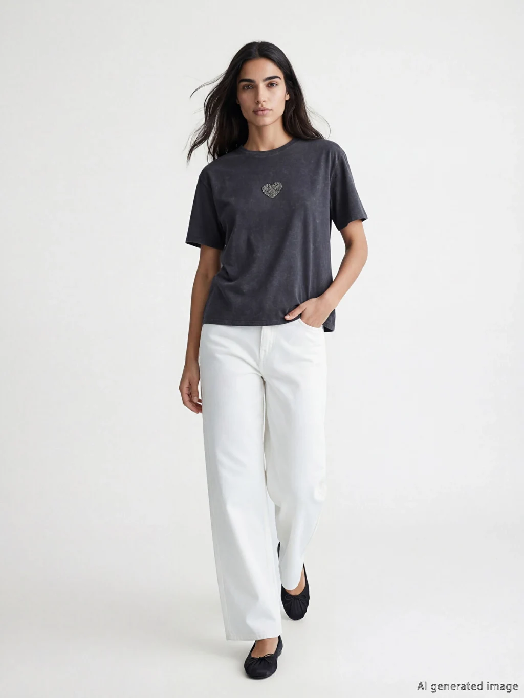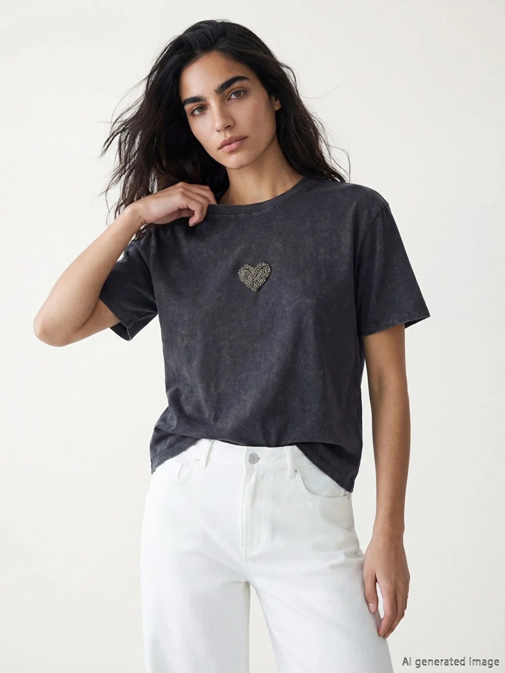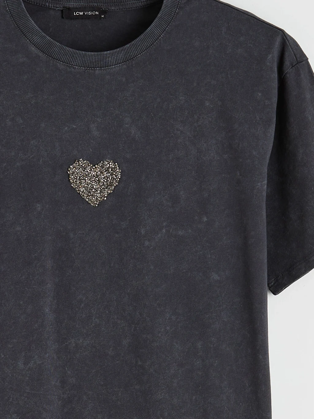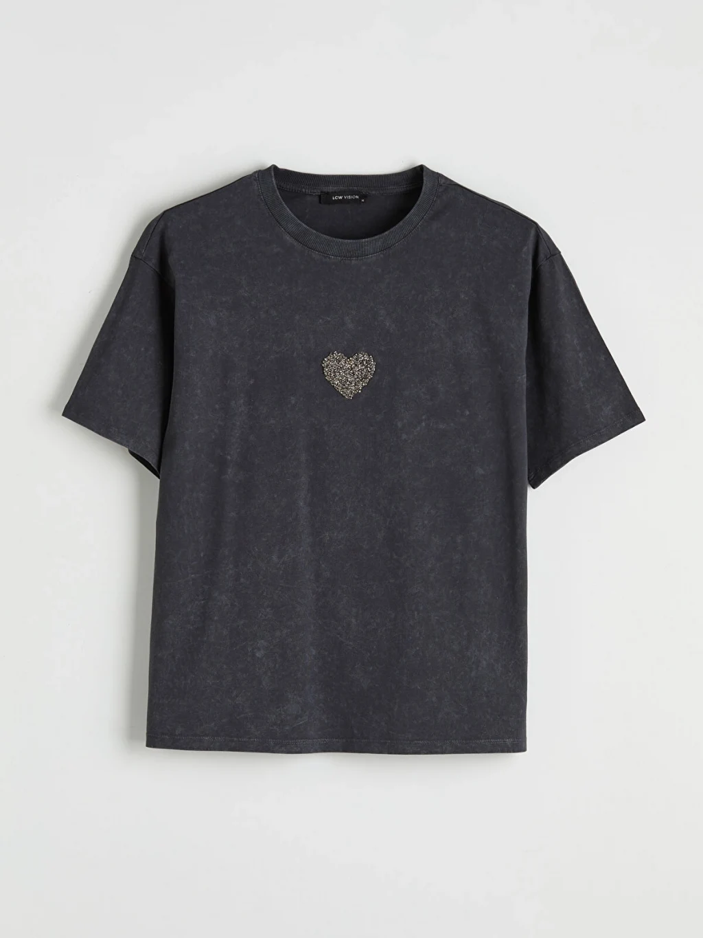 Kadın tişört, %100 pamuklu kumaştan üretilmiştir. Bisiklet yaka, kısa kollu ve bol kalıplıdır. Önü kalp şeklinde taş işlemelidir.