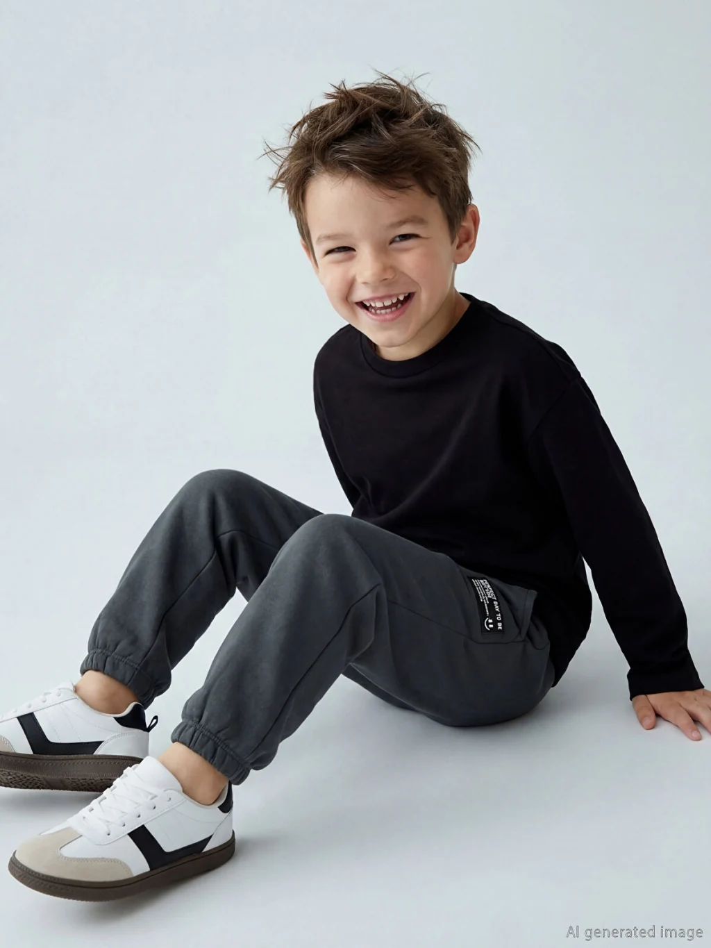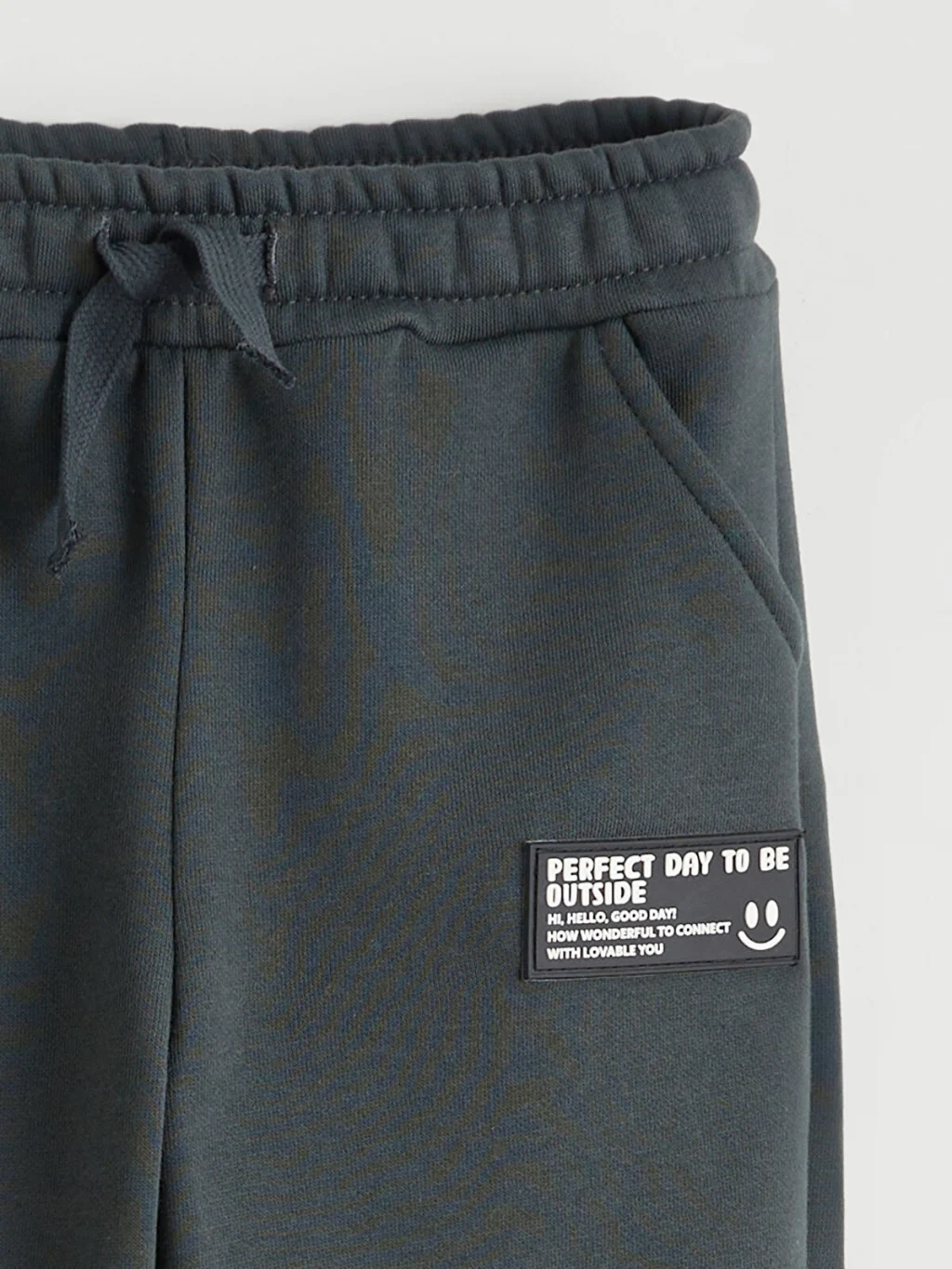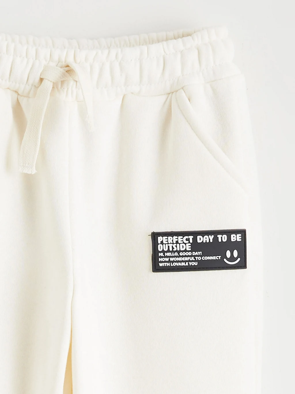 Beli lastikli ve ayarlanabilir bağcıklı erkek çocuk eşofman altı. Paçaları lastiklidir, yan cepleri ve önünde etiket detayı bulunur.