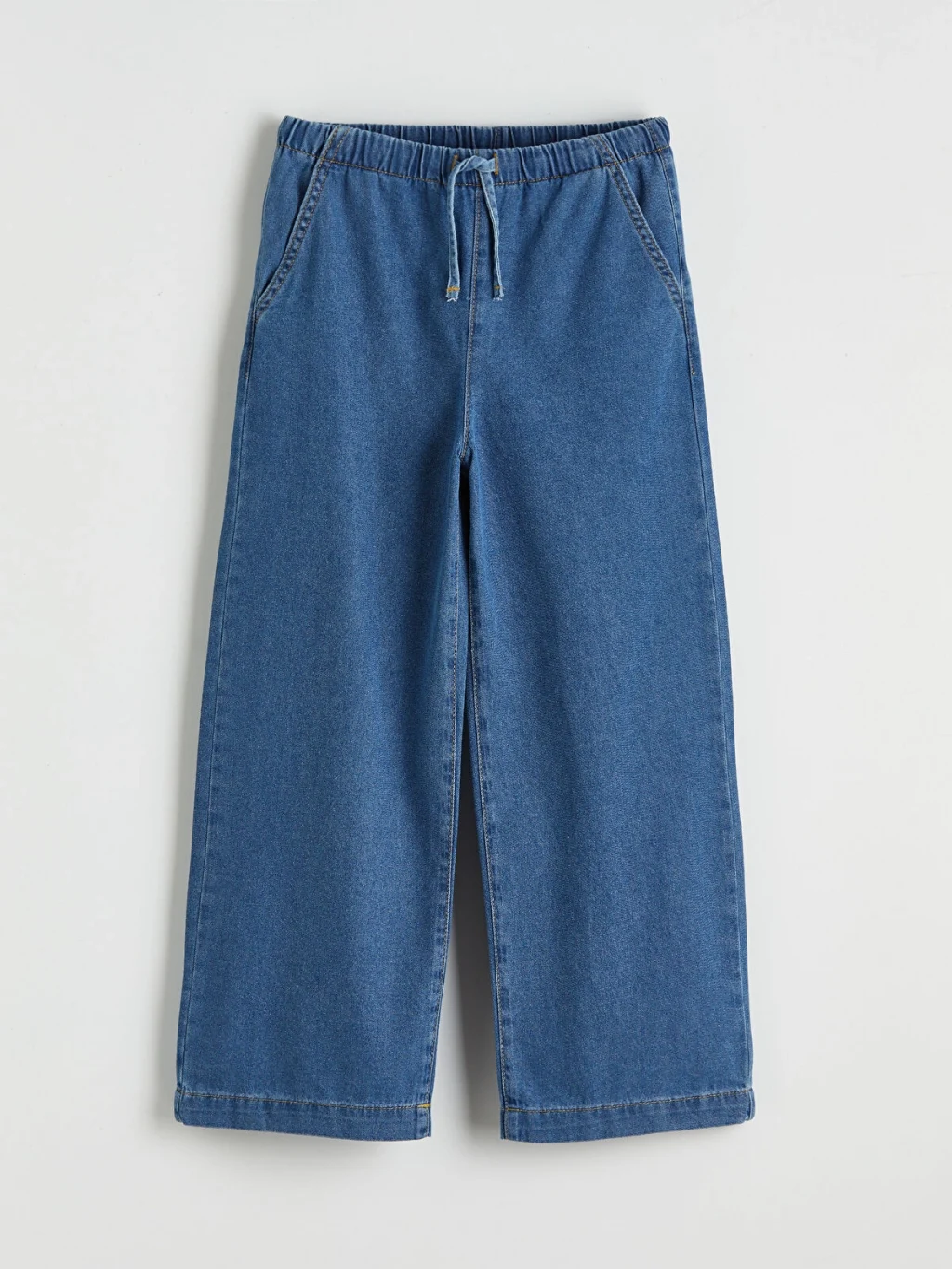Kız çocuk jean pantolon, denim kumaştan üretilmiştir, beli lastikli ve ayarlanabilir bağcıklıdır, cepli tasarıma sahiptir.