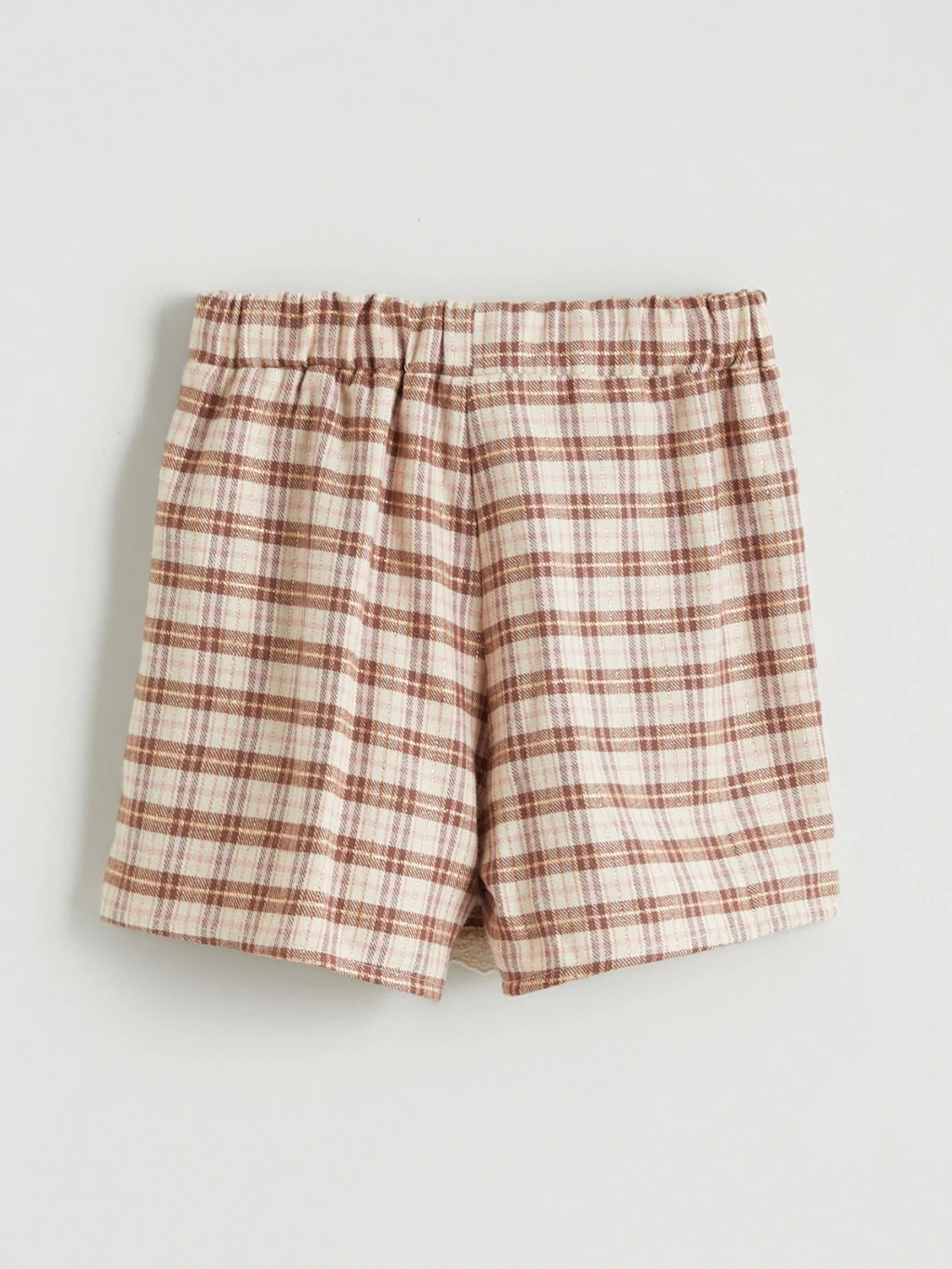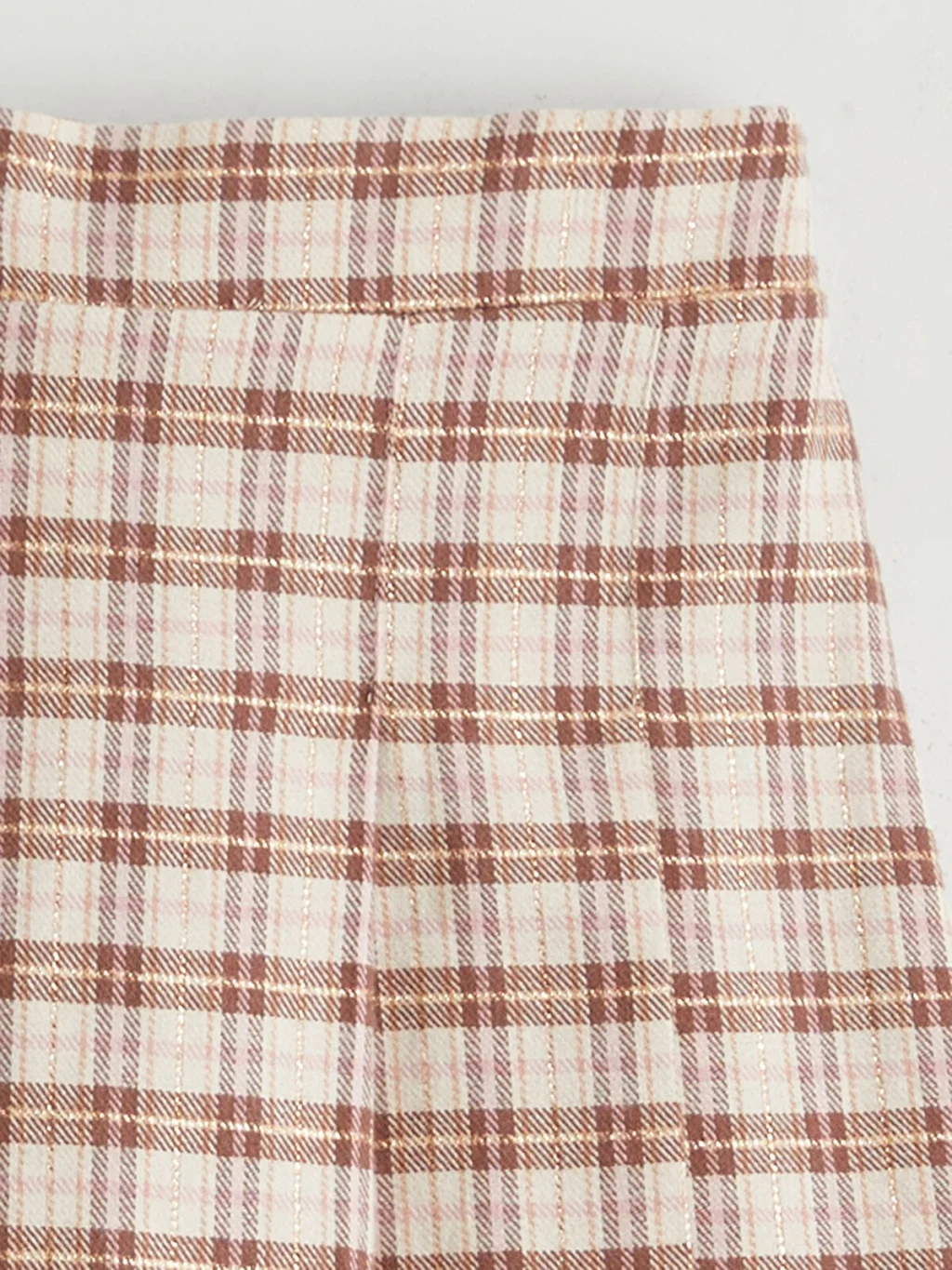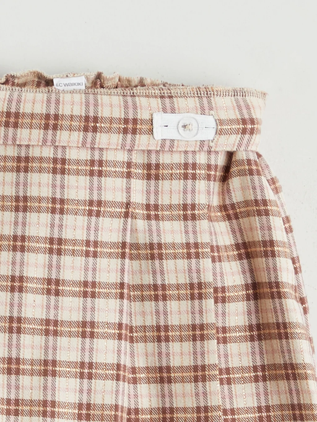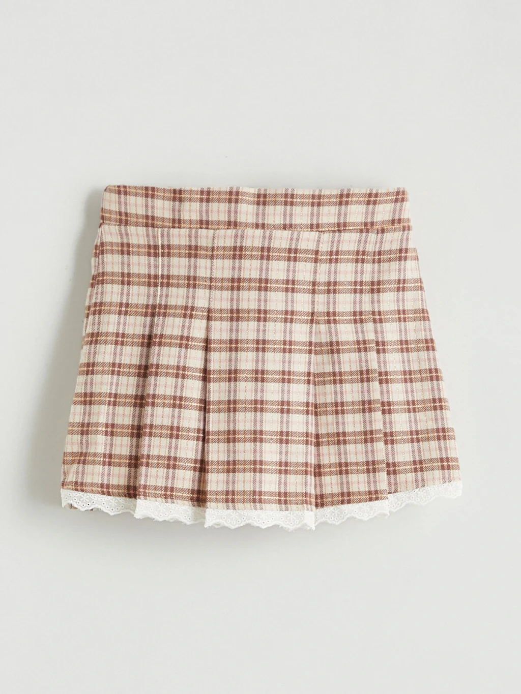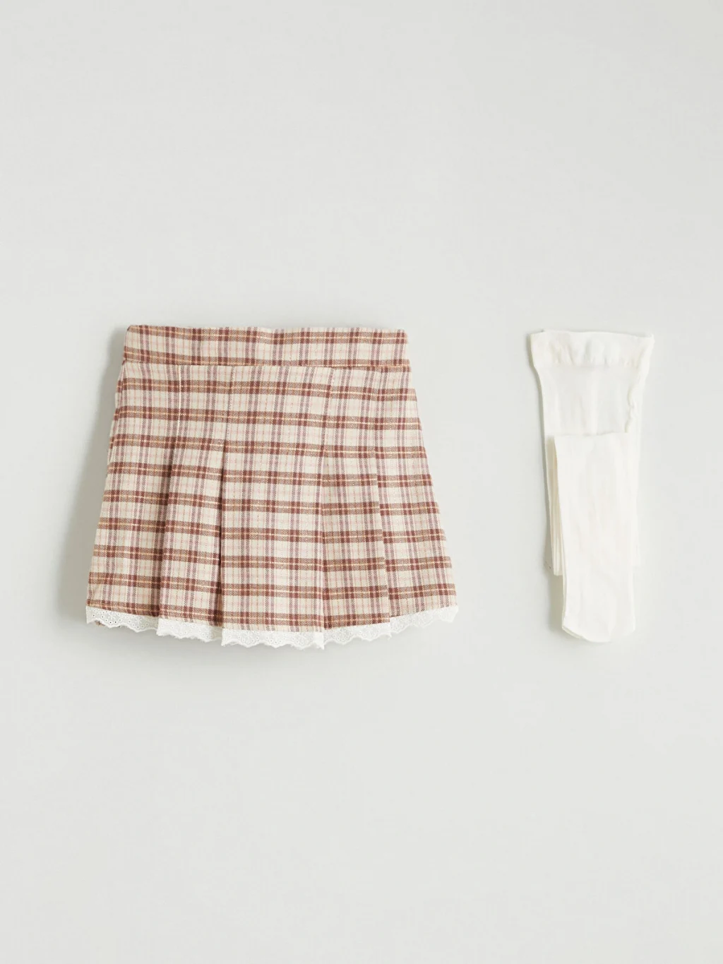 Beli lastikli, ekose desenli kız çocuk etek, pileli tasarıma sahiptir. Etek ucu dantel detaylıdır. Külotlu çorap dahildir.