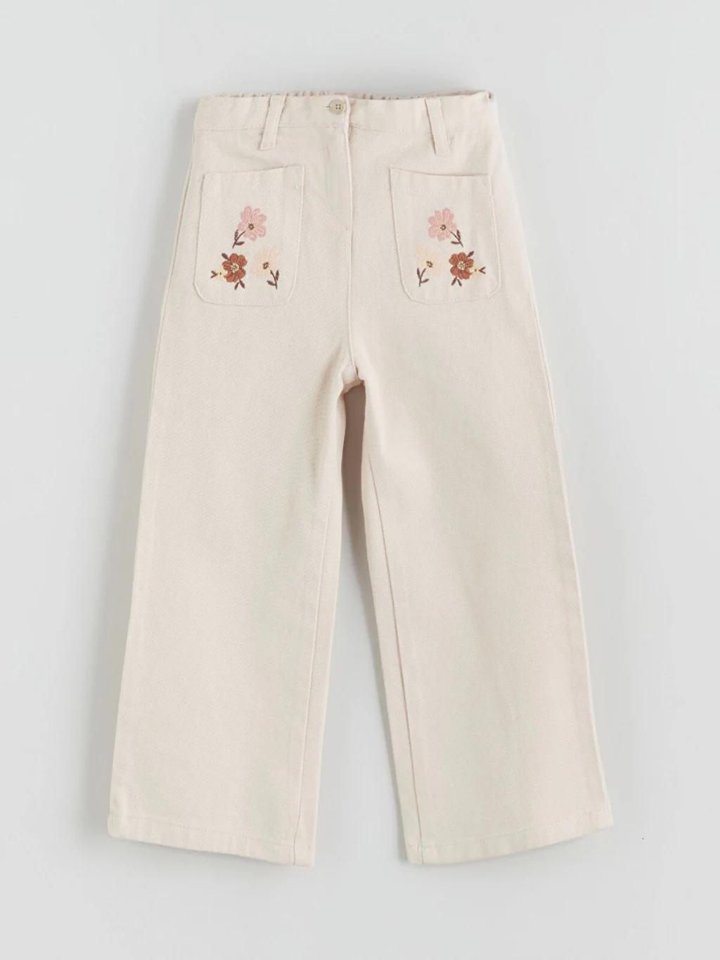 Standart kalıplı kız bebek pantolon, beli tamamen lastiklidir ve düz inen geniş paça kesimiyle tasarlanmıştır. Standart kalıplı, beli lastikli ve geniş paçalı kız çocuk pantolon, düz ve desensiz kumaşa sahiptir.