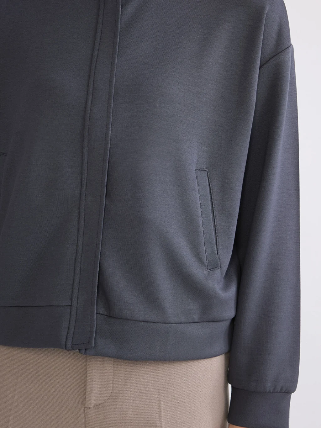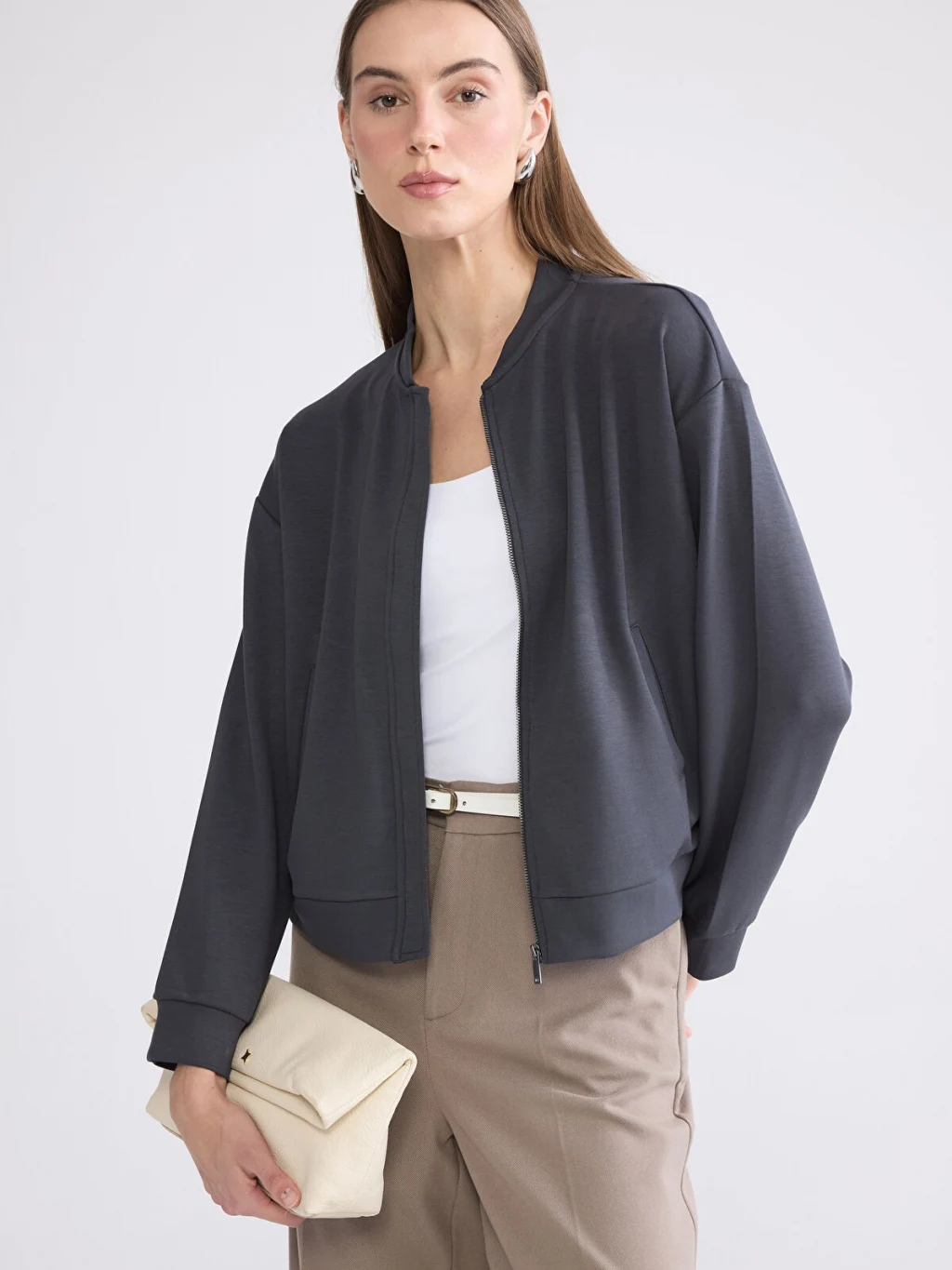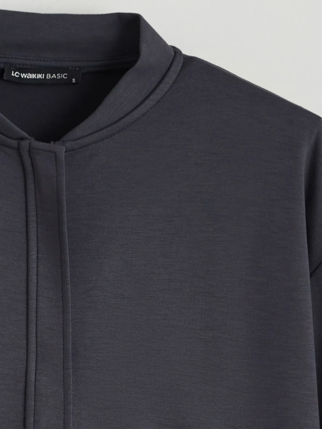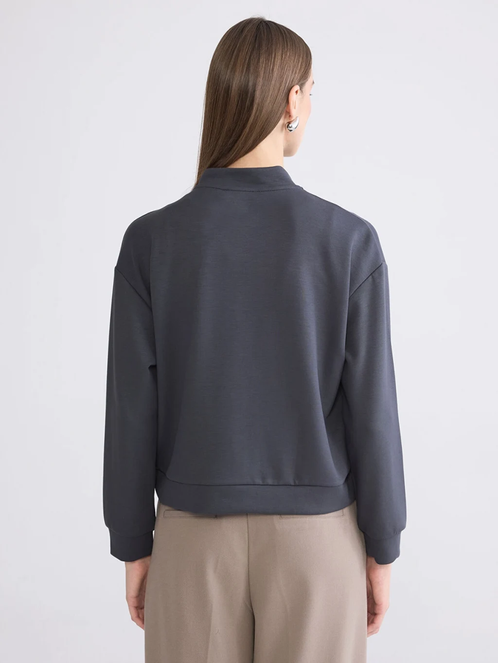 Kolej yakalı, uzun kollu kadın sweatshirt, önden gizli fermuar kapamalıdır. Yan cepleri bulunur ve manşetleri ile etek ucu ribanalıdır.